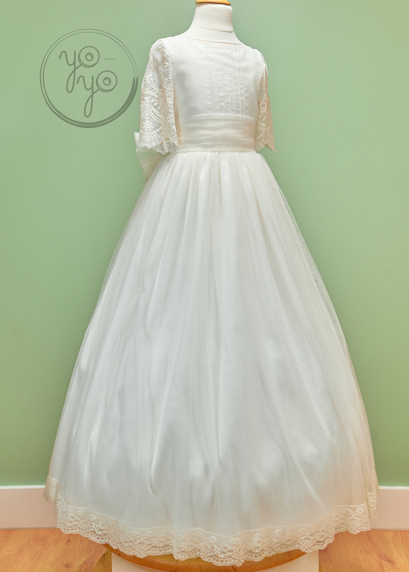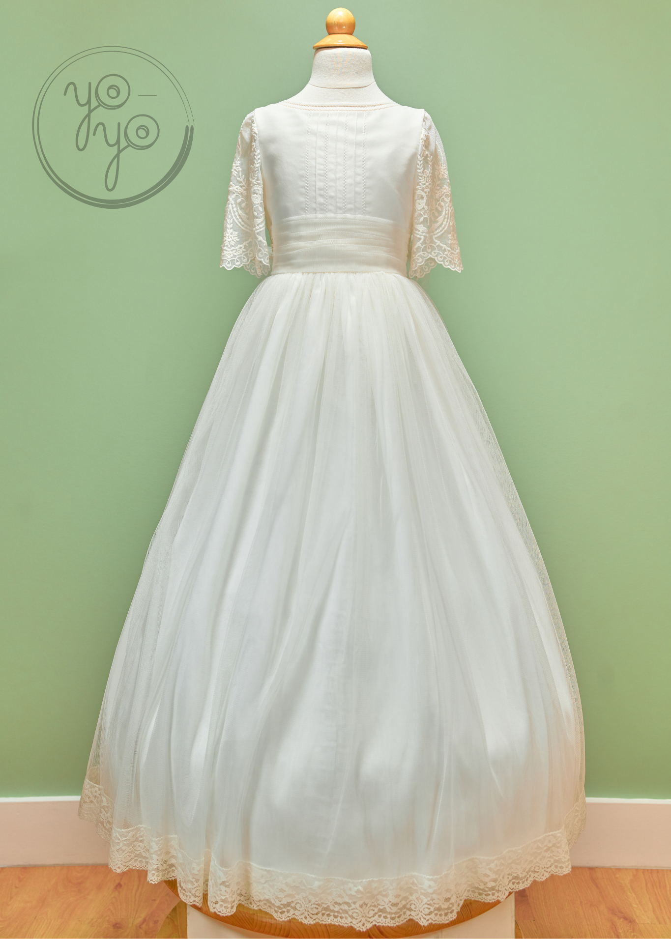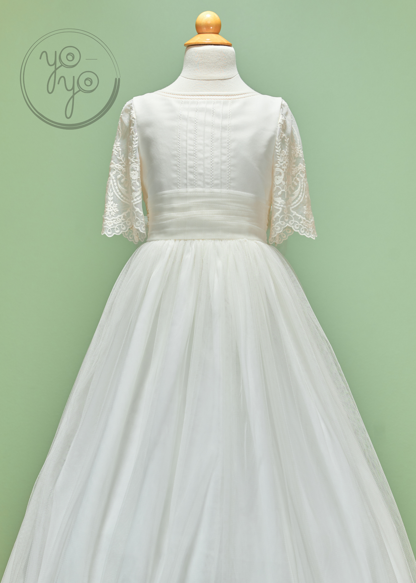 The skirt is crafted in airy tulle, finished with a lace border along the hemline for refinement and movement. Covered buttons down the back complete the look, making Melisa an unforgettable choice for a First Communion filled with elegance and meaning.