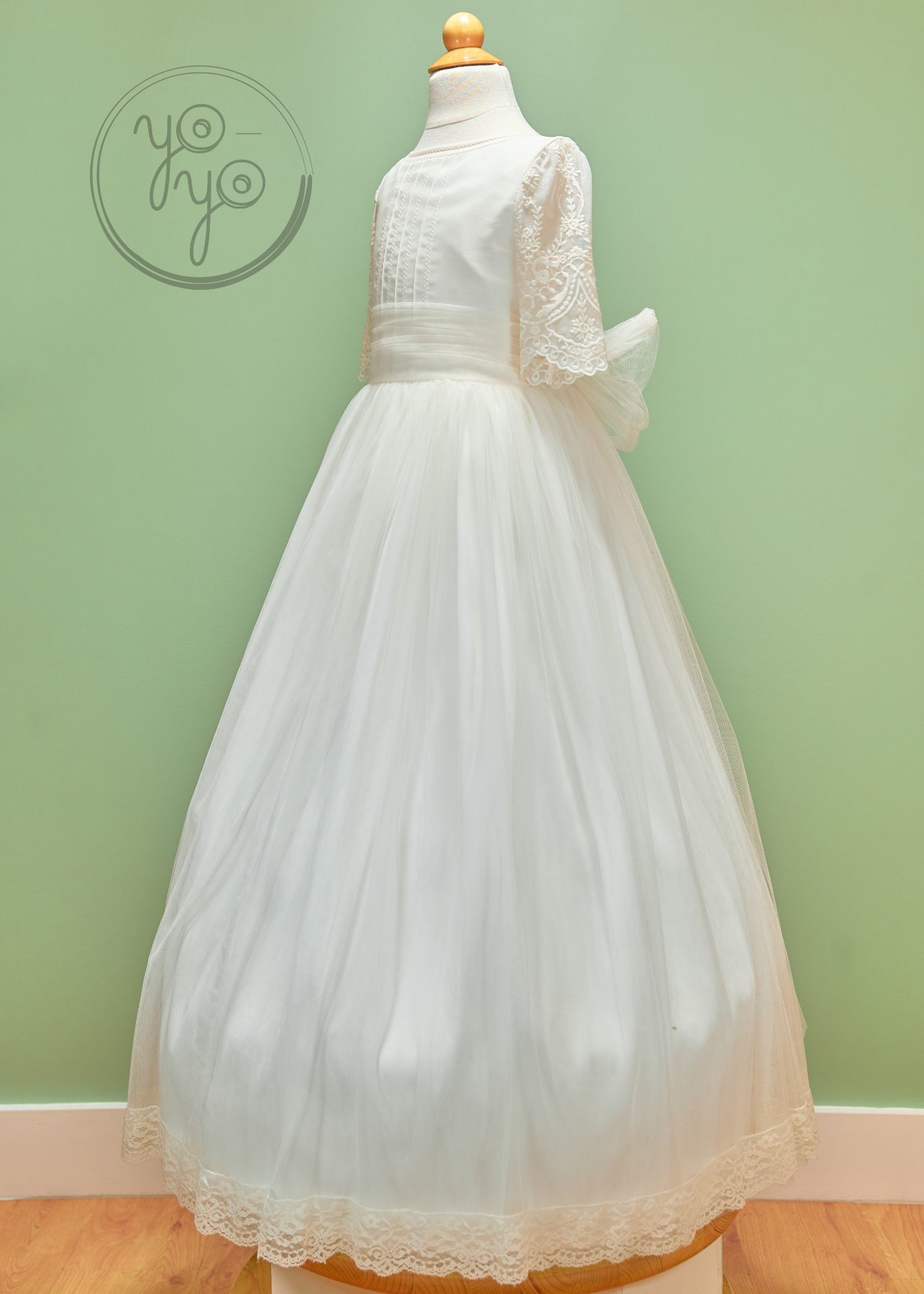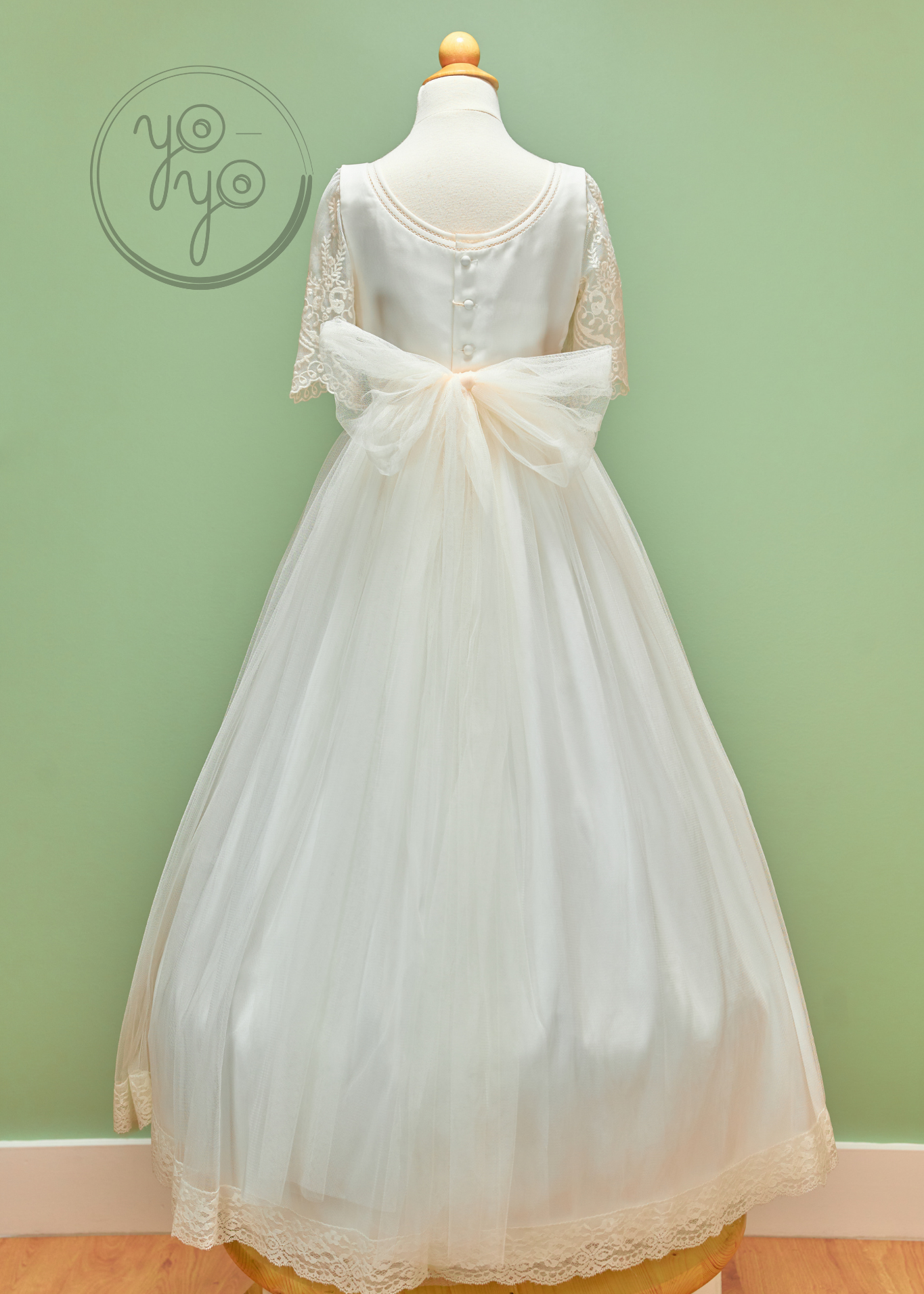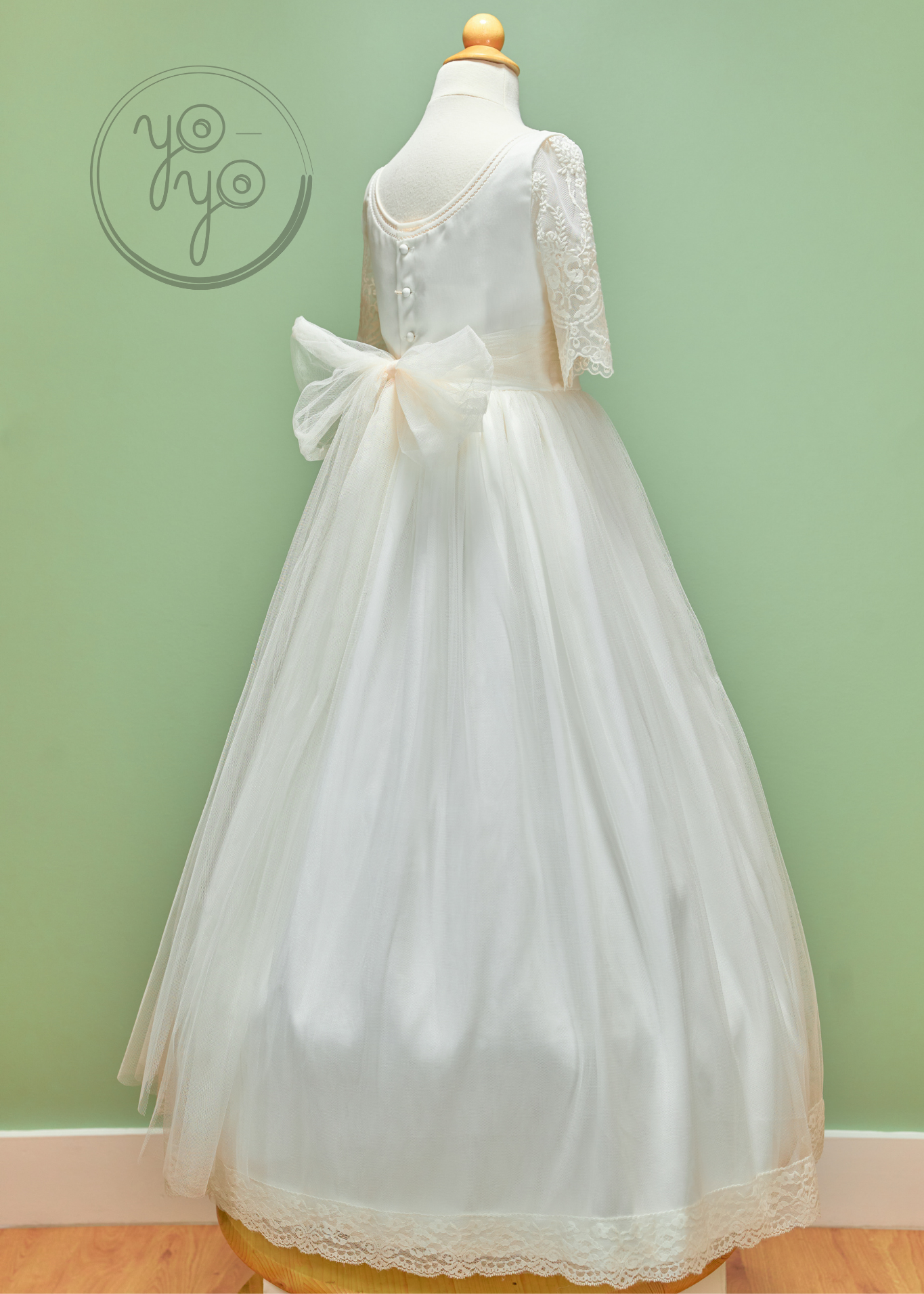The skirt is crafted in airy tulle, finished with a lace border along the hemline for refinement and movement. Covered buttons down the back complete the look, making Melisa an unforgettable choice for a First Communion filled with elegance and meaning.