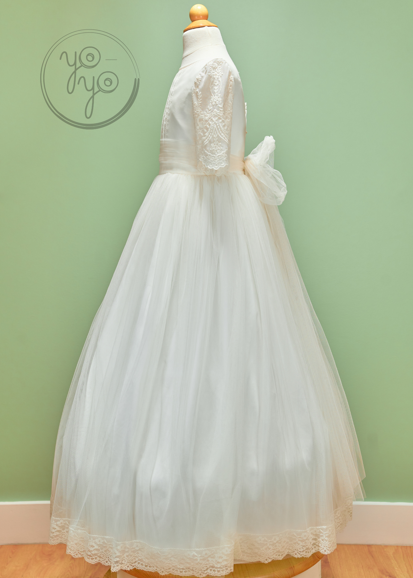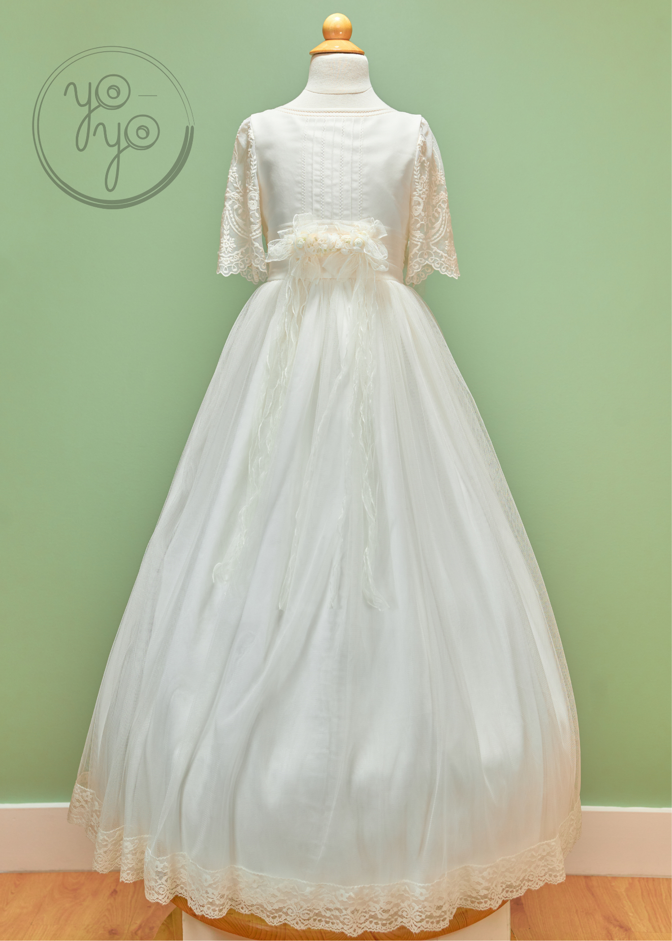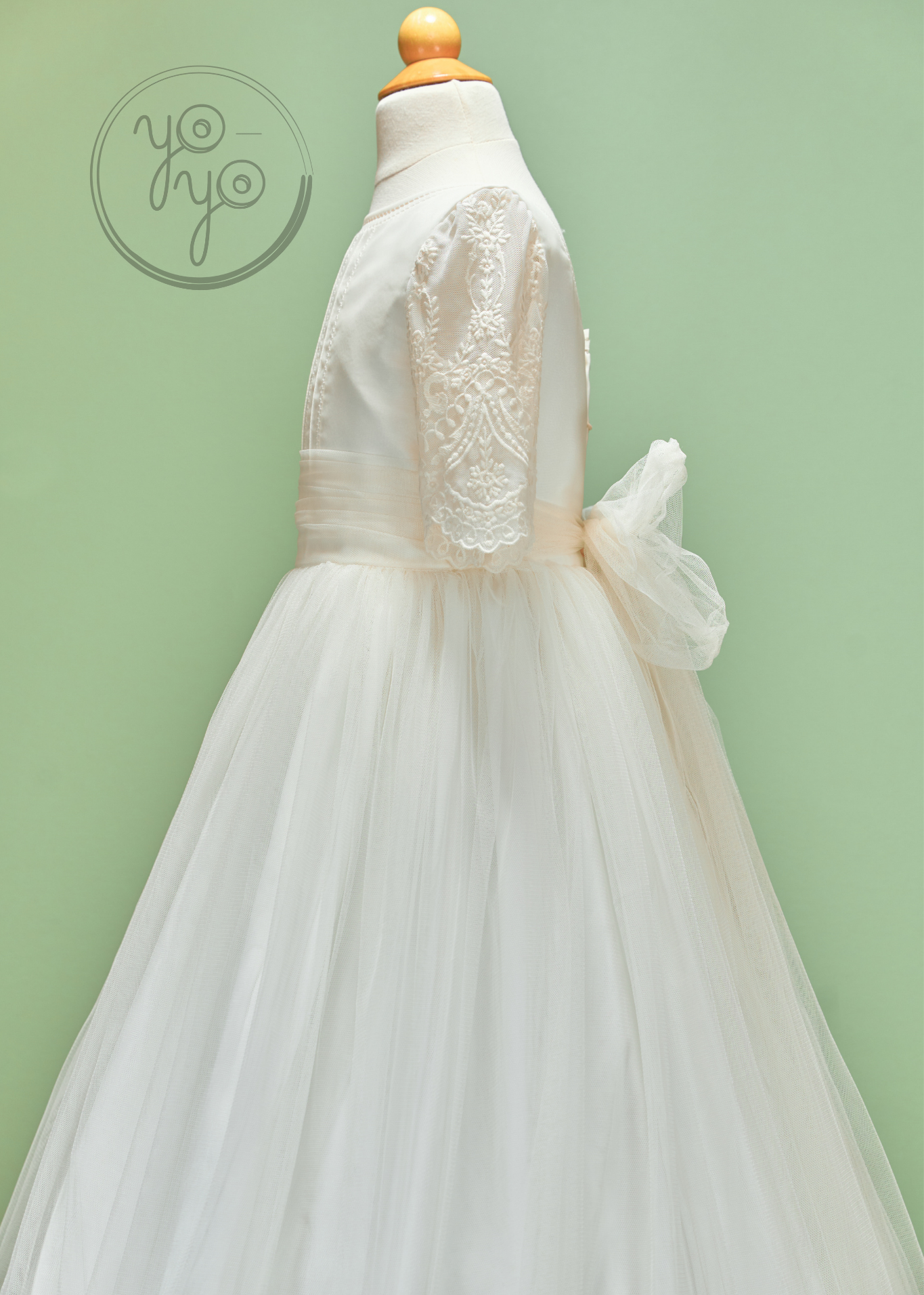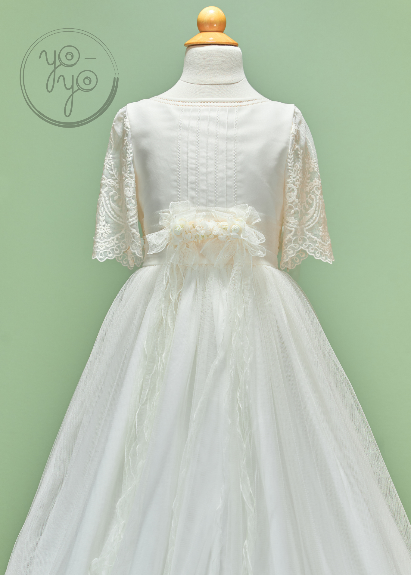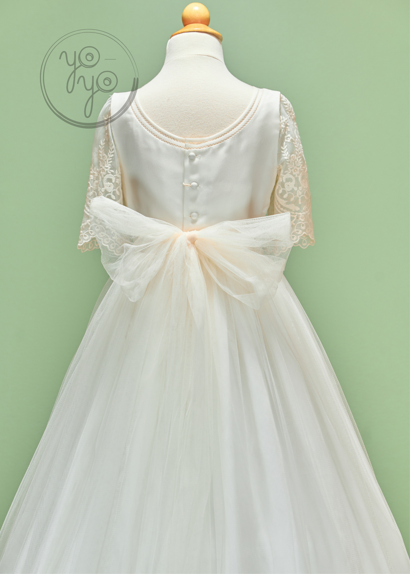 The Melisa First Communion Dress is a graceful hybrid design, blending boho charm with traditional elegance. Made in soft off-white, this gown features French sleeves in embroidered tulle that bring a romantic touch.