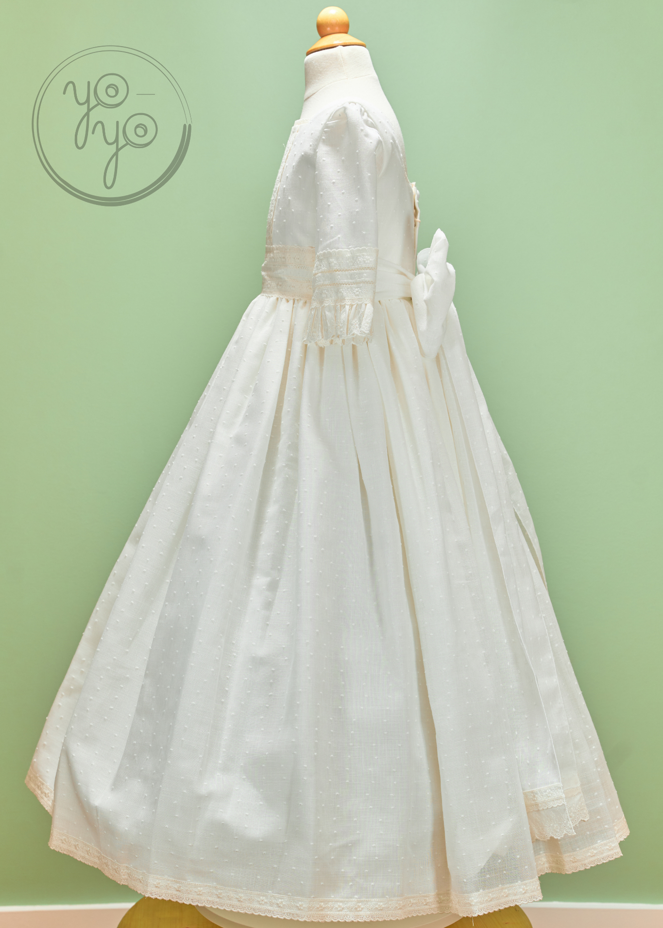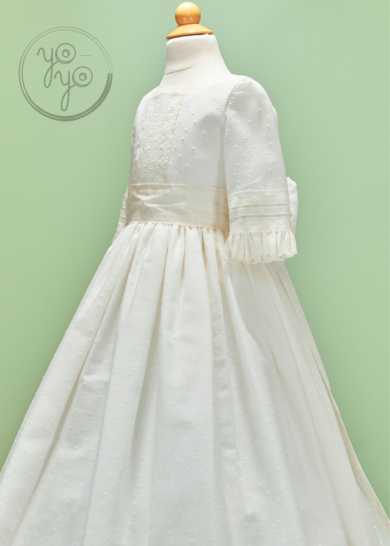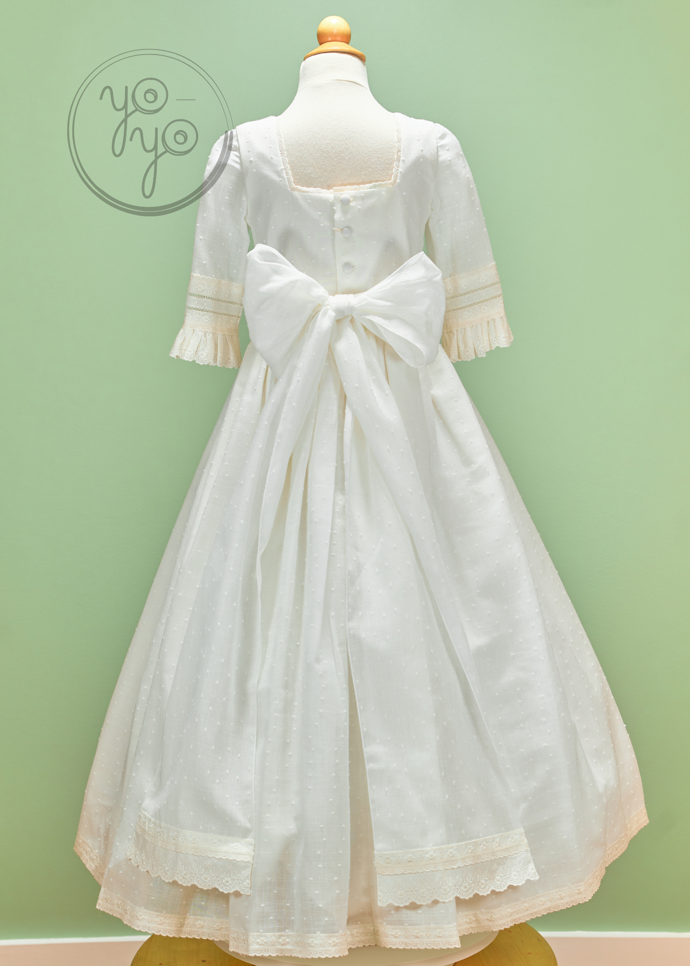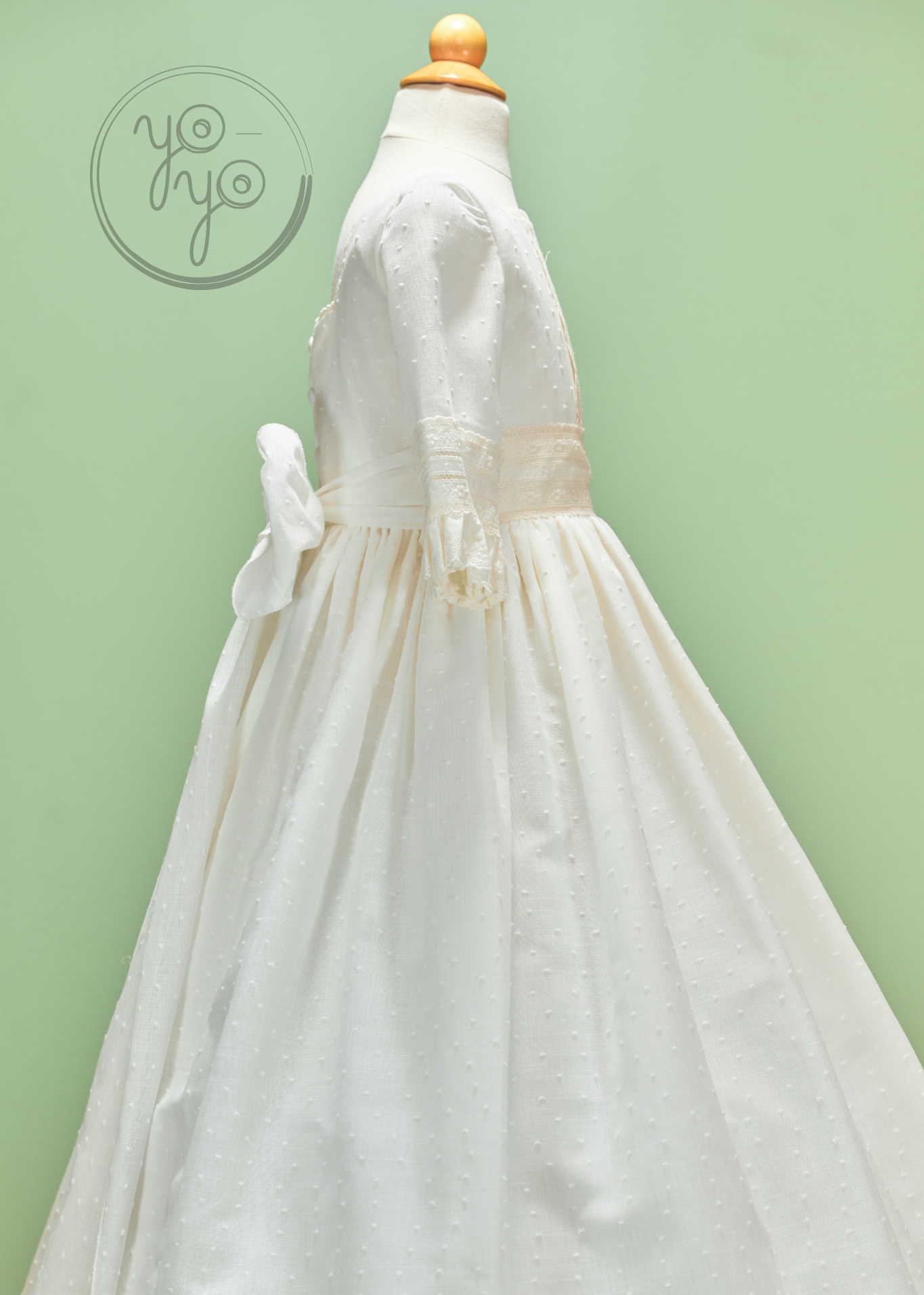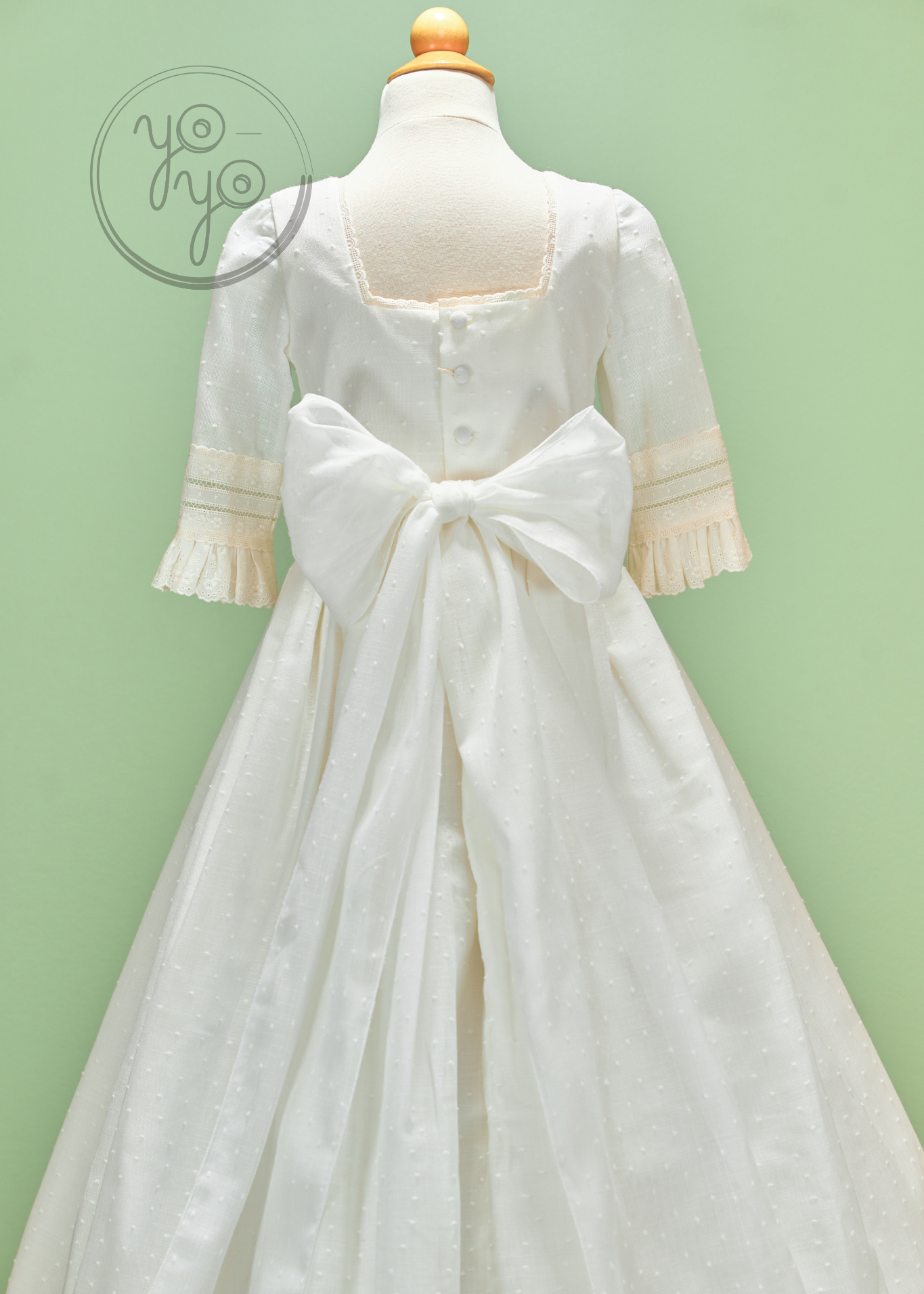 The Olivia First Communion Dress is a delicate and timeless design, blending natural fabrics with romantic detailing. Made in off-white linen with a soft plumeti texture, it has an airy, artisanal charm perfect for a meaningful day.