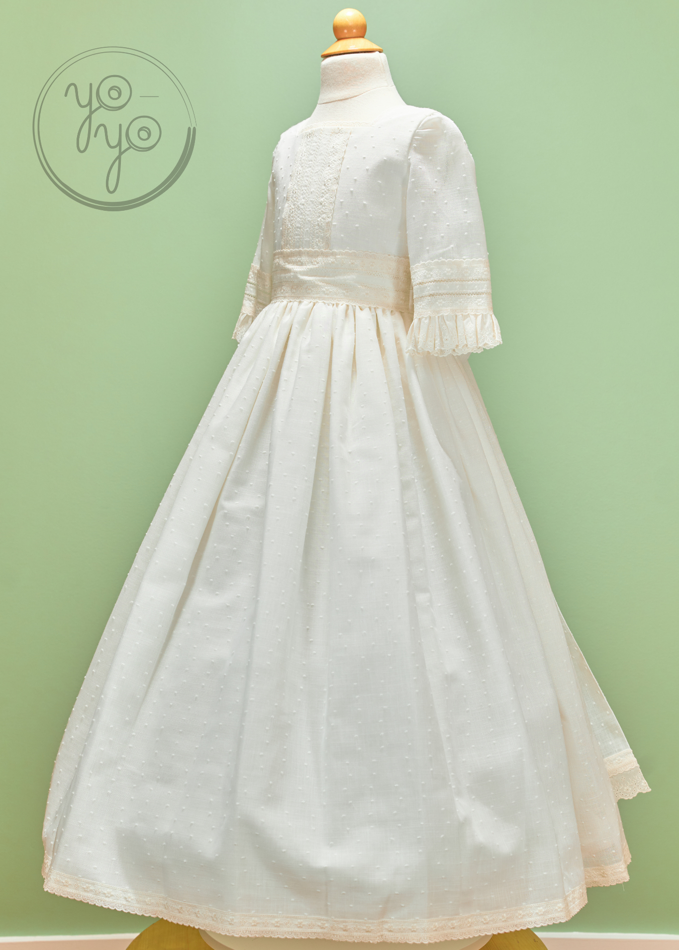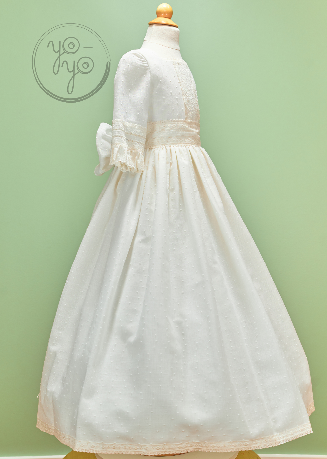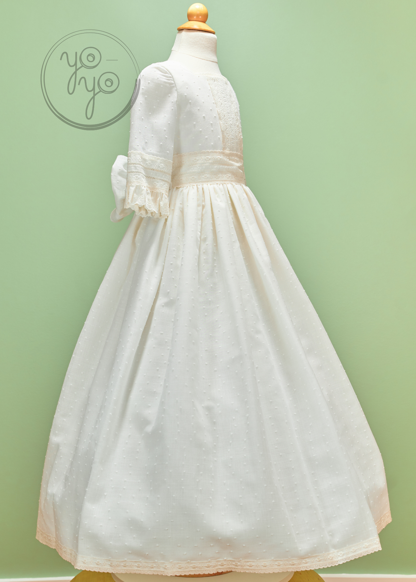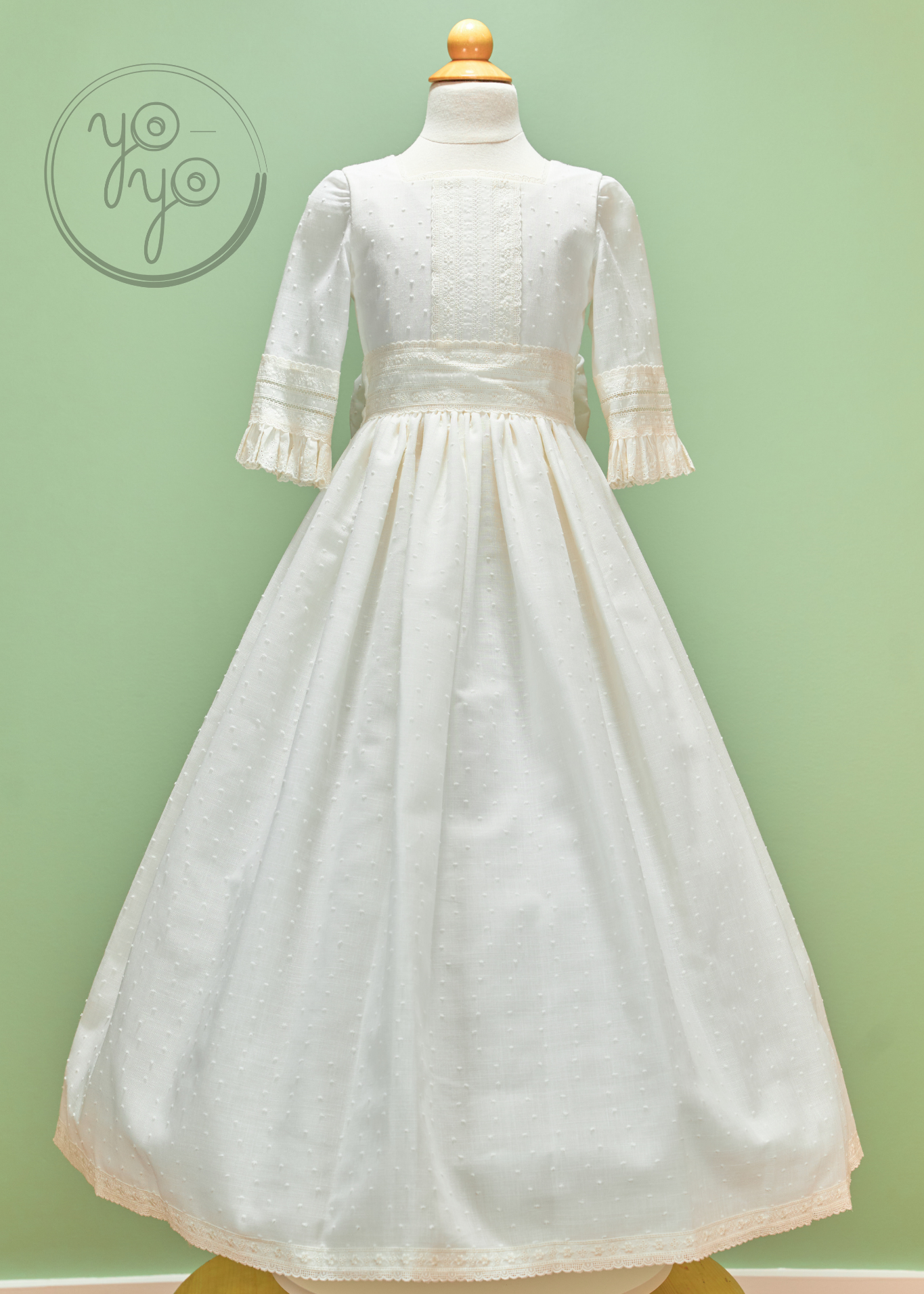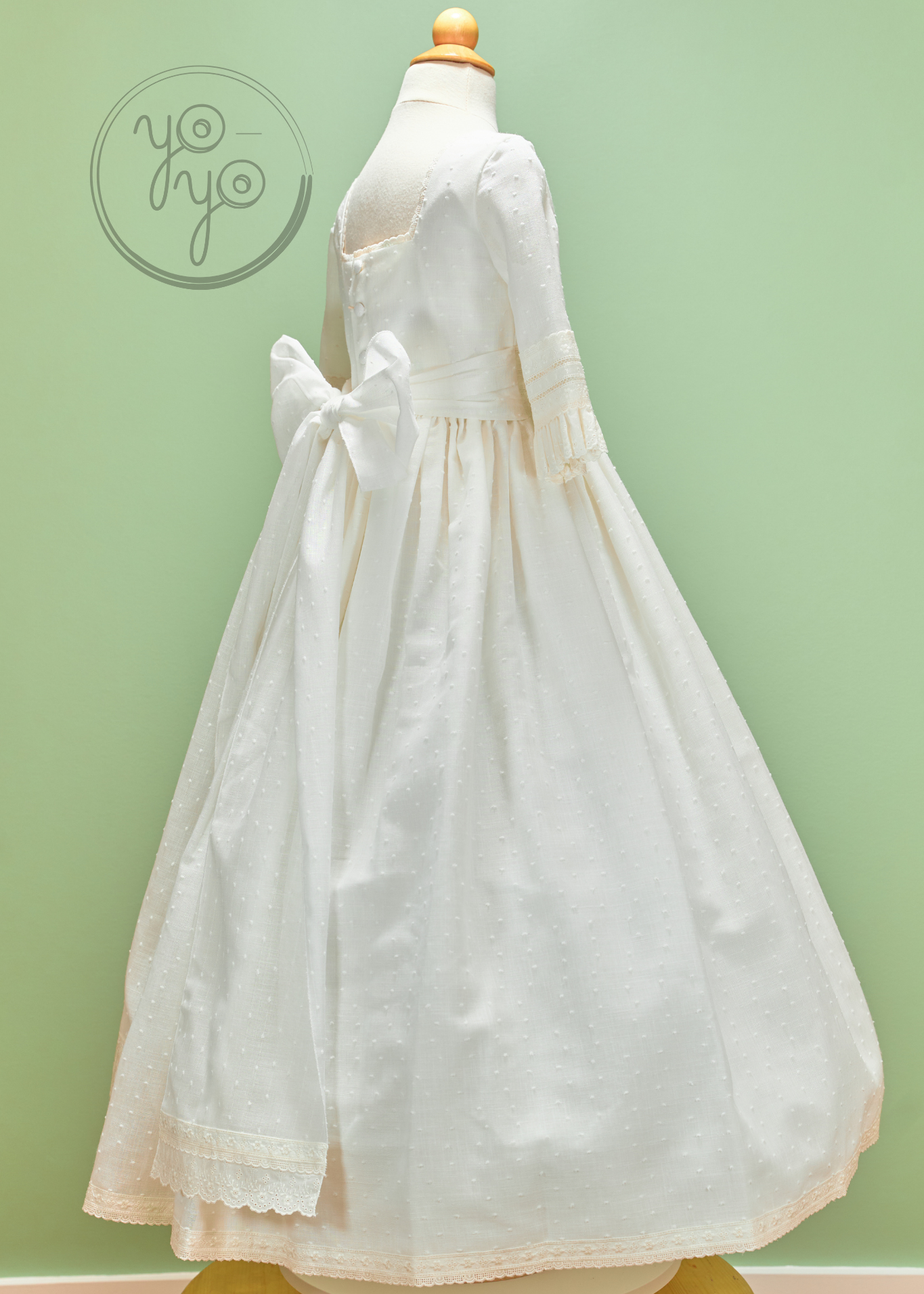 The Olivia First Communion Dress is a delicate and timeless design, blending natural fabrics with romantic detailing. Made in off-white linen with a soft plumeti texture, it has an airy, artisanal charm perfect for a meaningful day.