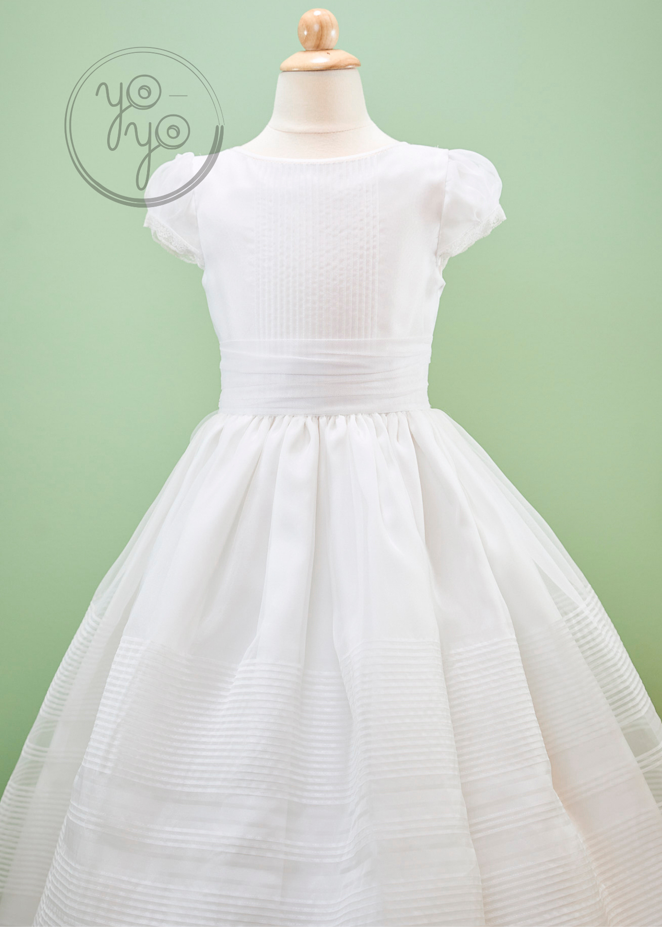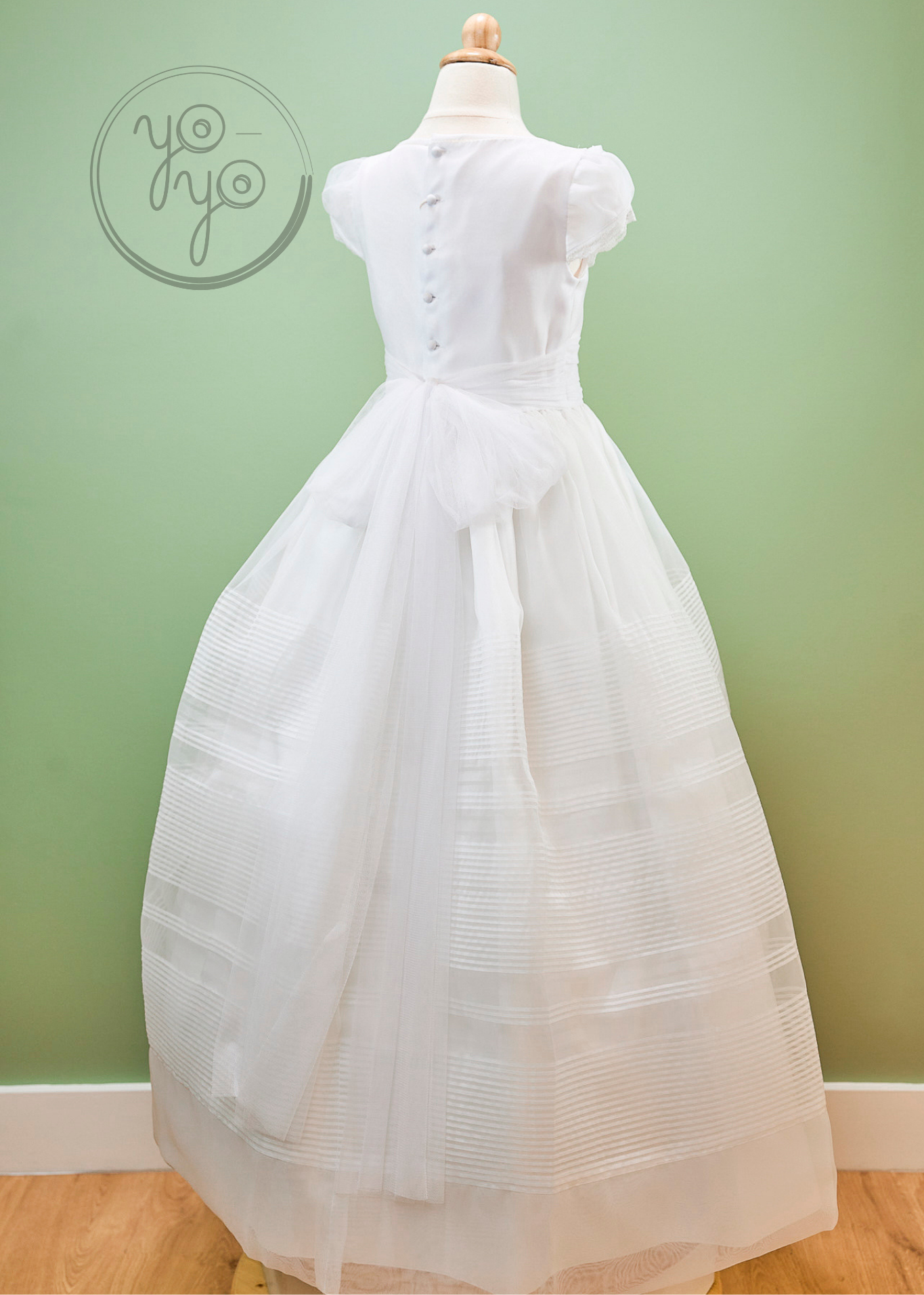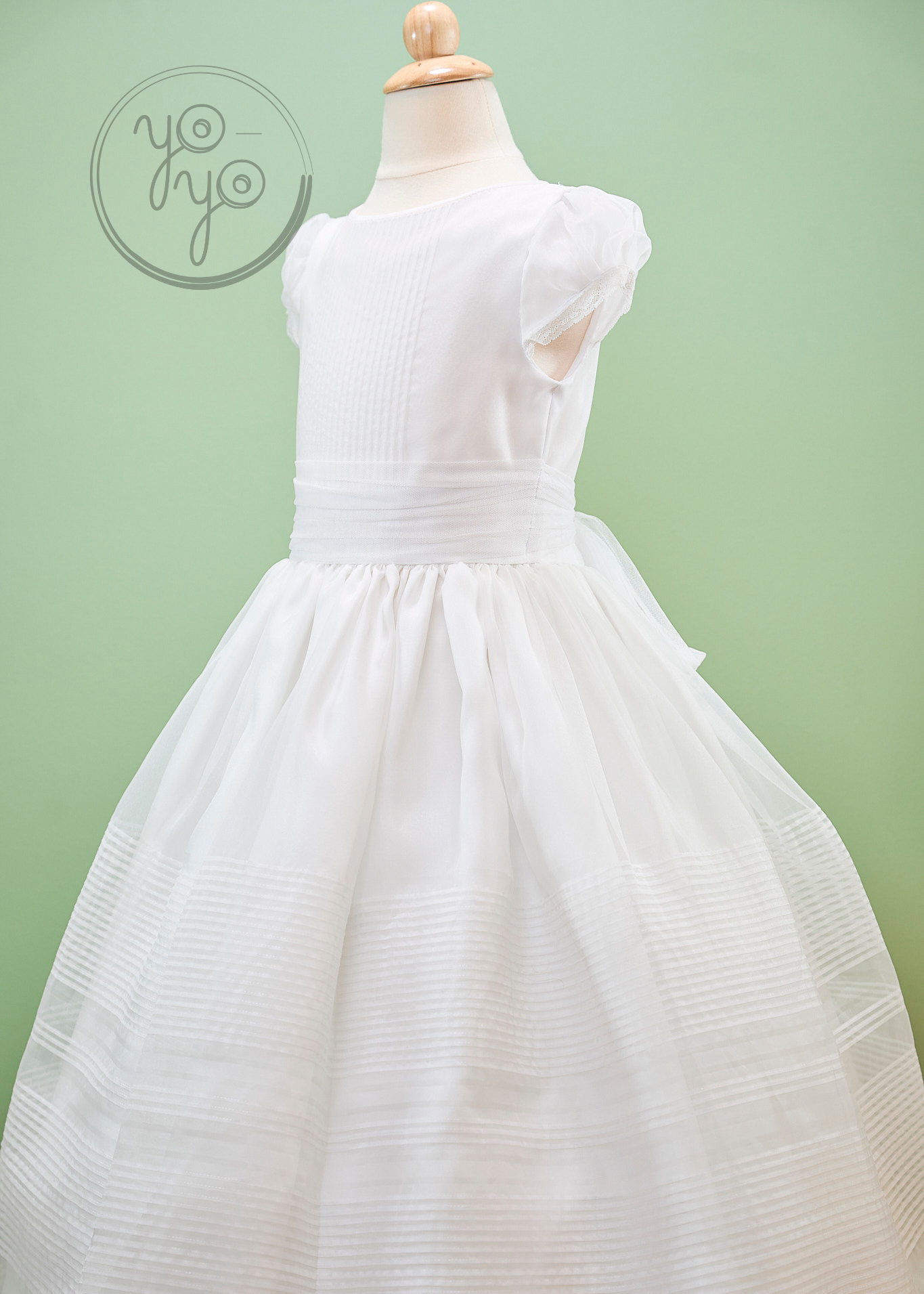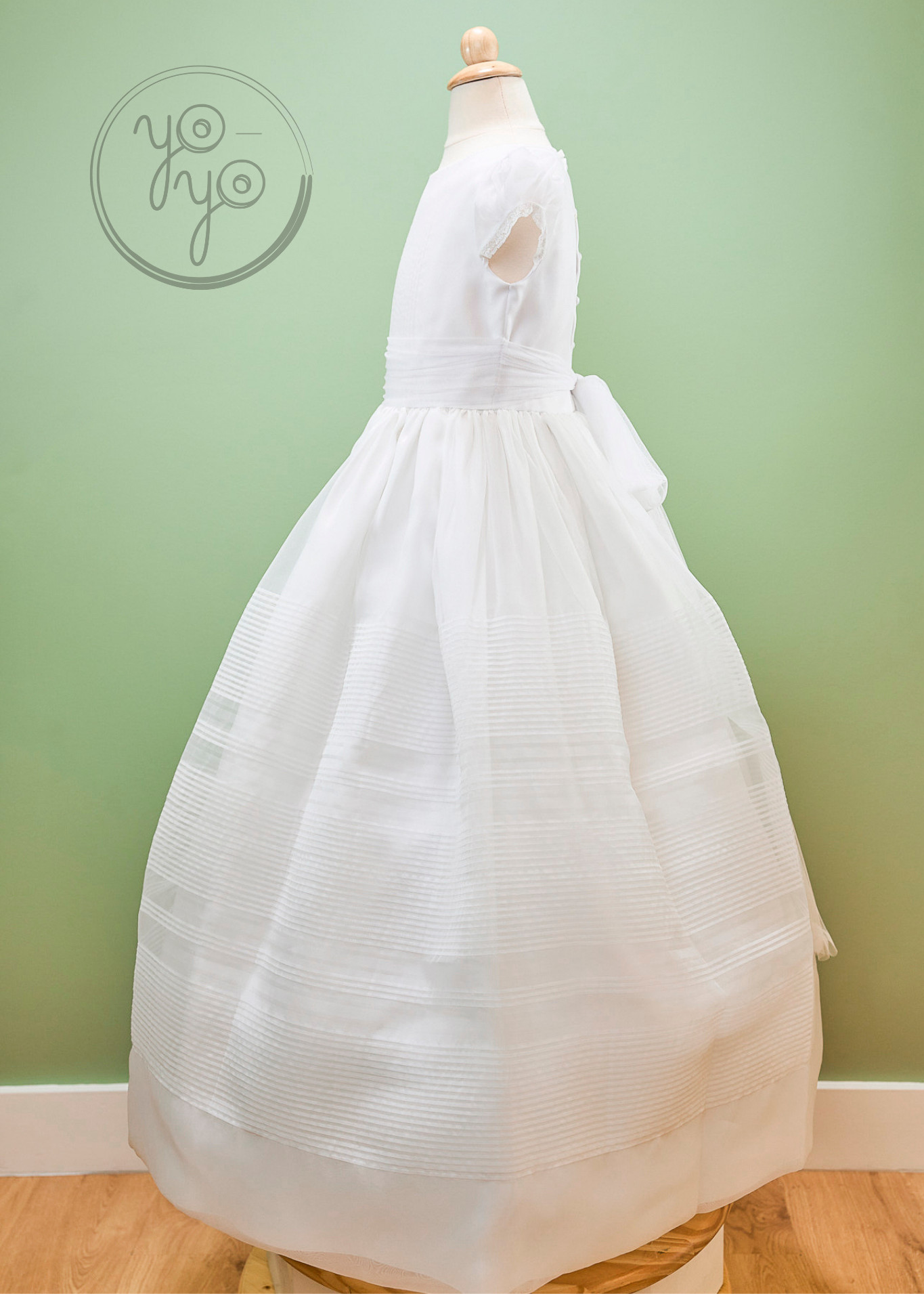 The Peonia First Communion Dress is a dainty and timeless design, perfect for a sacred milestone. Made from lightweight white organza with delicate lace details, it features soft pleats throughout the skirt and bodice for a refined silhouette.
