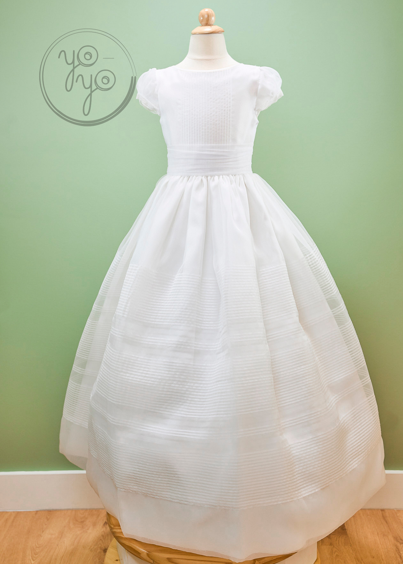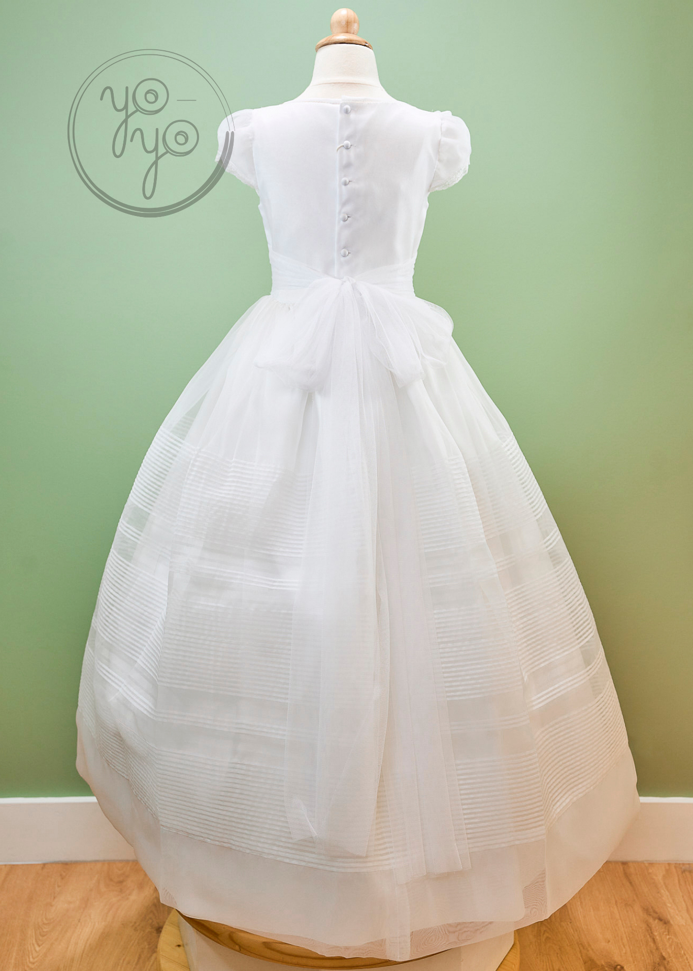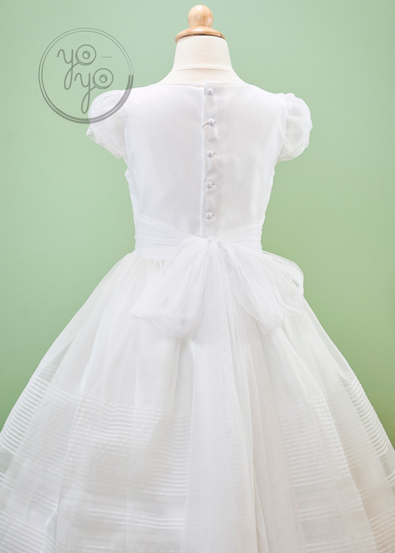 The Peonia First Communion Dress is a dainty and timeless design, perfect for a sacred milestone. Made from lightweight white organza with delicate lace details, it features soft pleats throughout the skirt and bodice for a refined silhouette.