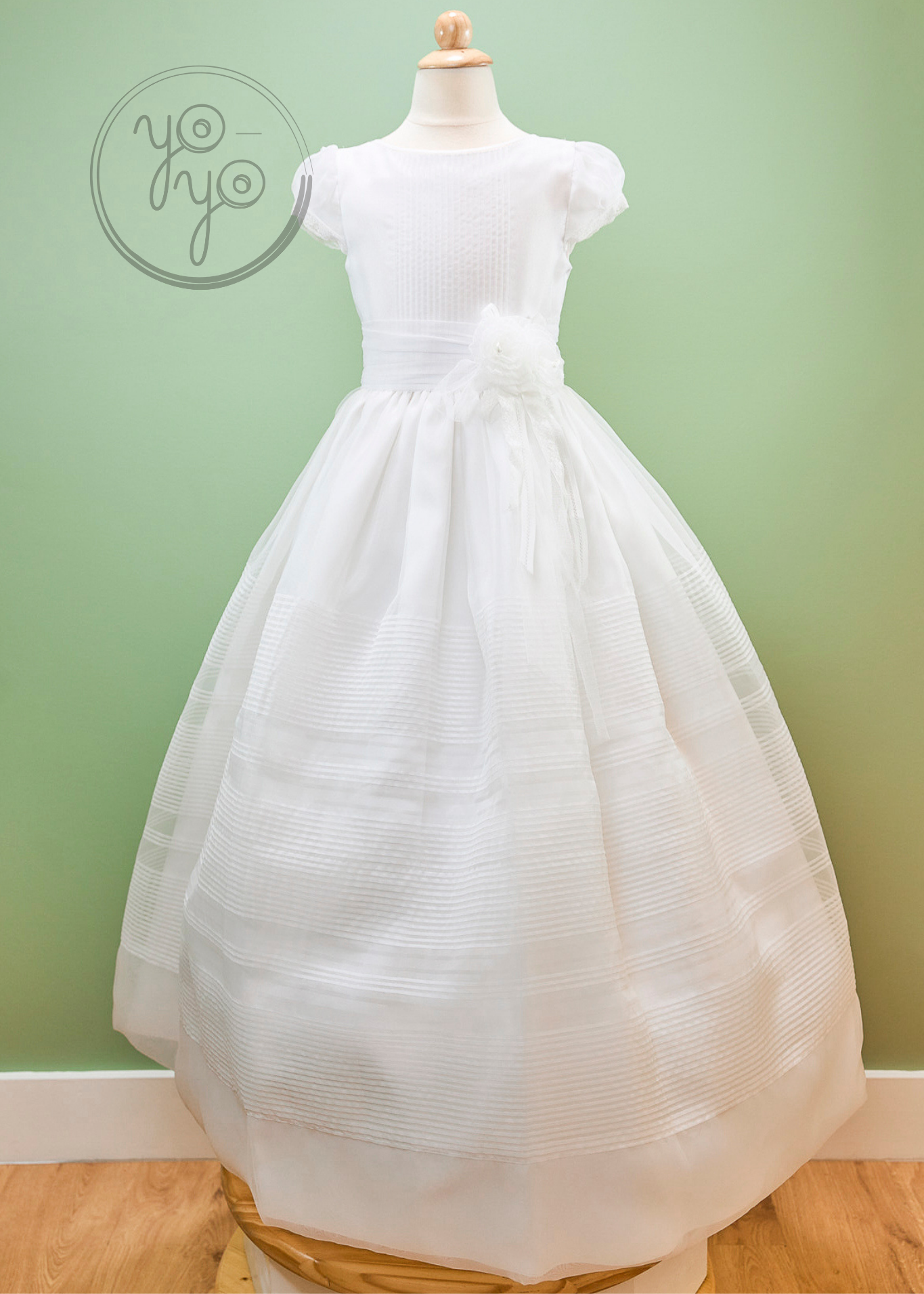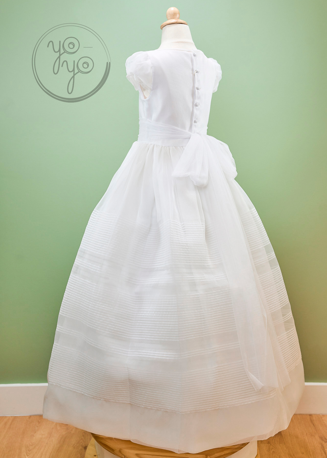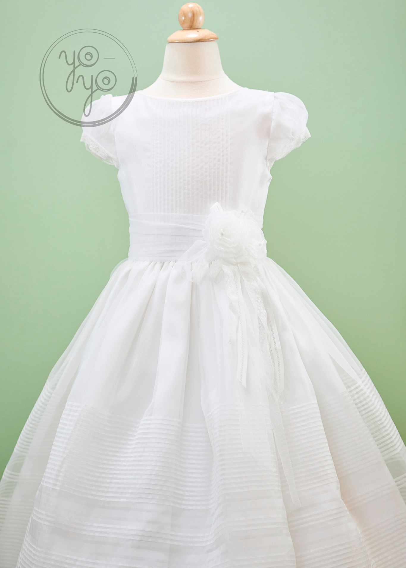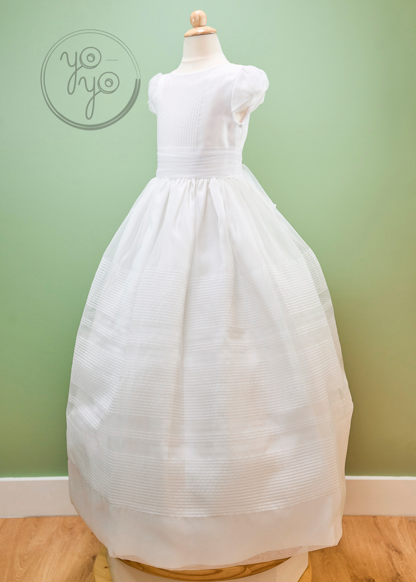 The Peonia First Communion Dress is a dainty and timeless design, perfect for a sacred milestone. Made from lightweight white organza with delicate lace details, it features soft pleats throughout the skirt and bodice for a refined silhouette.