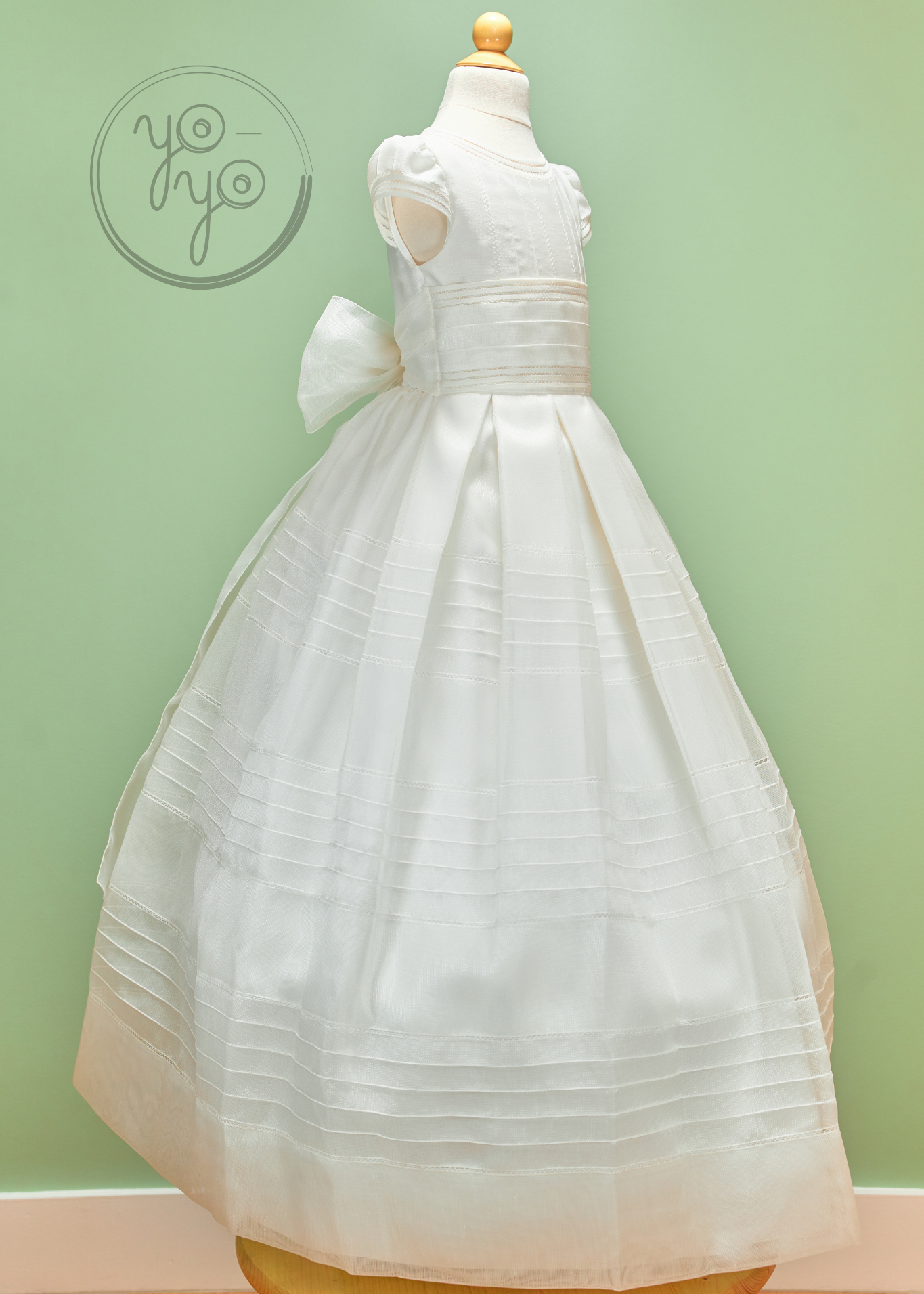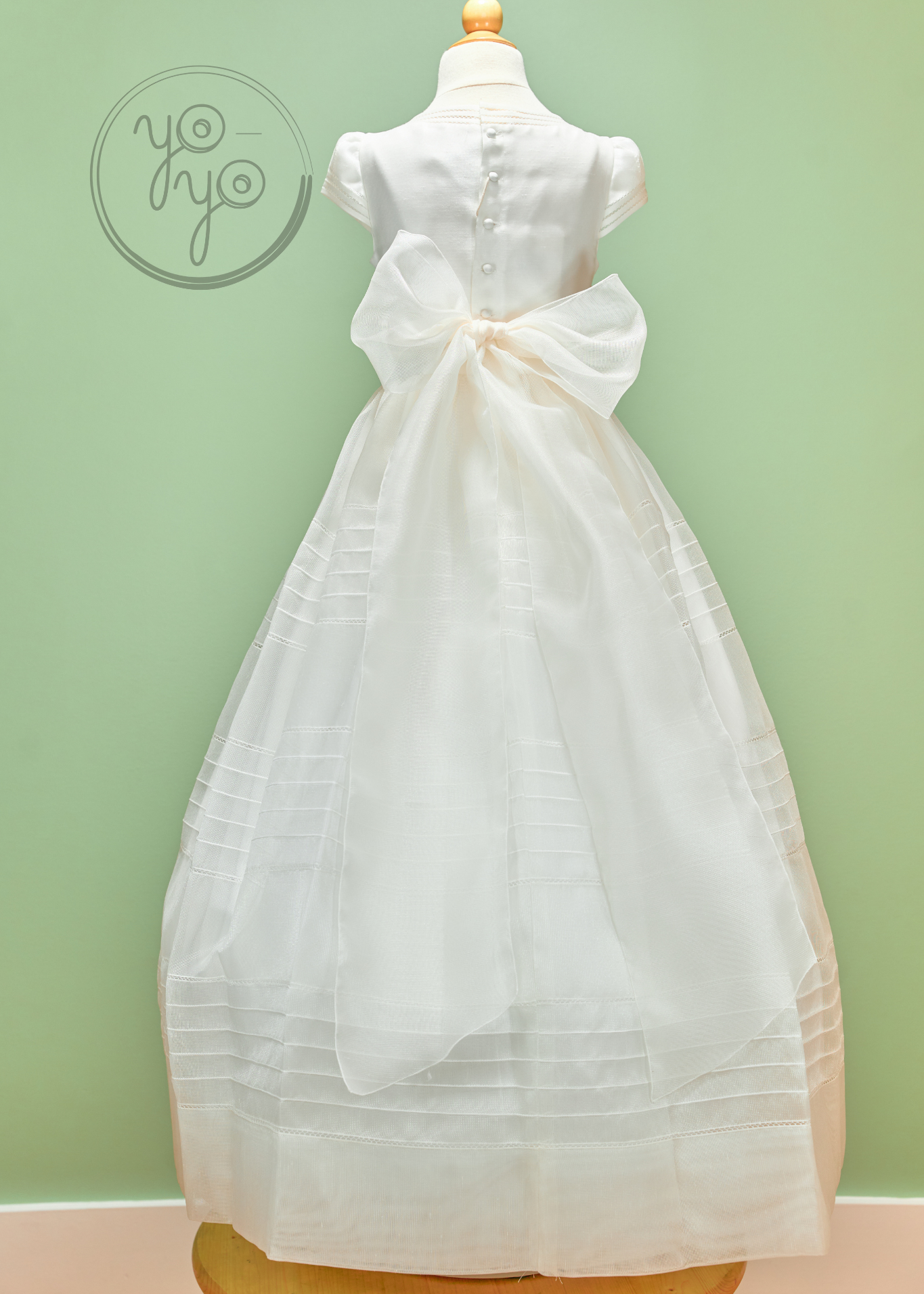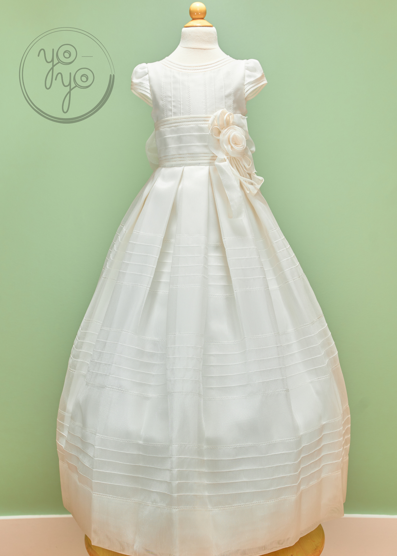 Delicate cap sleeves add a dainty touch, while the simple yet refined structure of the gown highlights its traditional charm. A removable floral appliqué is included, giving families the option to personalize the look with an extra touch of beauty.
