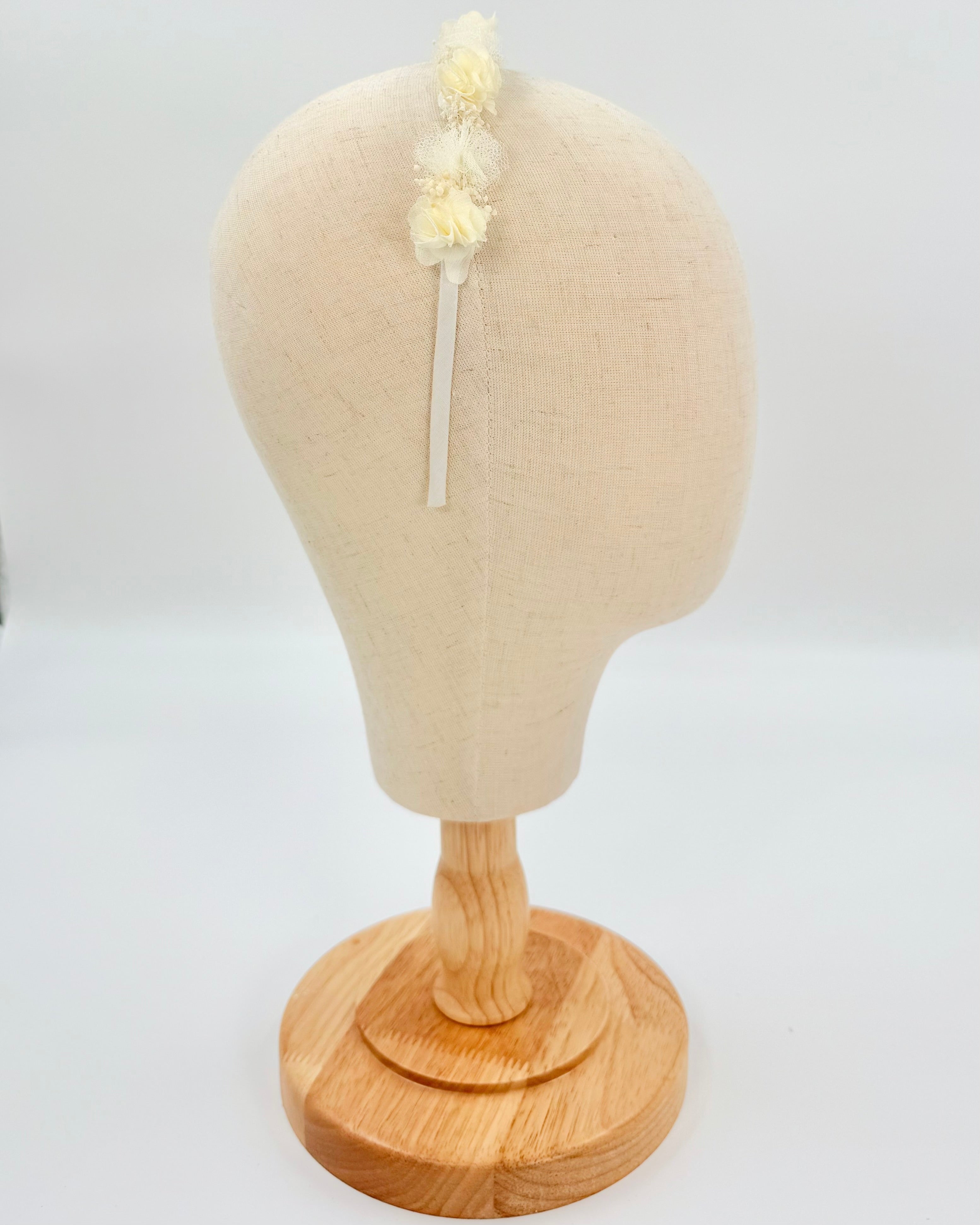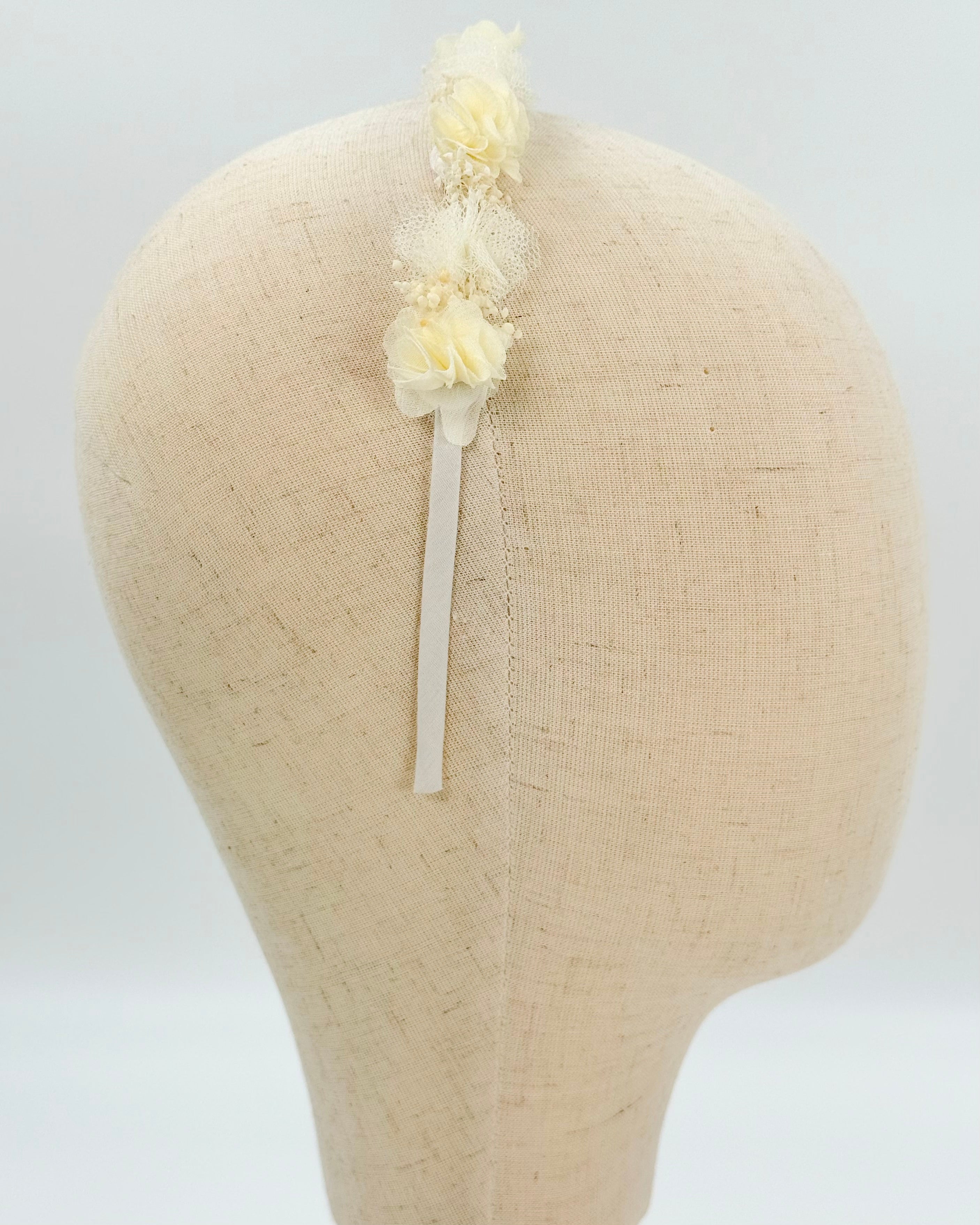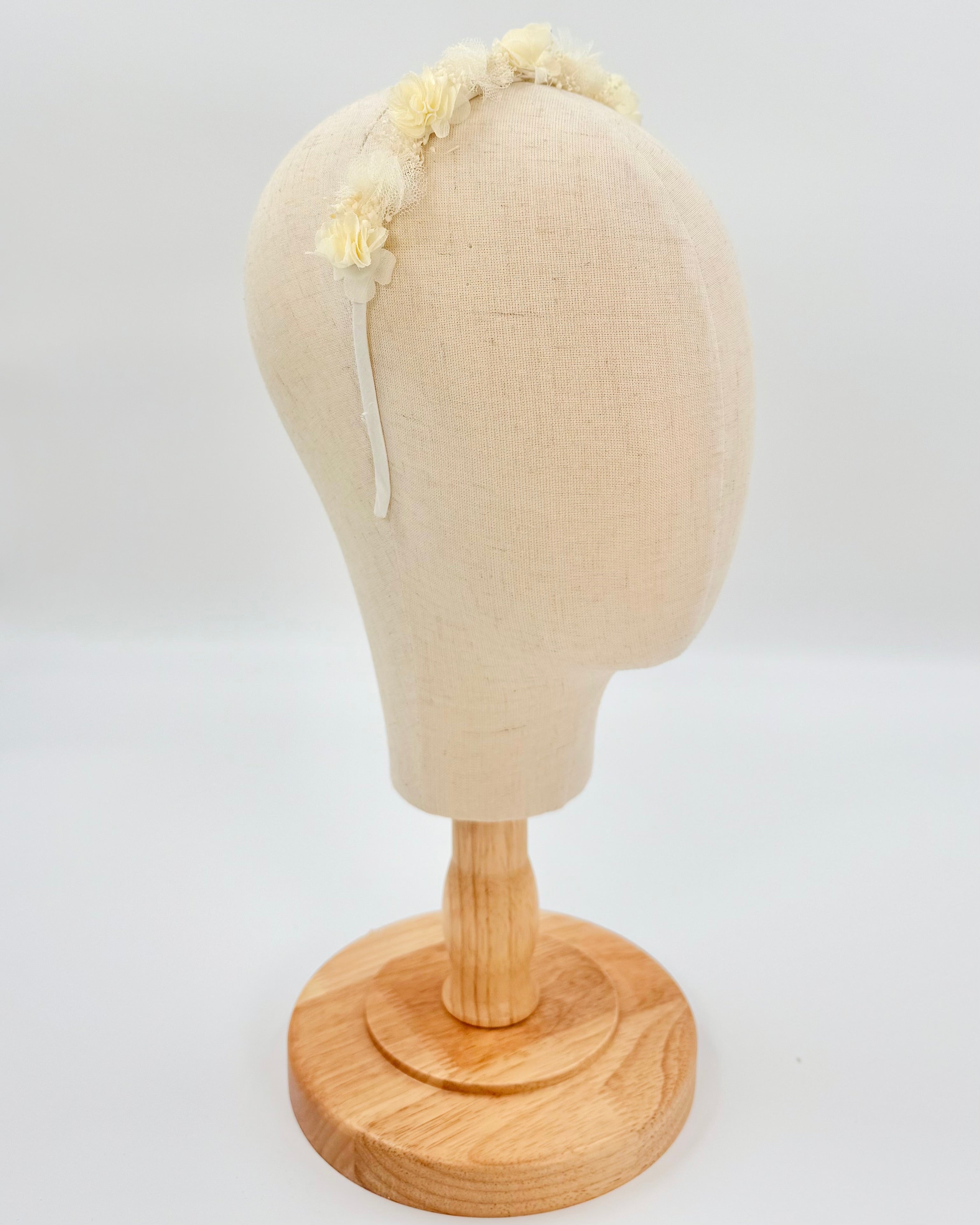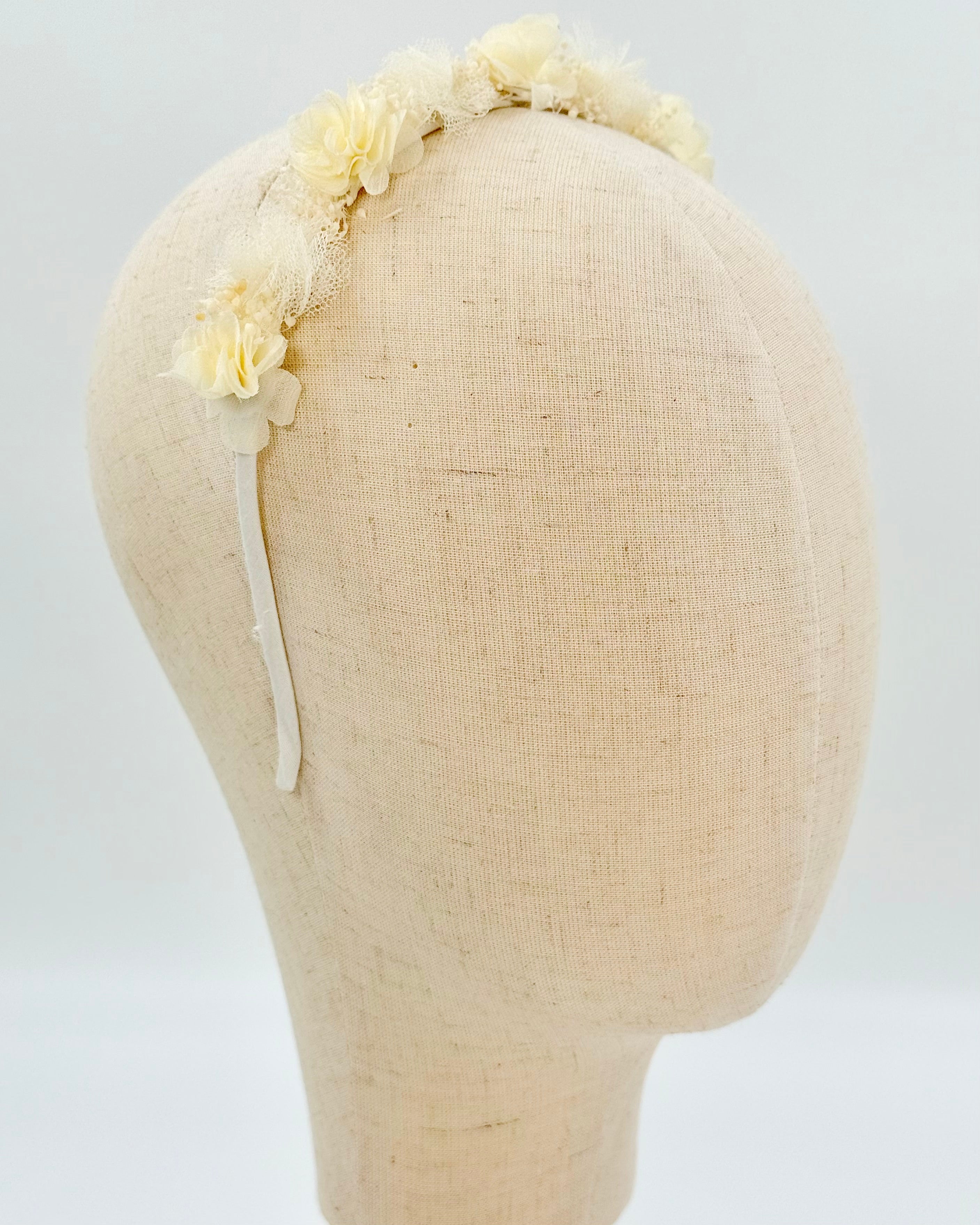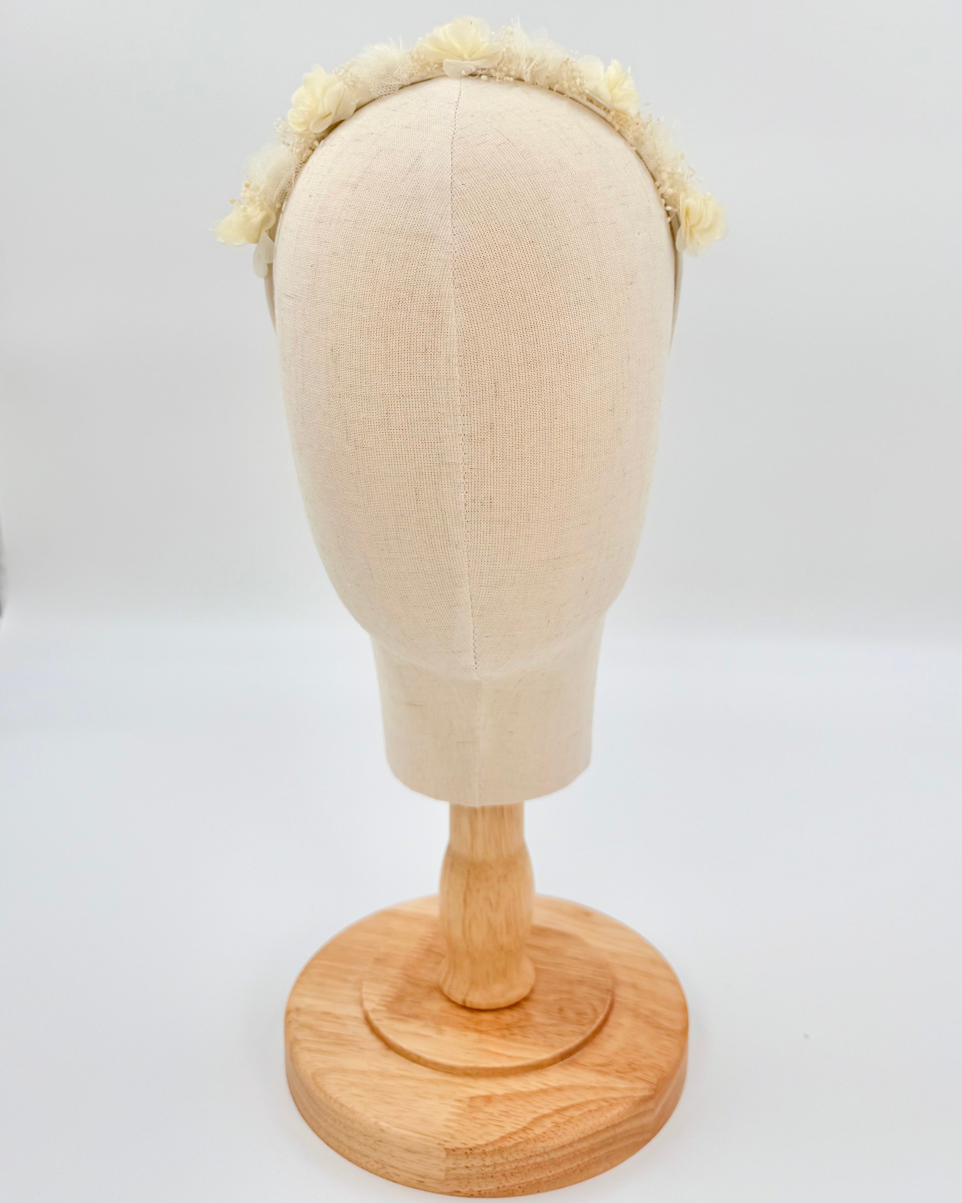 Gorgeous statement headpiece for girls, made with fabric flowers and natural details.
