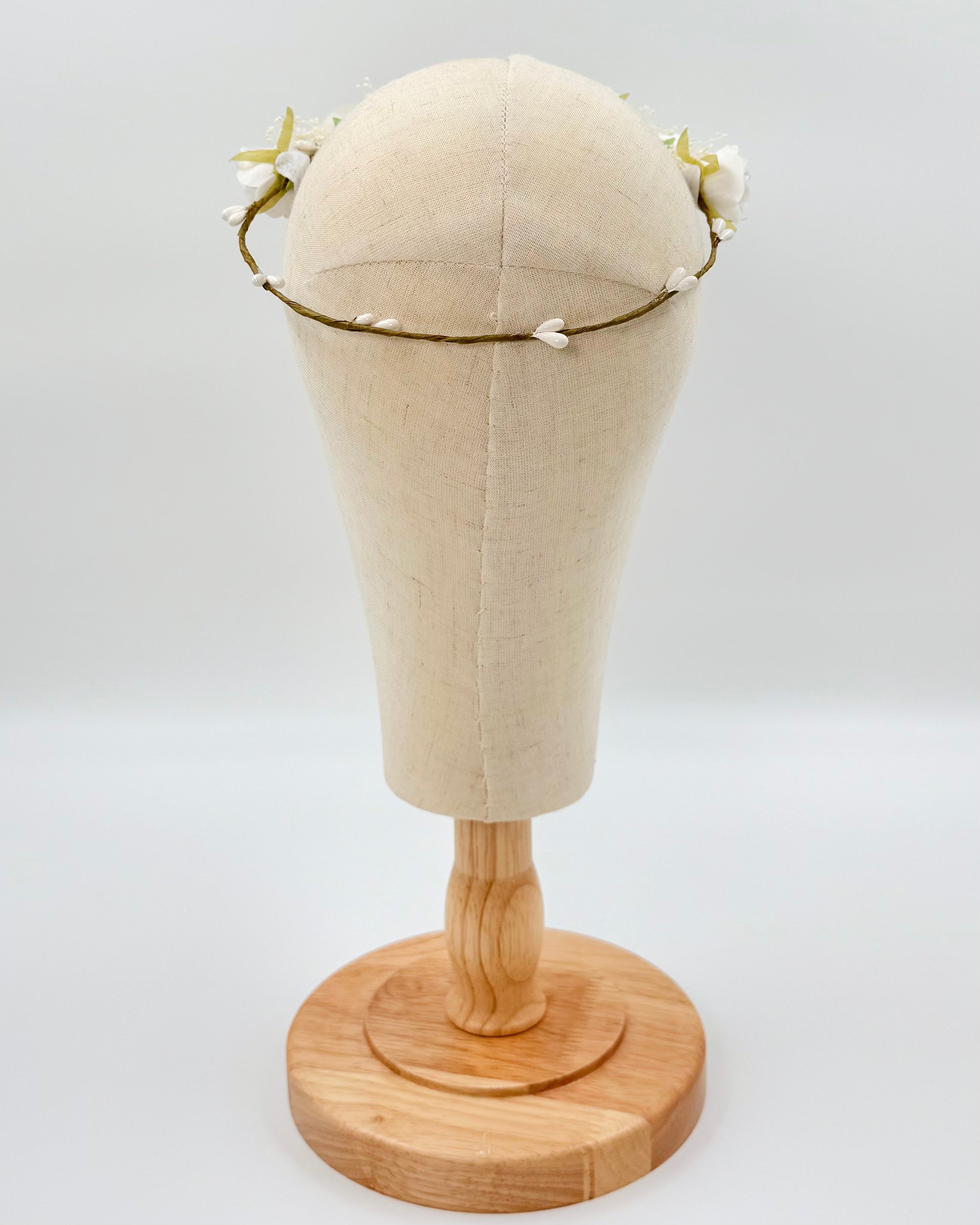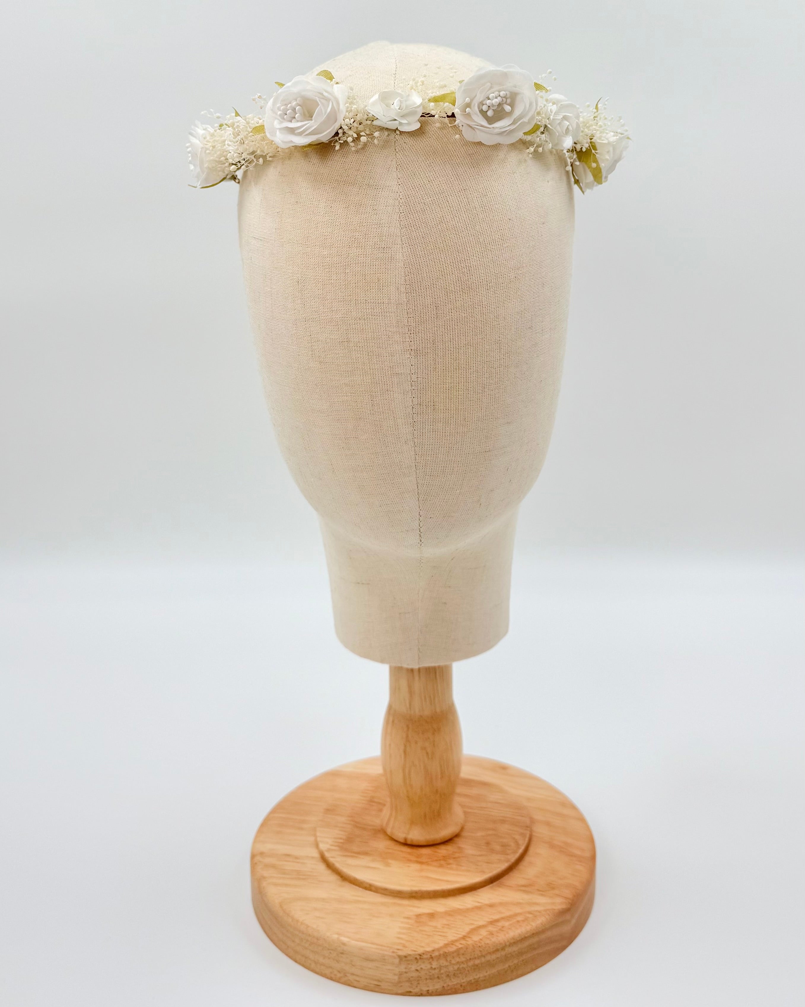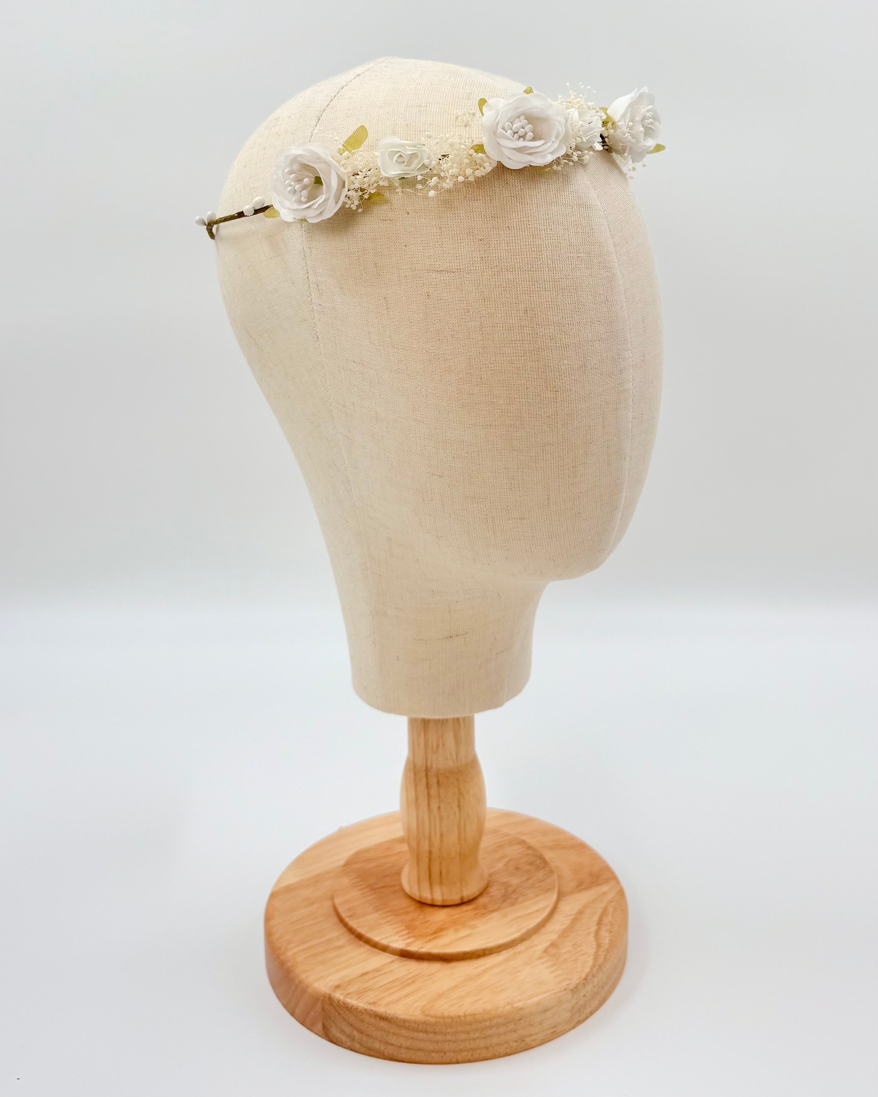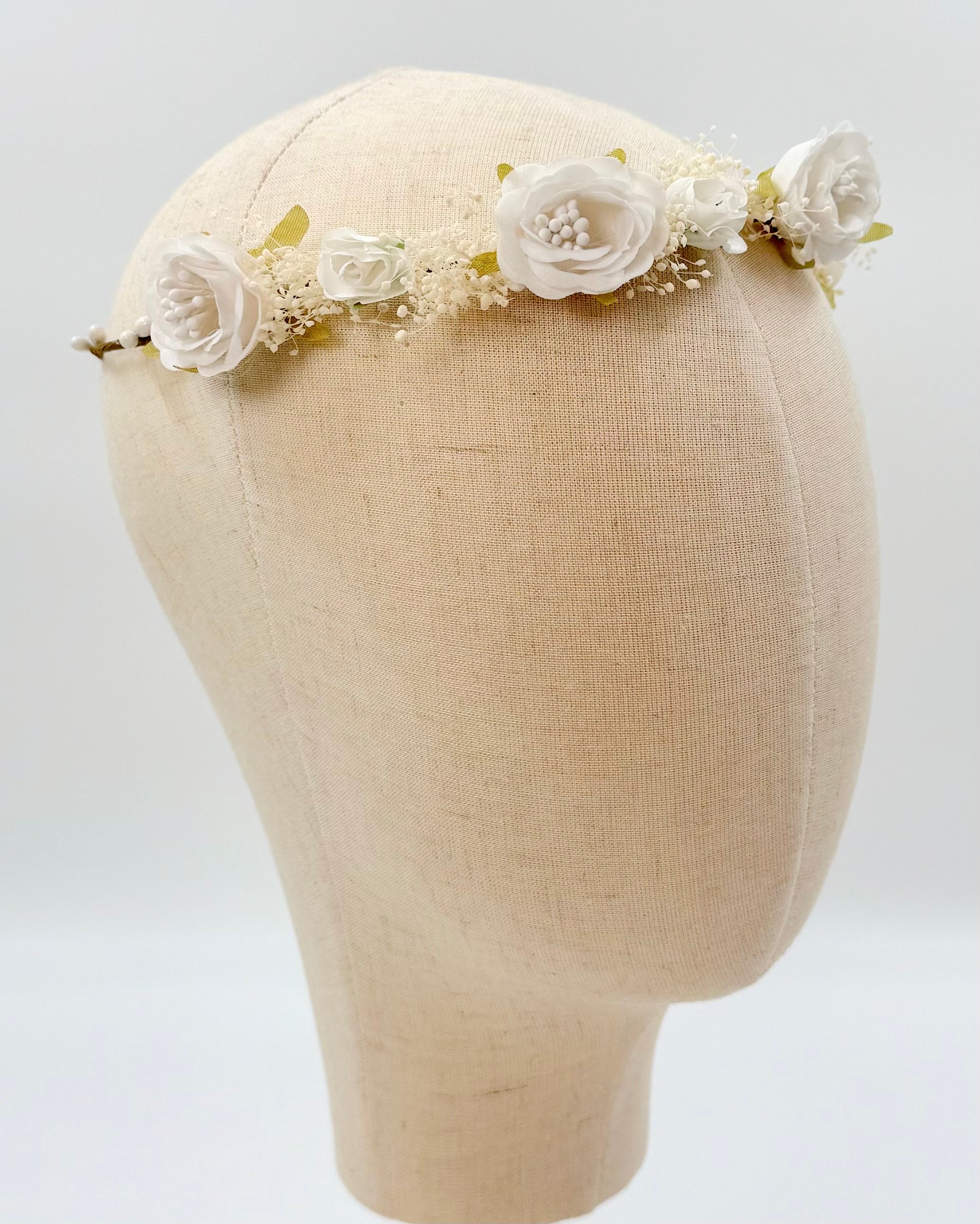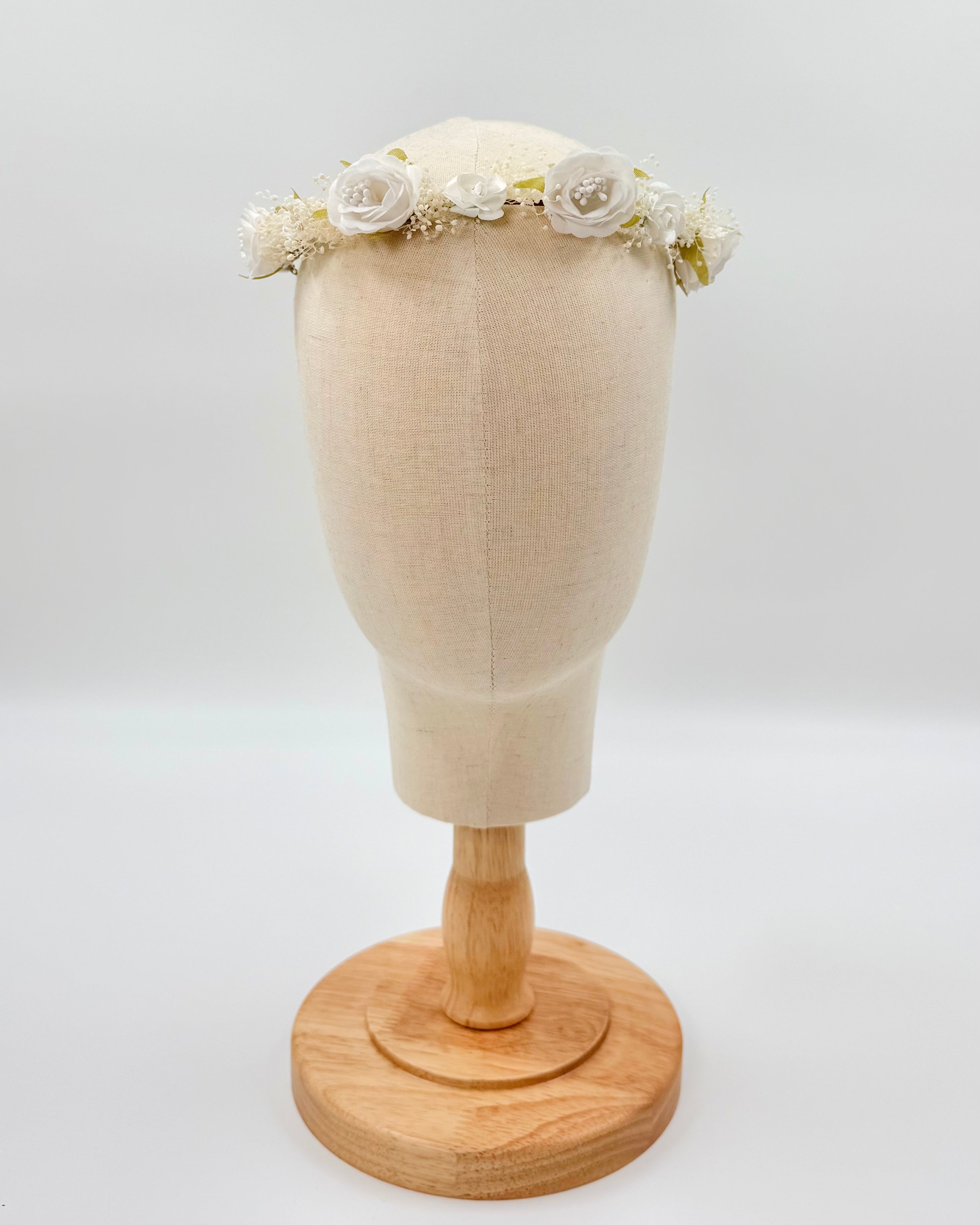 Gorgeous statement headpiece for girls, made with fabric flowers and natural details.