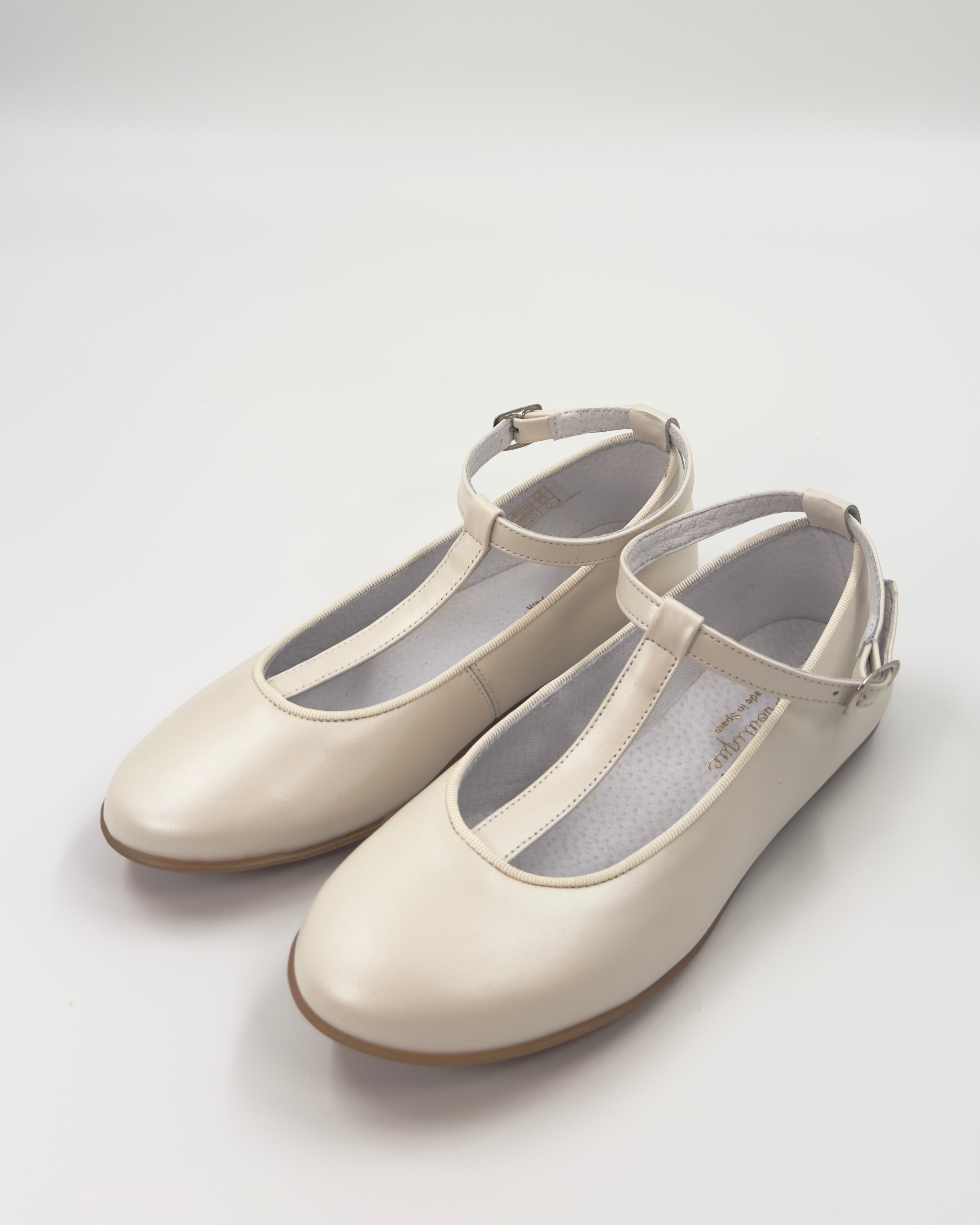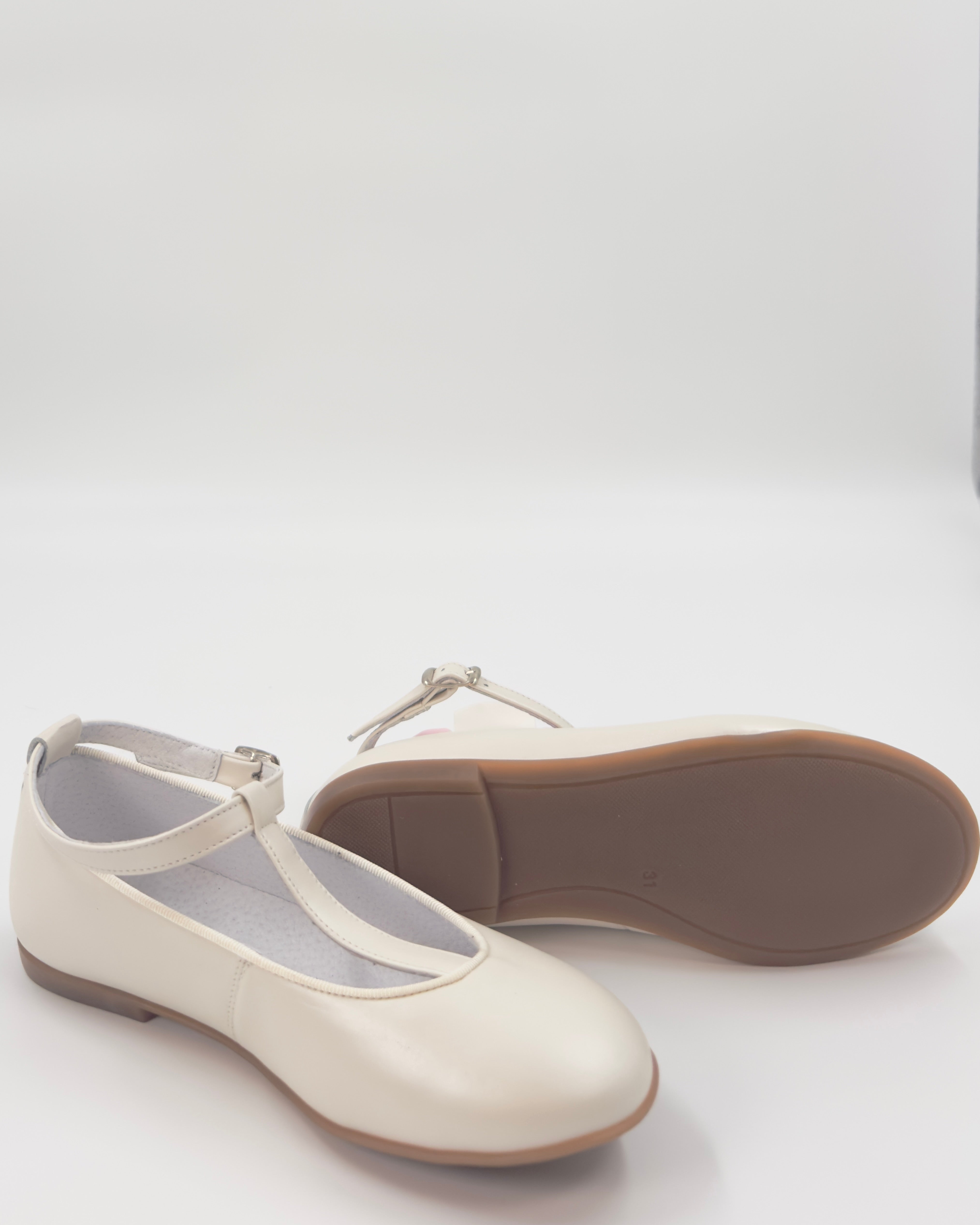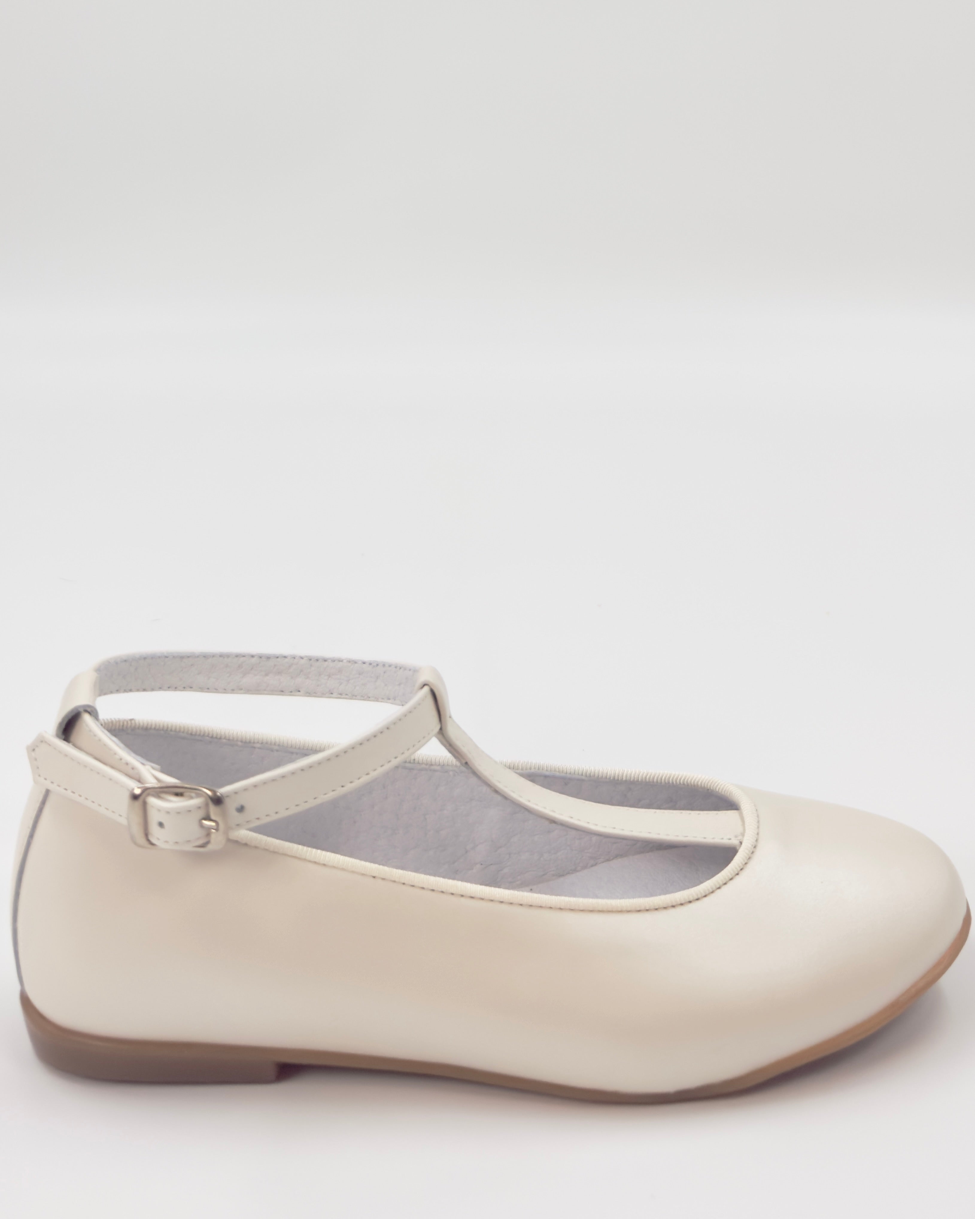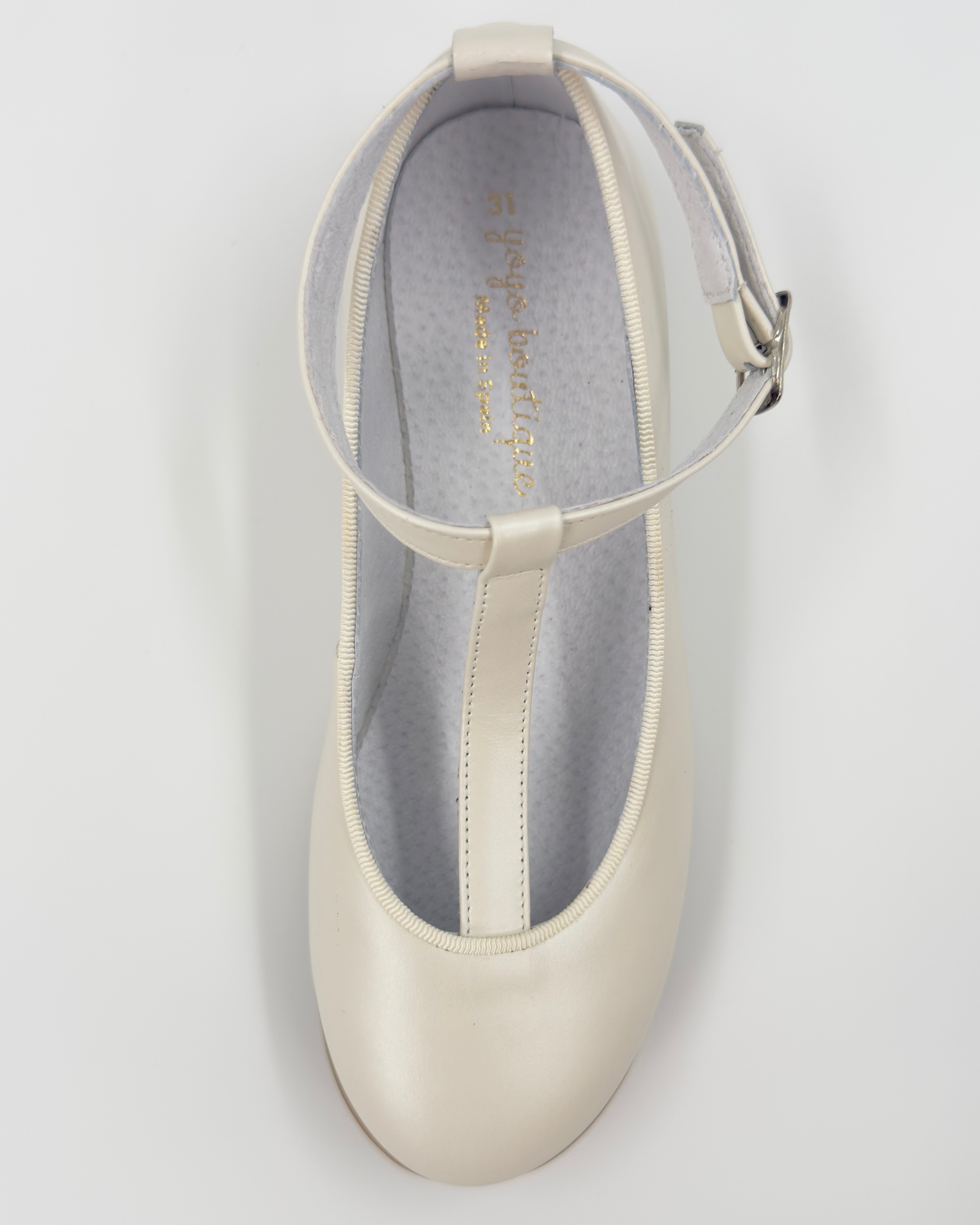 Our T-Bar Ballerina Shoes in Pearl White are the perfect blend of grace and comfort for your little girl’s most cherished moments. Designed as a classic ballerina flat, this elegant shoe features a delicate T-bar strap that anchors at the ankle and across the front of the foot, offering both style and support. Beautifully crafted in Spain, they’re ideal for First Communion, weddings, and other special occasions.