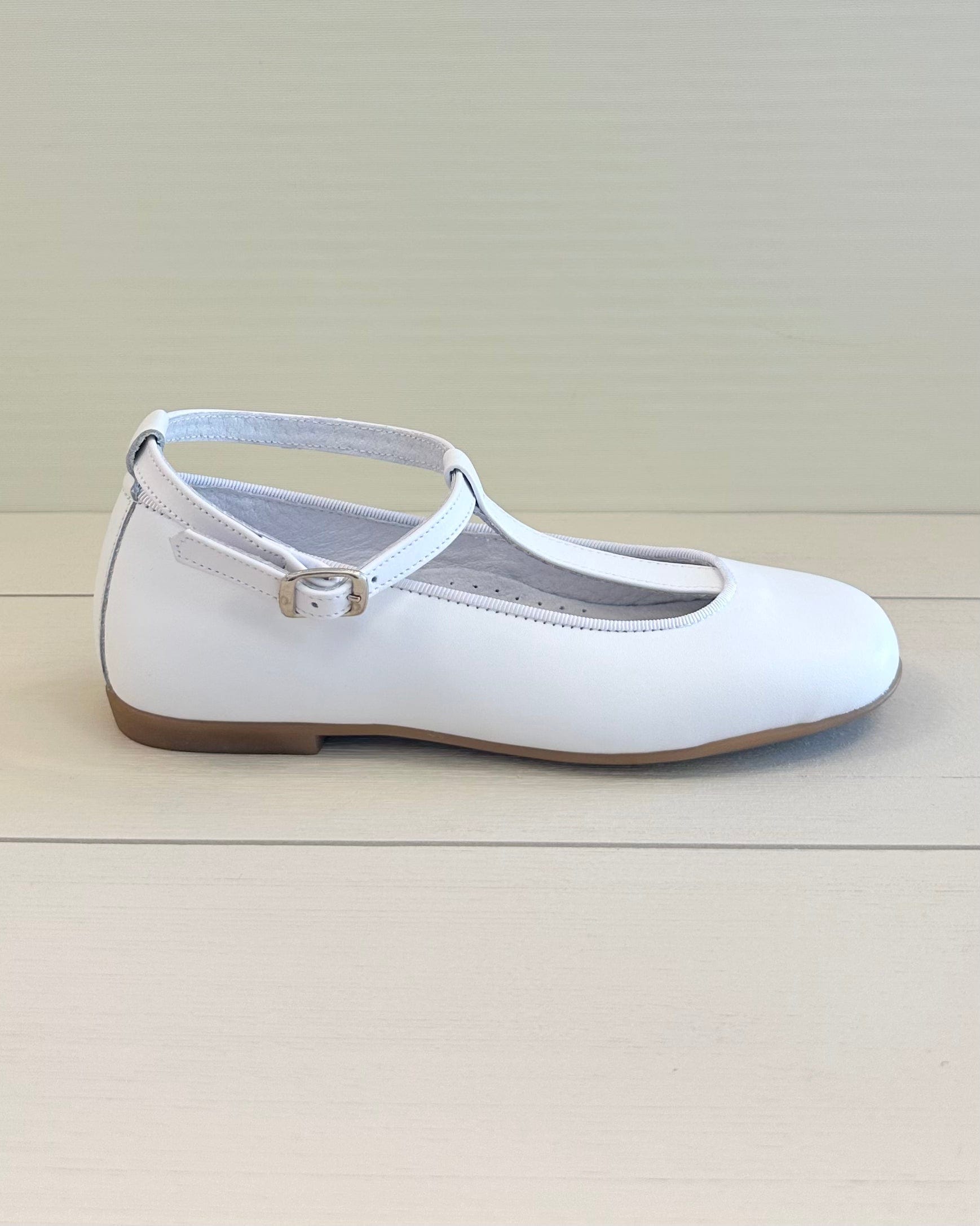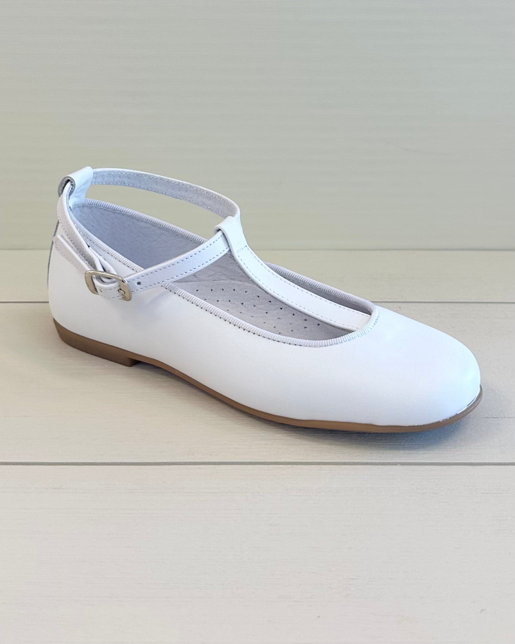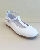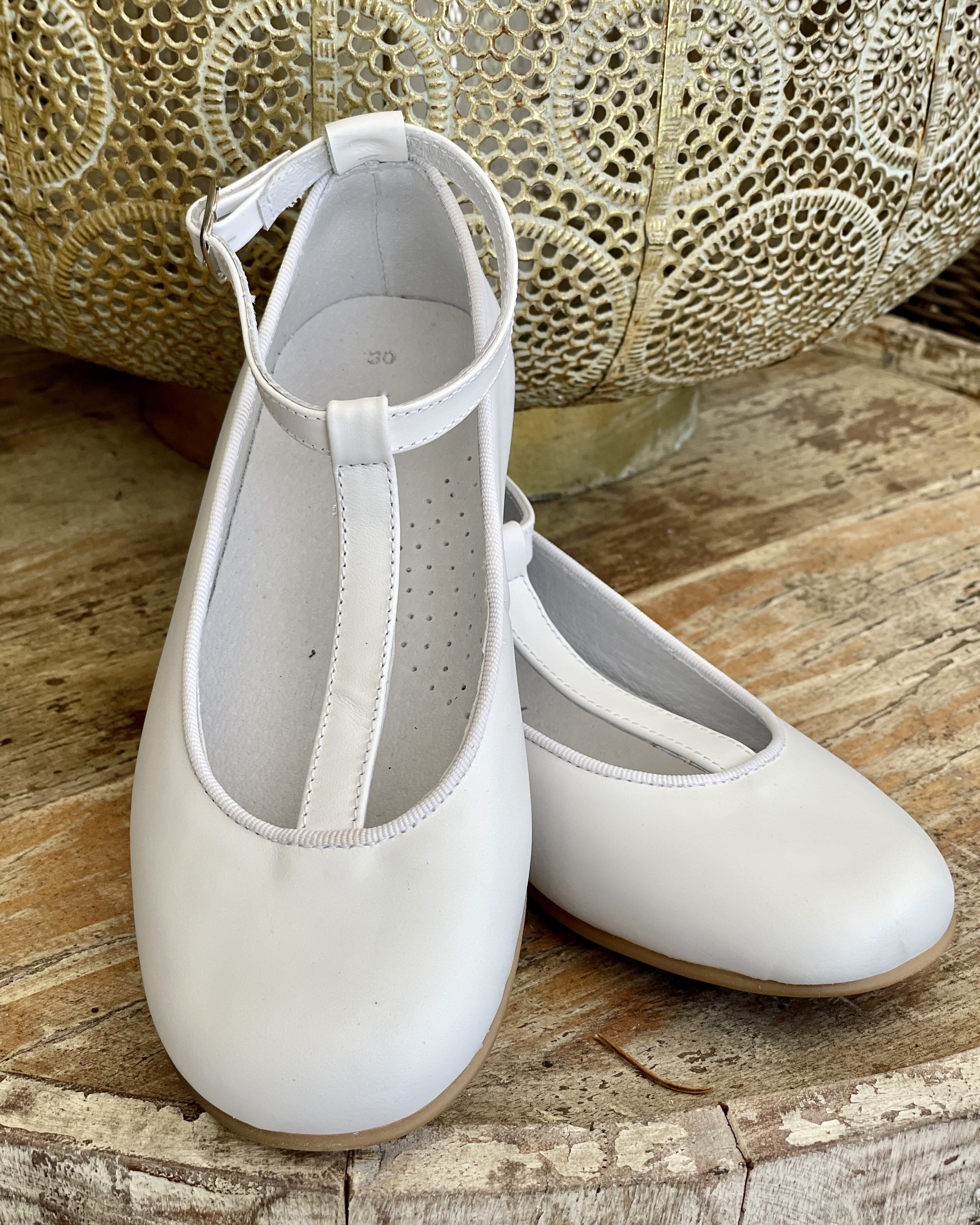 Our T-Bar Ballerina Shoe in White is a graceful and classic choice for girls celebrating their First Communion or attending other special occasions. Expertly handcrafted in Spain, this elegant ballerina flat features a delicate T-bar strap that adds both style and support across the ankle and foot. Made from high-quality materials, it offers comfort, stability, and timeless charm—perfect for completing her formal look.