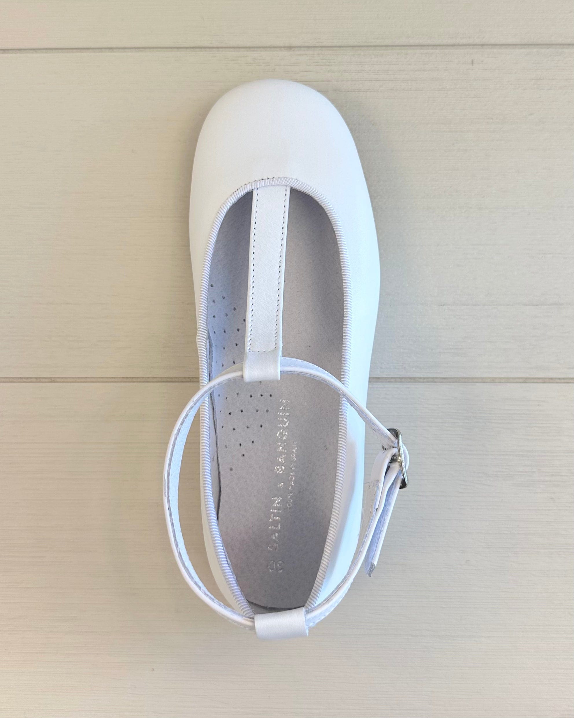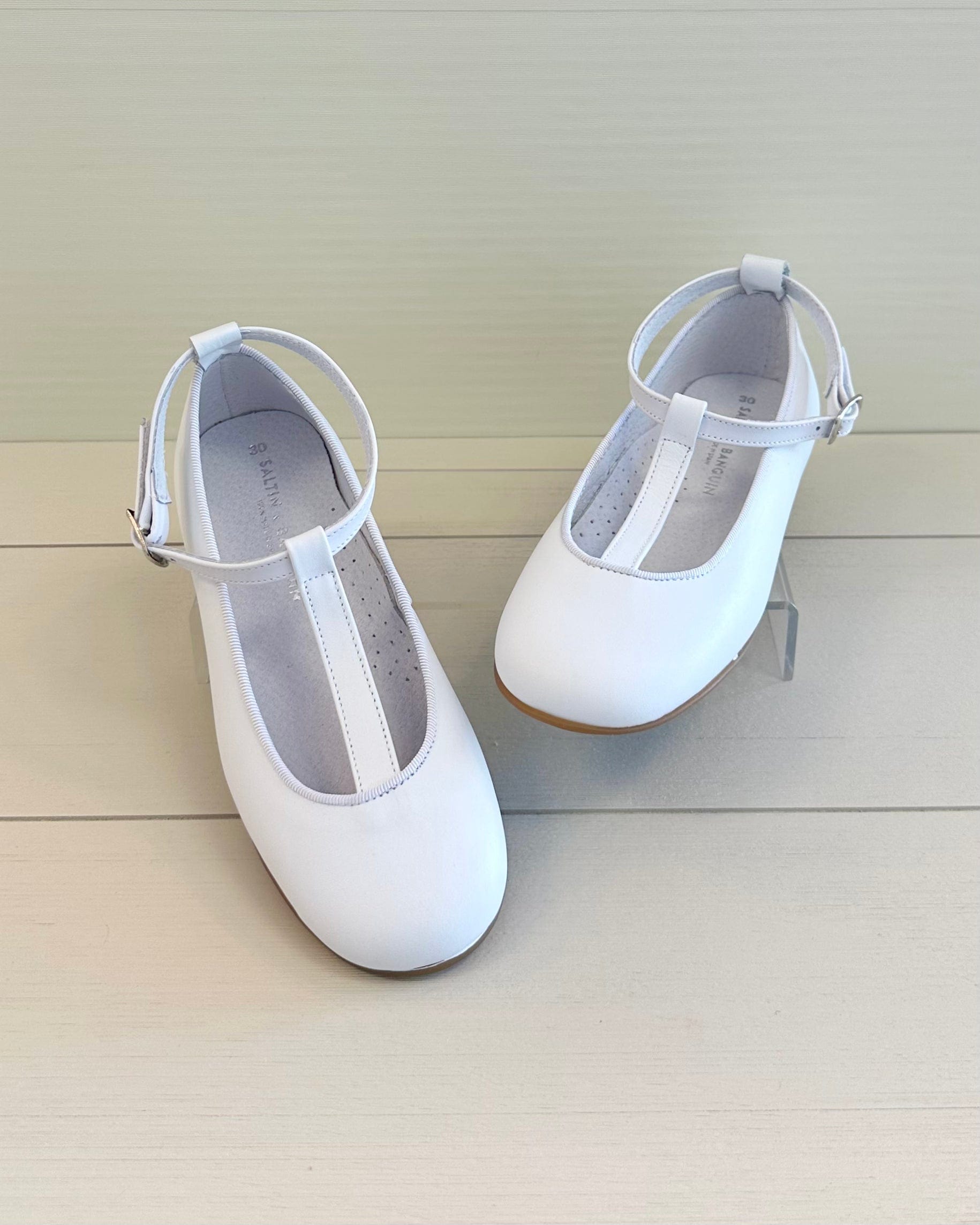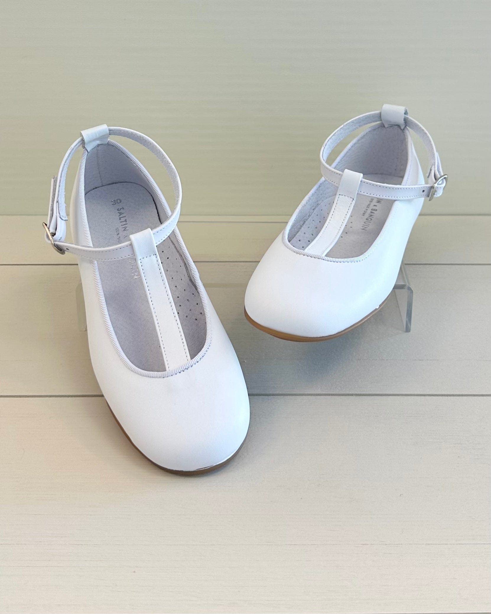 Our T-Bar Ballerina Shoe in White is a graceful and classic choice for girls celebrating their First Communion or attending other special occasions. Expertly handcrafted in Spain, this elegant ballerina flat features a delicate T-bar strap that adds both style and support across the ankle and foot. Made from high-quality materials, it offers comfort, stability, and timeless charm—perfect for completing her formal look.
