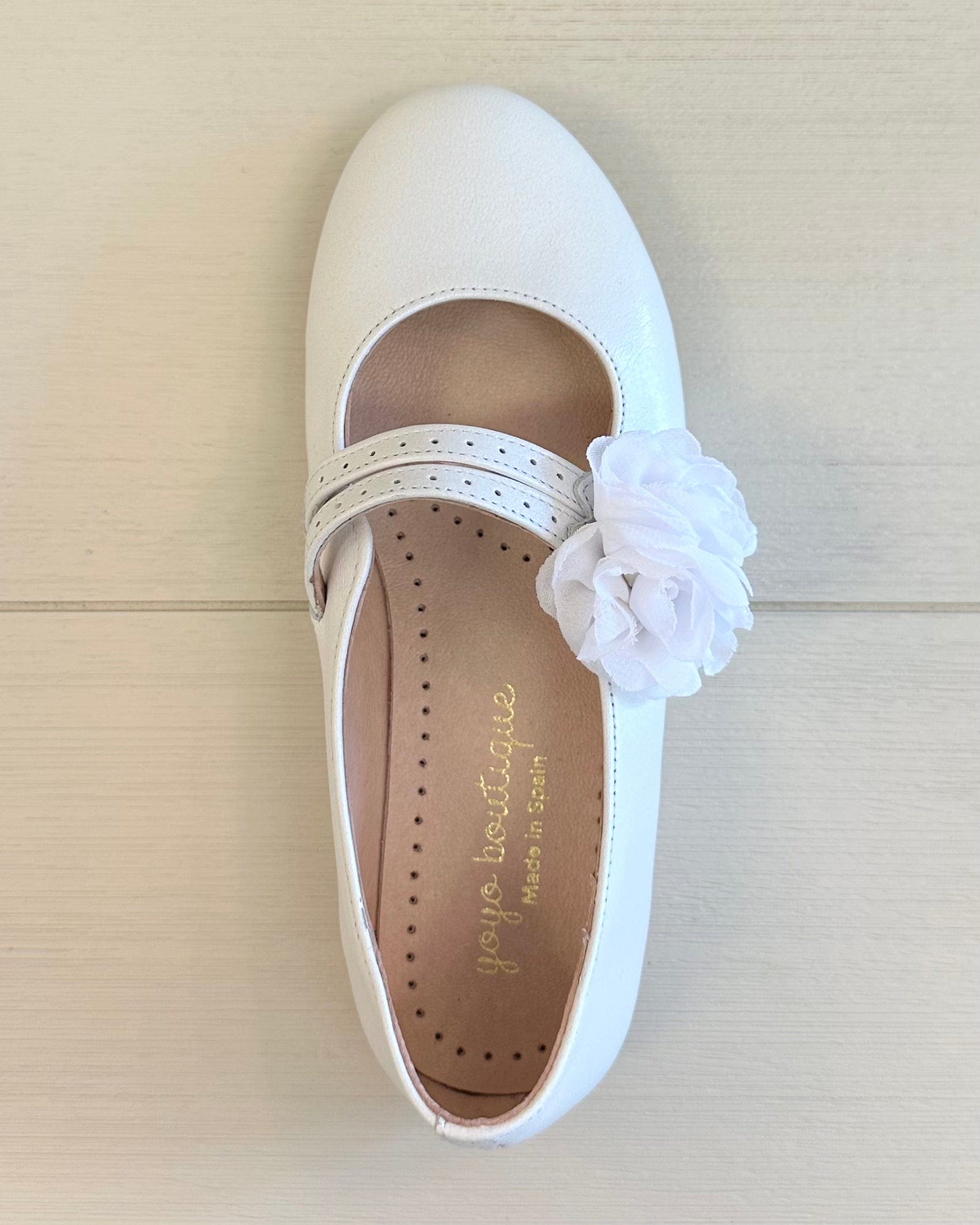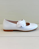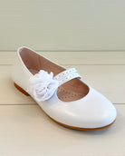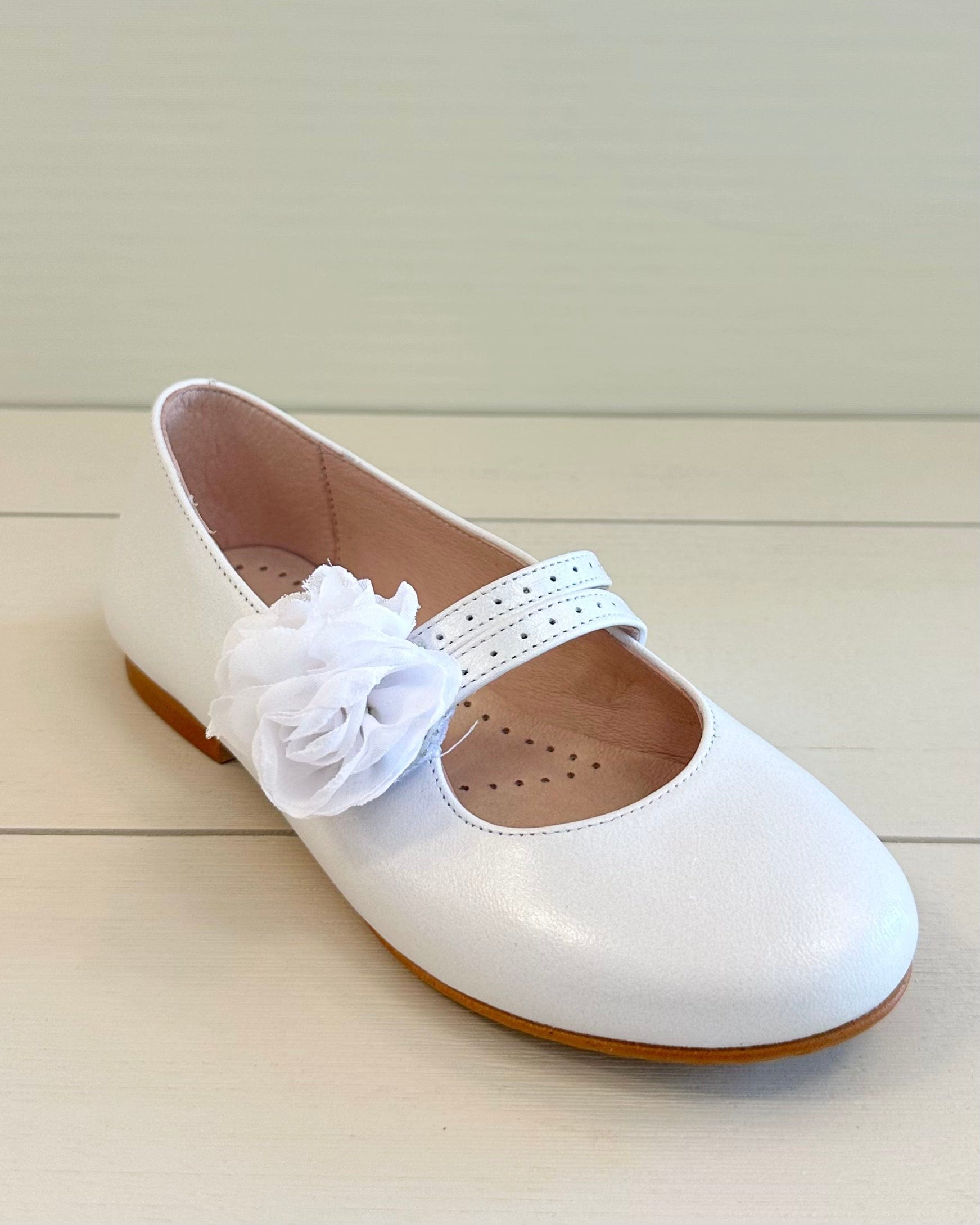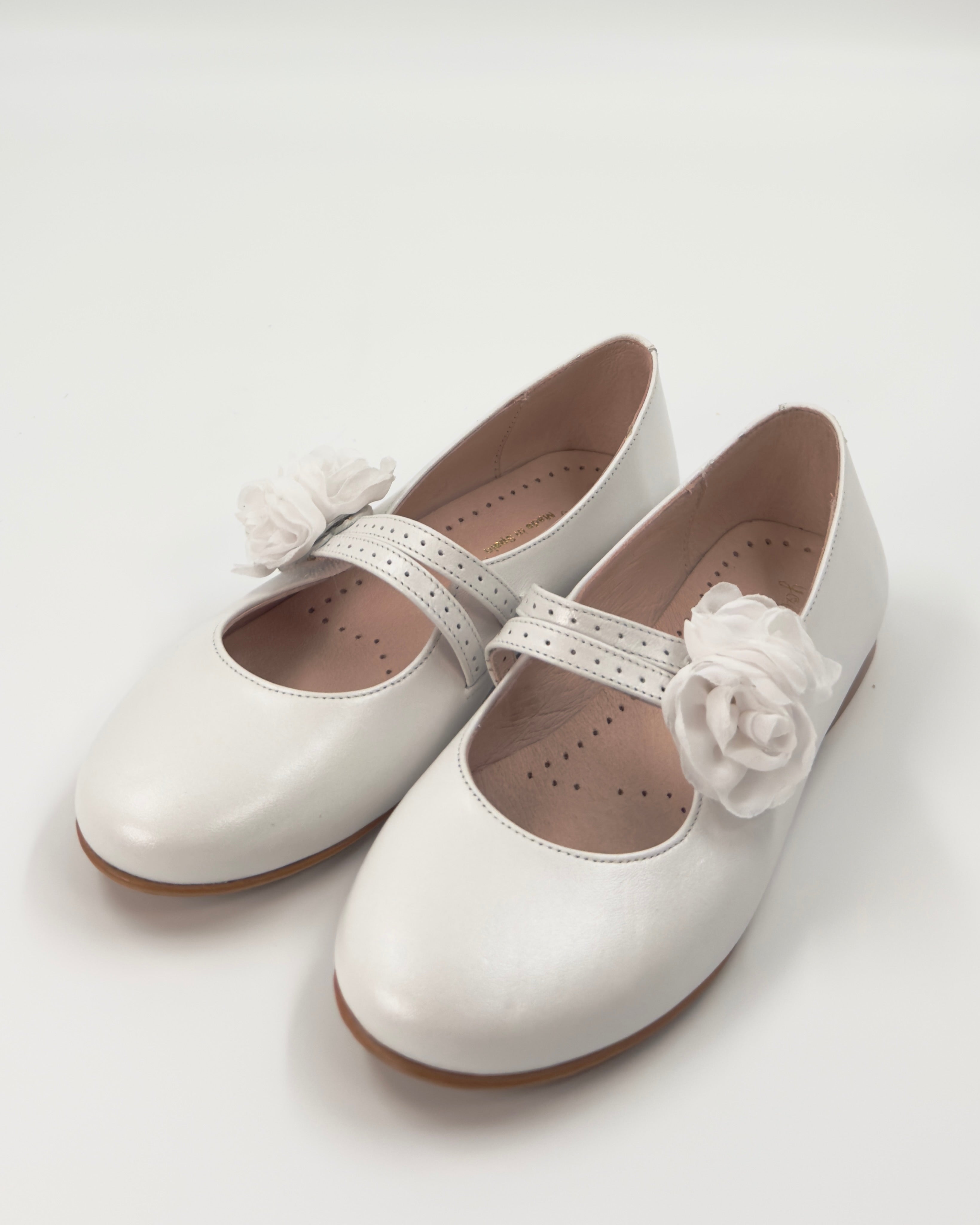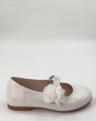 Pearl White Mary Jane shoes with flower appliqué, made in Spain from leather—perfect for girls' First Communion, weddings, and other elegant special occasions.