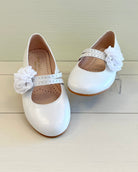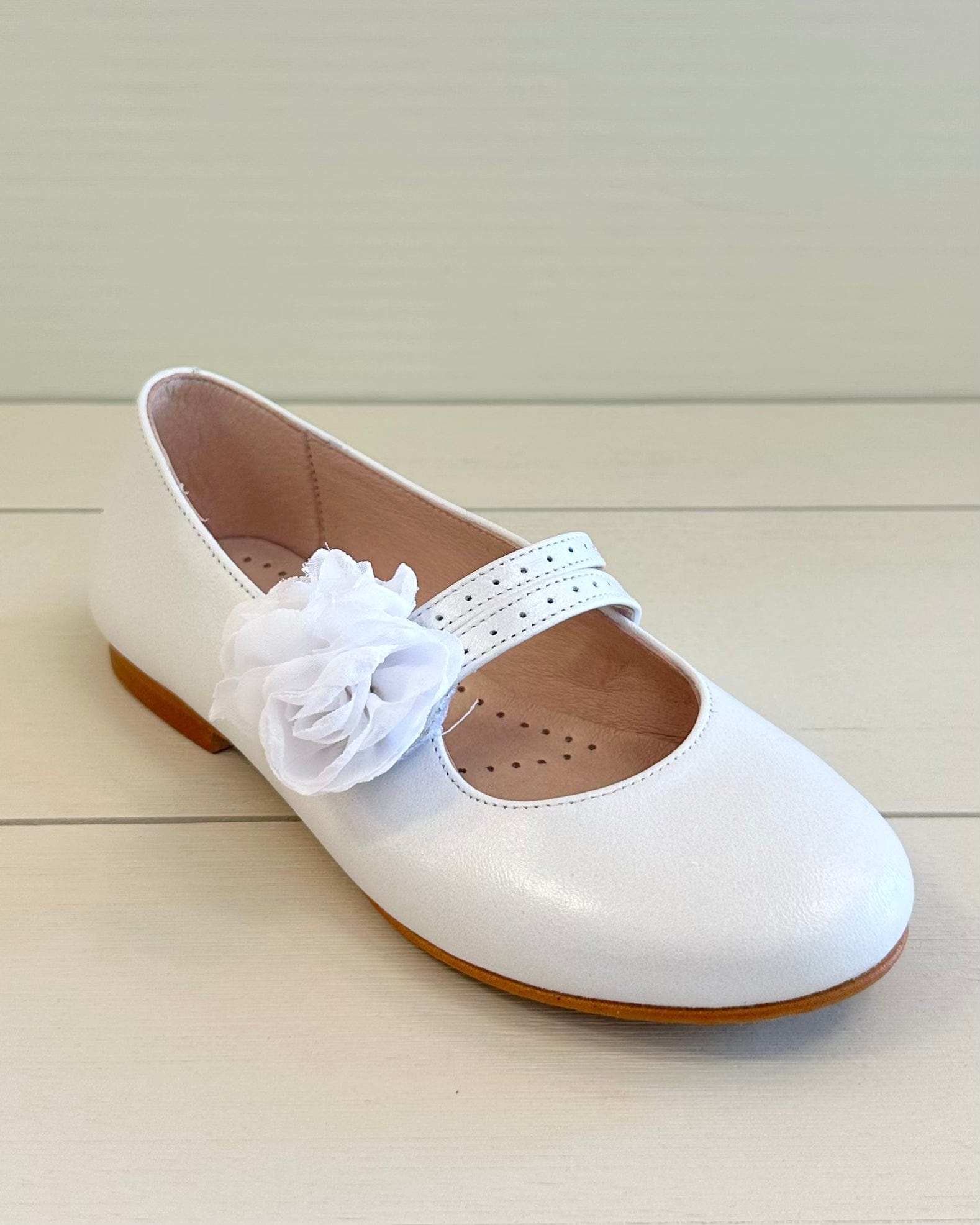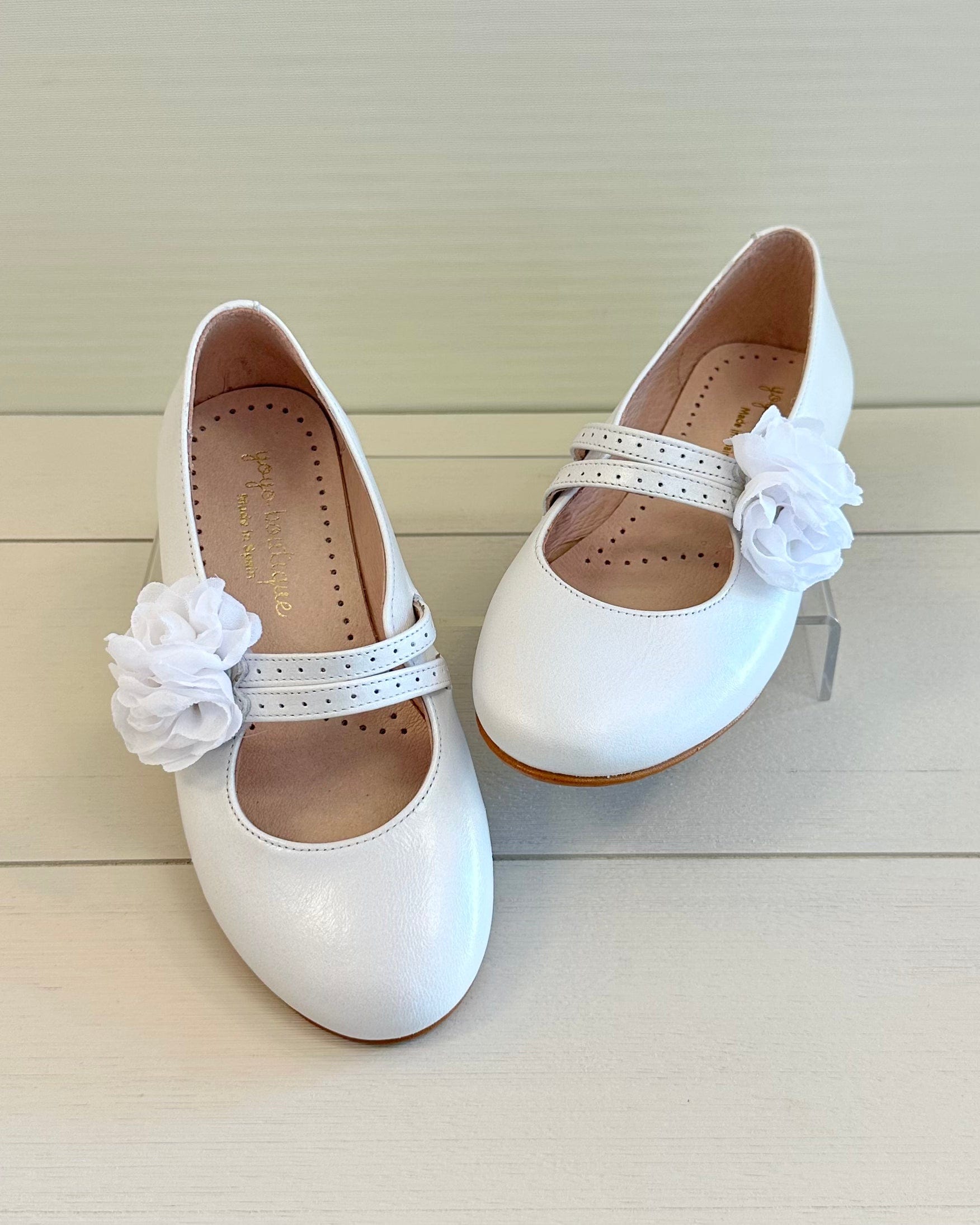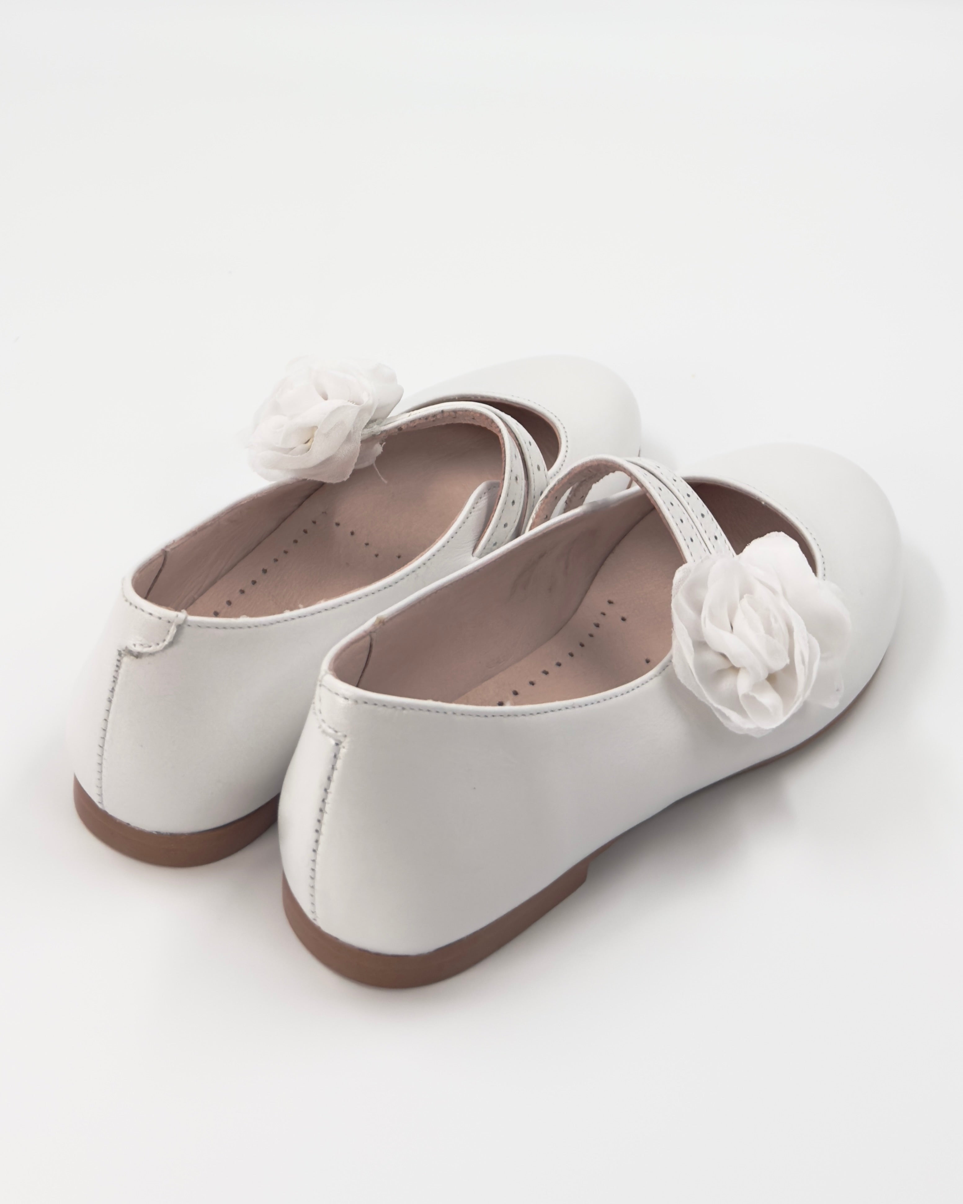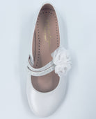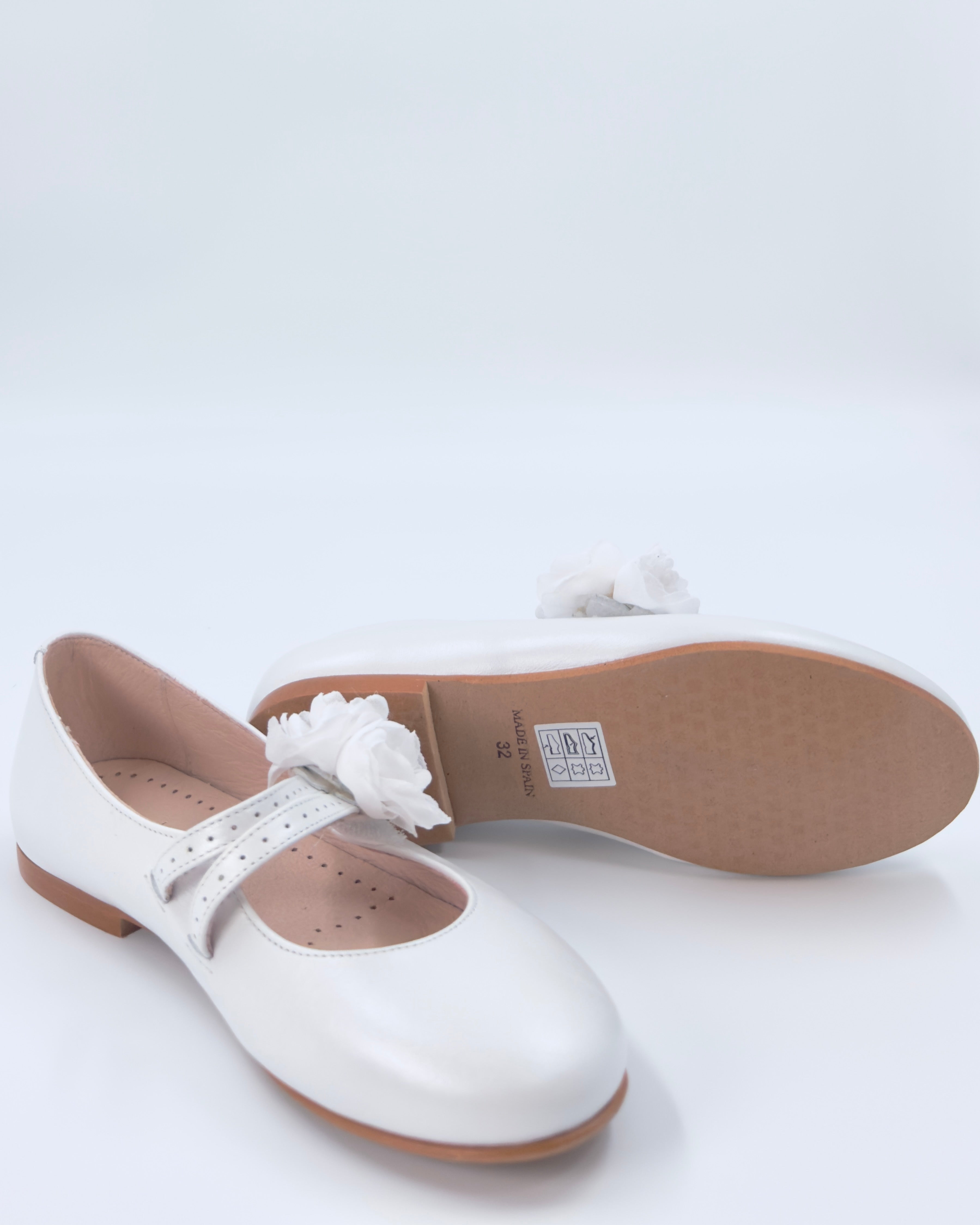 Pearl White Mary Jane shoes with flower appliqué, made in Spain from leather—perfect for girls' First Communion, weddings, and other elegant special occasions.