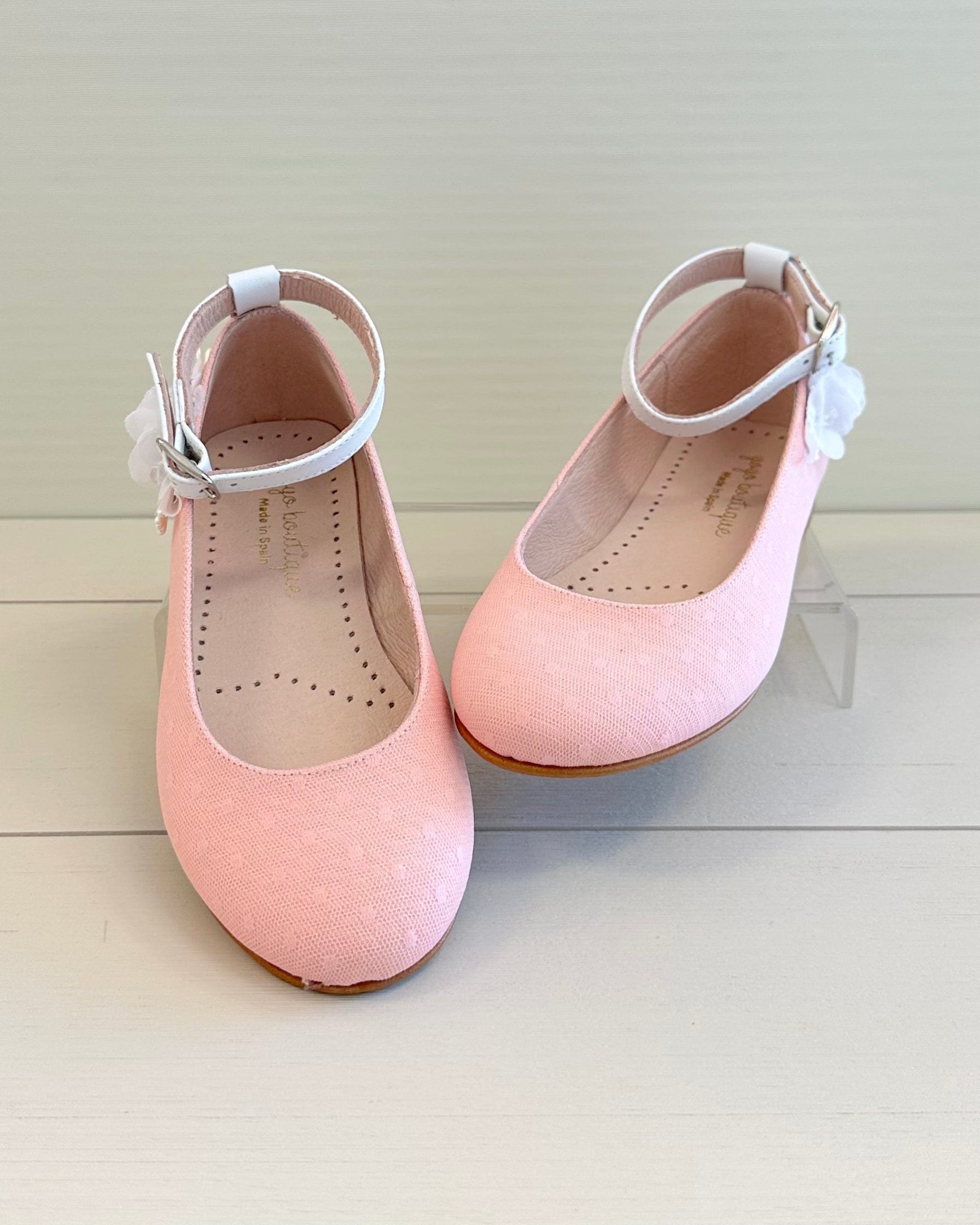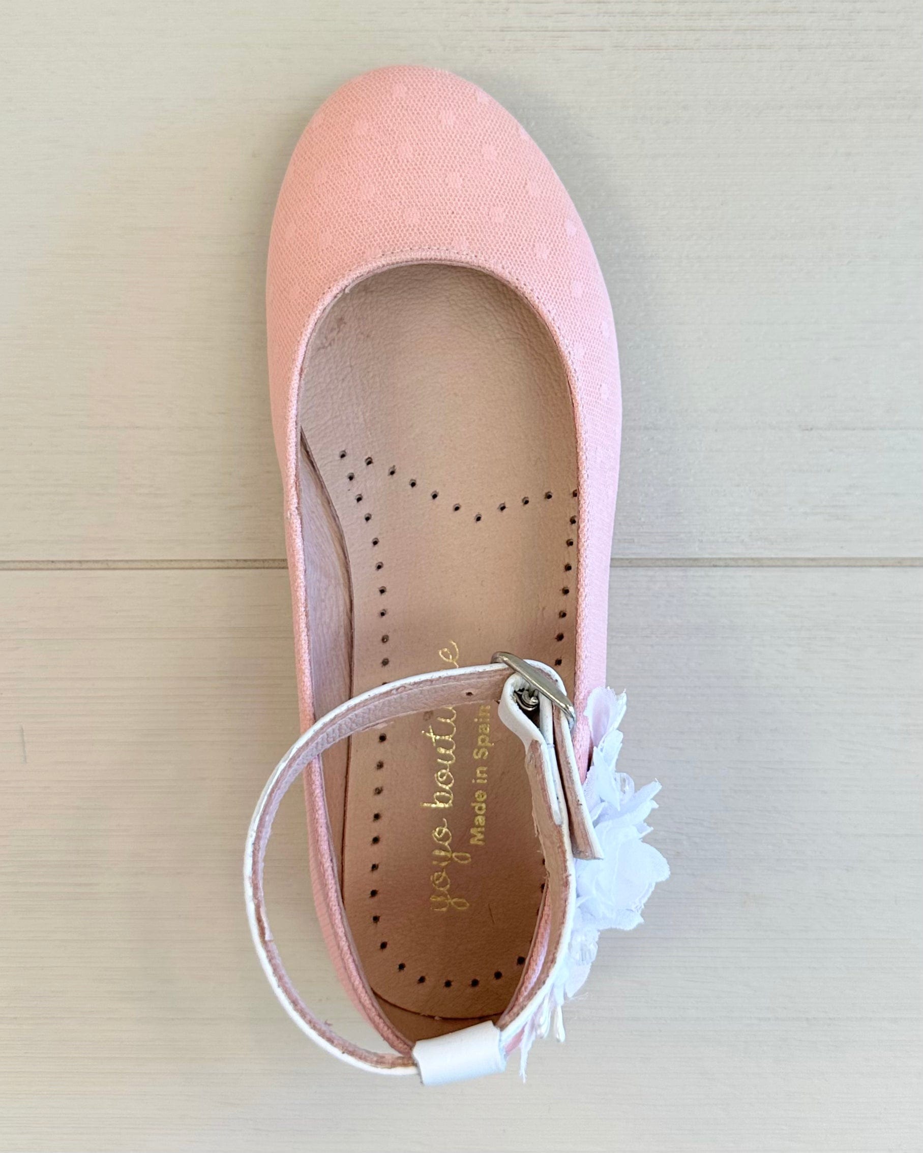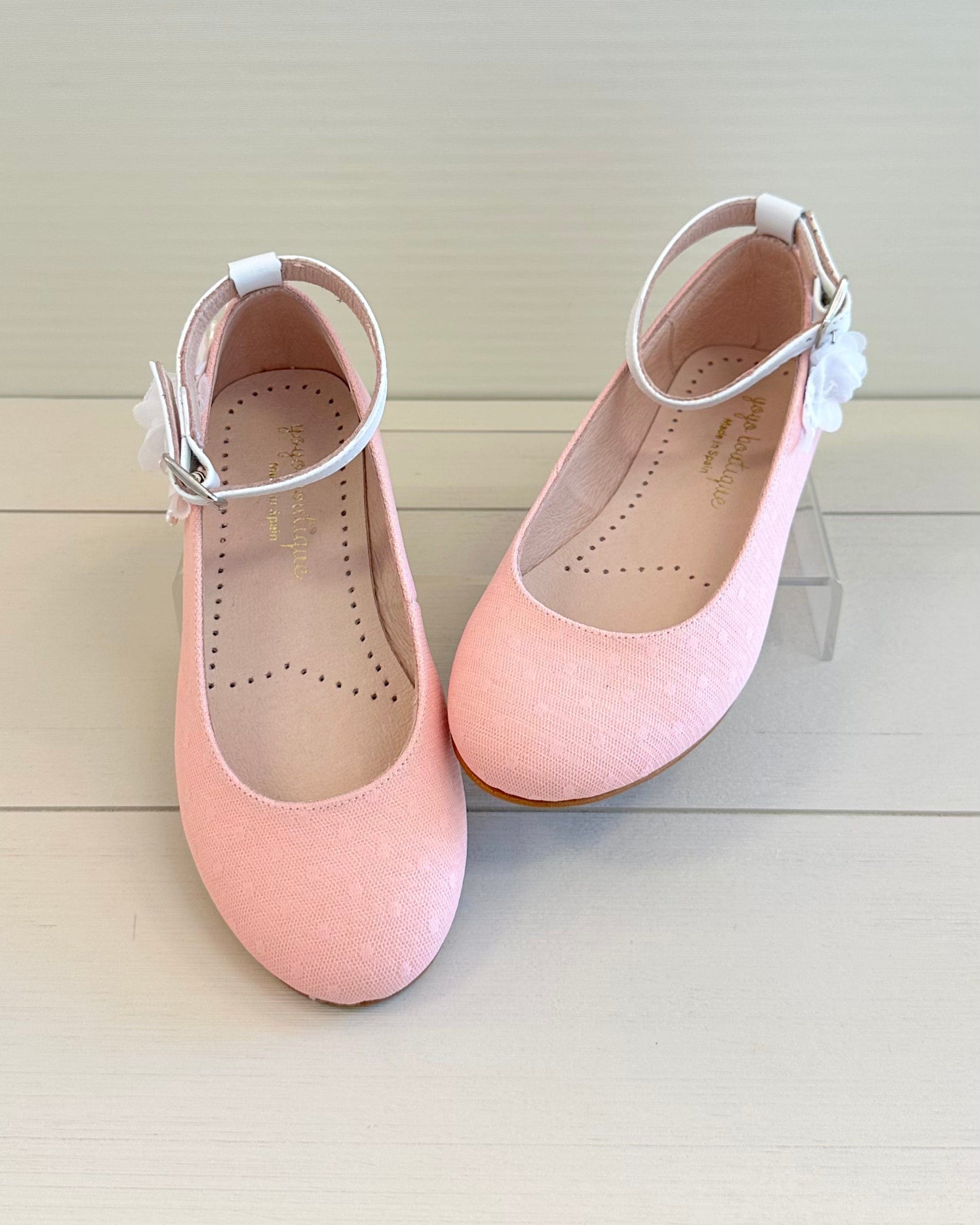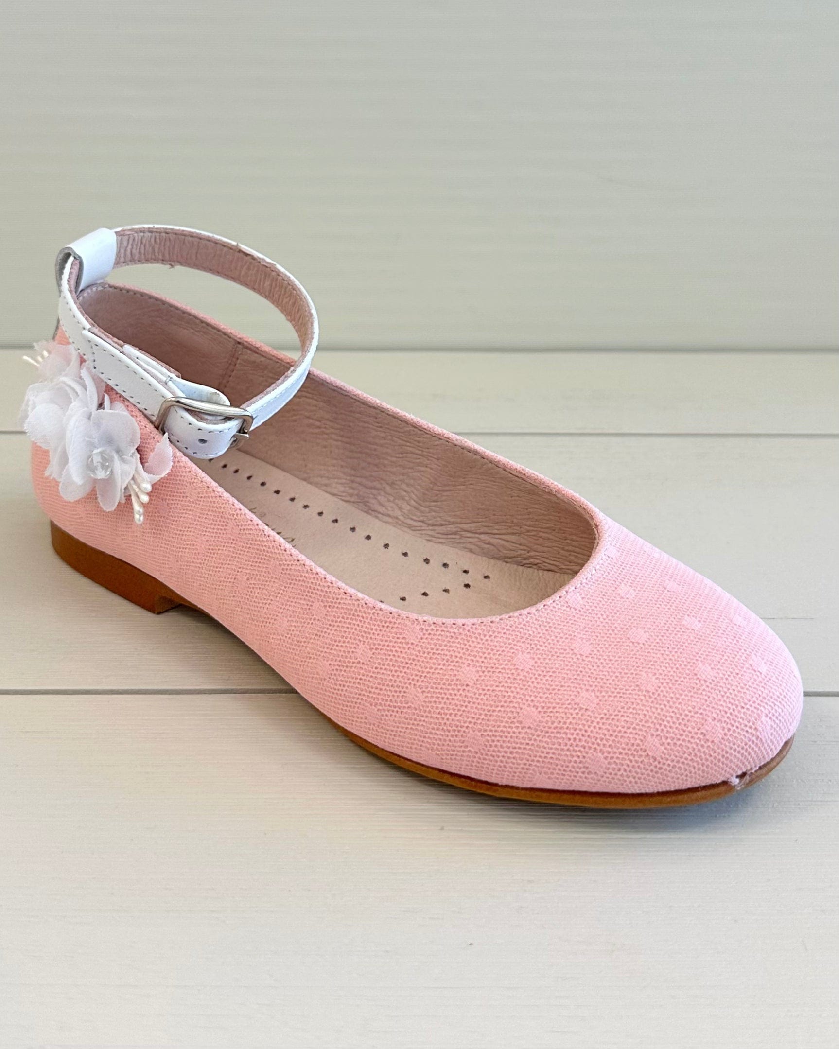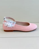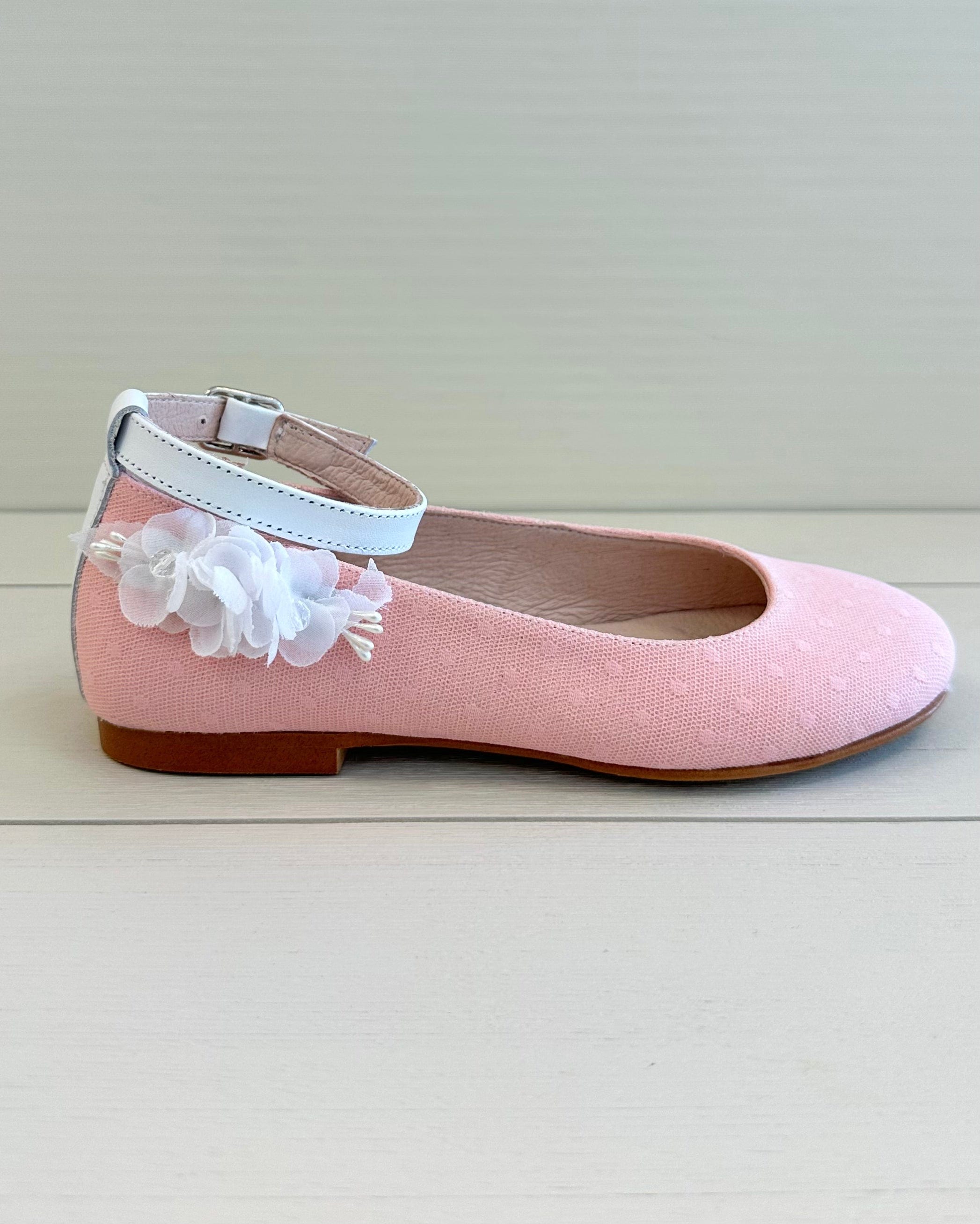 Add a touch of color and charm to your girl's special occasion look with our Coral Ballerina Shoe with Ankle Strap. Handcrafted in Spain, this elegant flat features a secure ankle strap for a comfortable fit and a classic round-toe silhouette. Made with care and quality, it's the perfect choice for weddings, birthdays, family celebrations, or any event where a little extra style is needed.