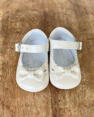 Our Pre-Walker Mary Jane in Pearl White is a sweet and delicate choice for baby girls during their earliest special moments. Beautifully handcrafted in Spain from soft genuine leather, this sole-free shoe features a classic Mary Jane strap, a dainty leather bow on the front, and decorative cut-out details across the vamp. Gentle on tiny feet and full of charm, it's perfect for christenings, baby showers, and memorable family celebrations.