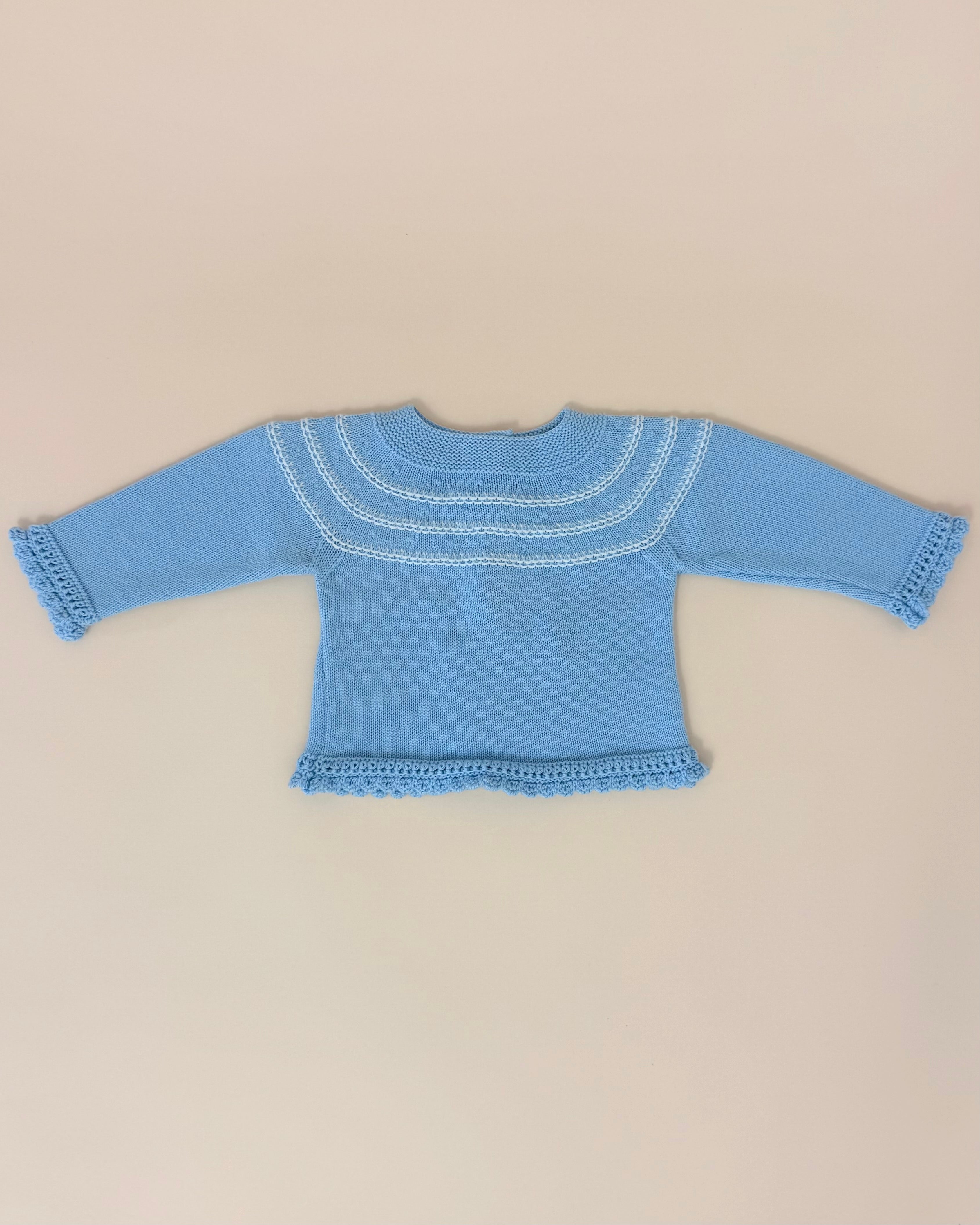 Refined and sweet, this blue knitted outfit with white collar accents is a perfect blend of modern style and traditional elegance, designed to welcome your baby boy with grace and comfort.