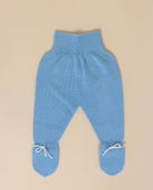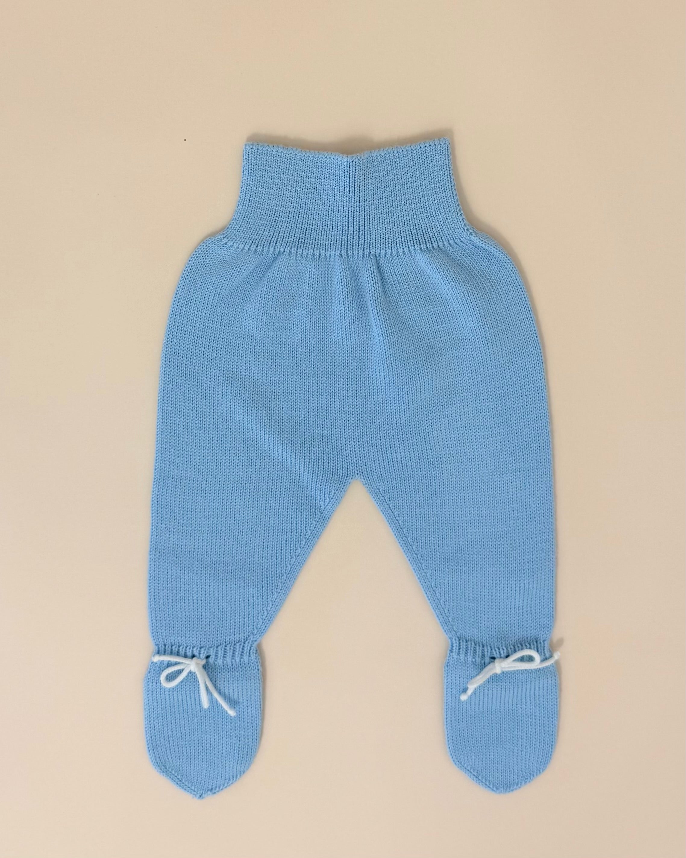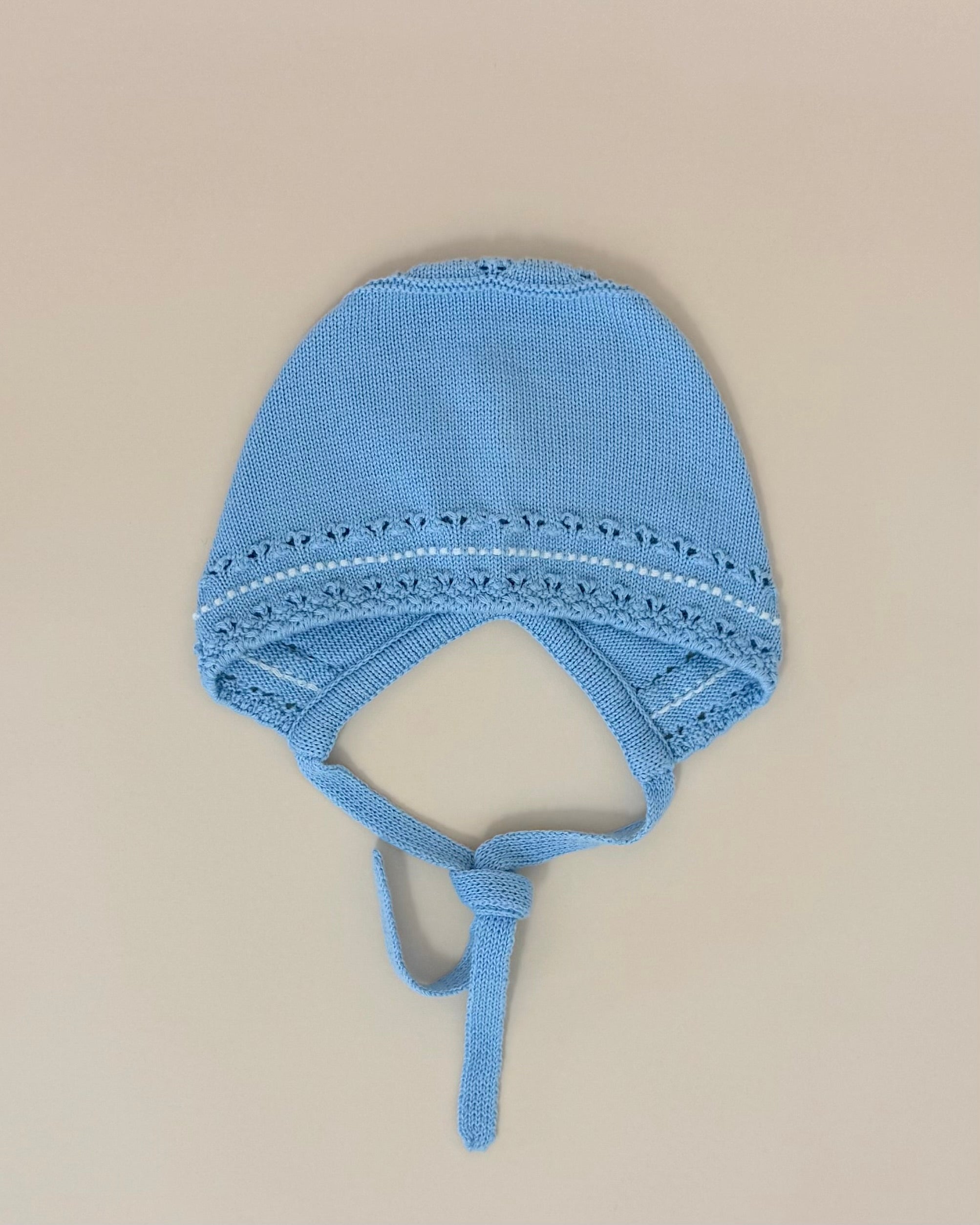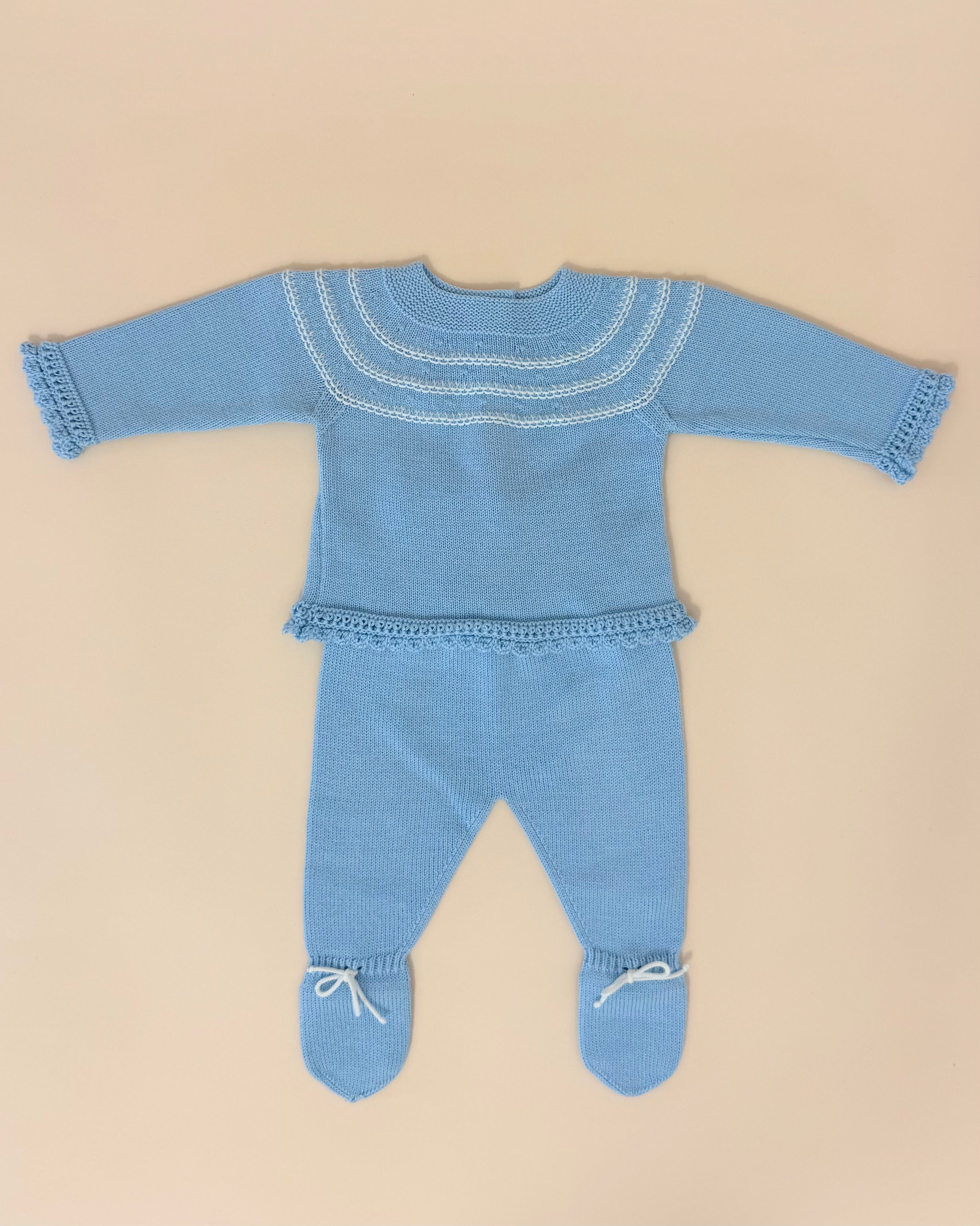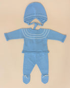 Handcrafted in Spain with exceptional attention to quality, the set includes a blue knitted top featuring delicate white detail on the collar and back button closure, matching footed pants, and a coordinated bonnet for a timeless and polished look.