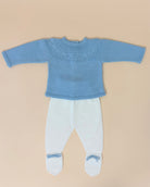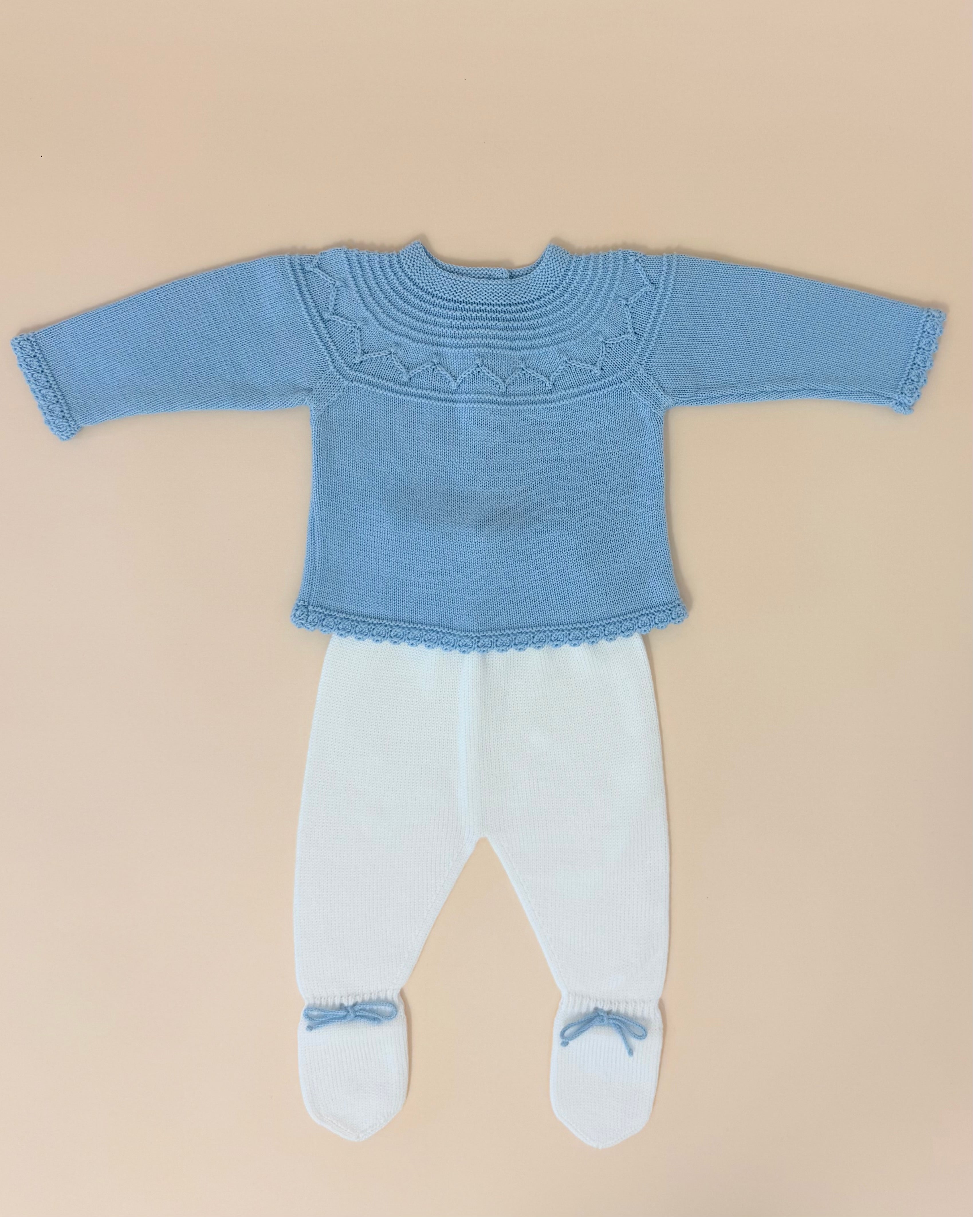 Timeless and refined, this blue and white knitted outfit is a perfect blend of modern style and traditional elegance, thoughtfully designed to welcome your baby boy in comfort and charm.