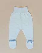 Handcrafted in Spain with exceptional quality, the set includes a blue knitted top with back button closure, white footed pants, and a coordinated blue bonnet—creating a classic, polished look for your little one’s first special moments.