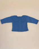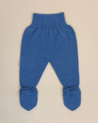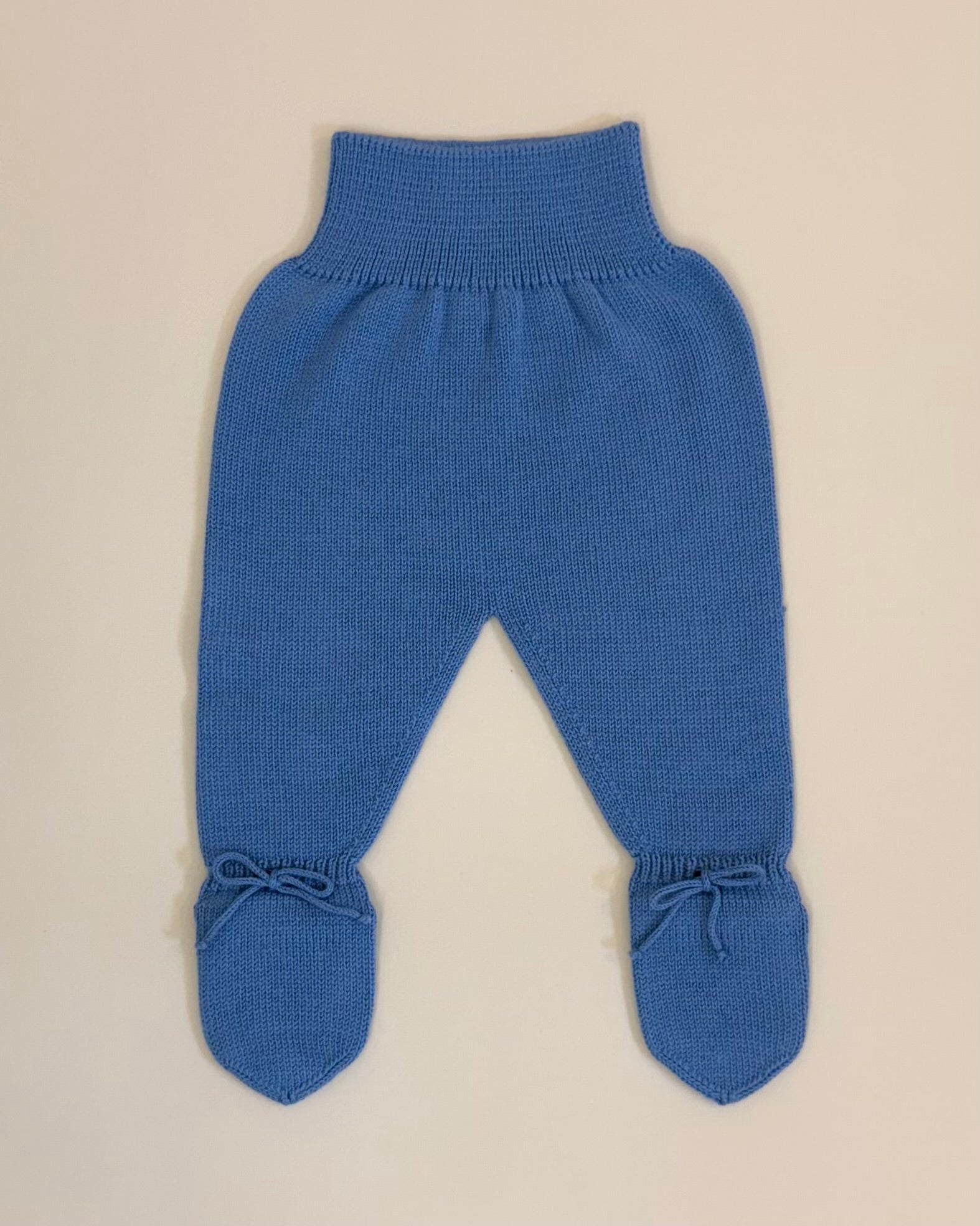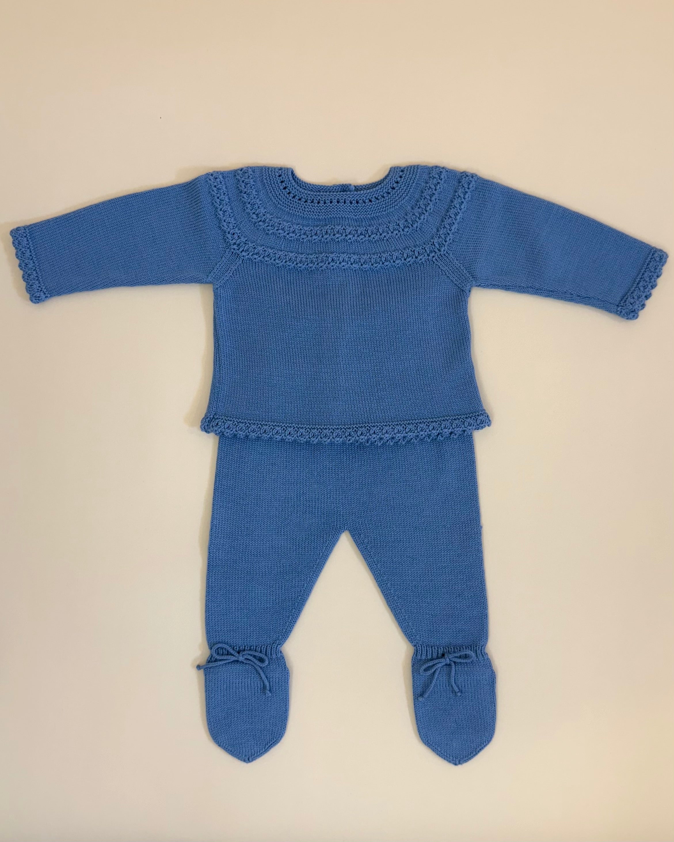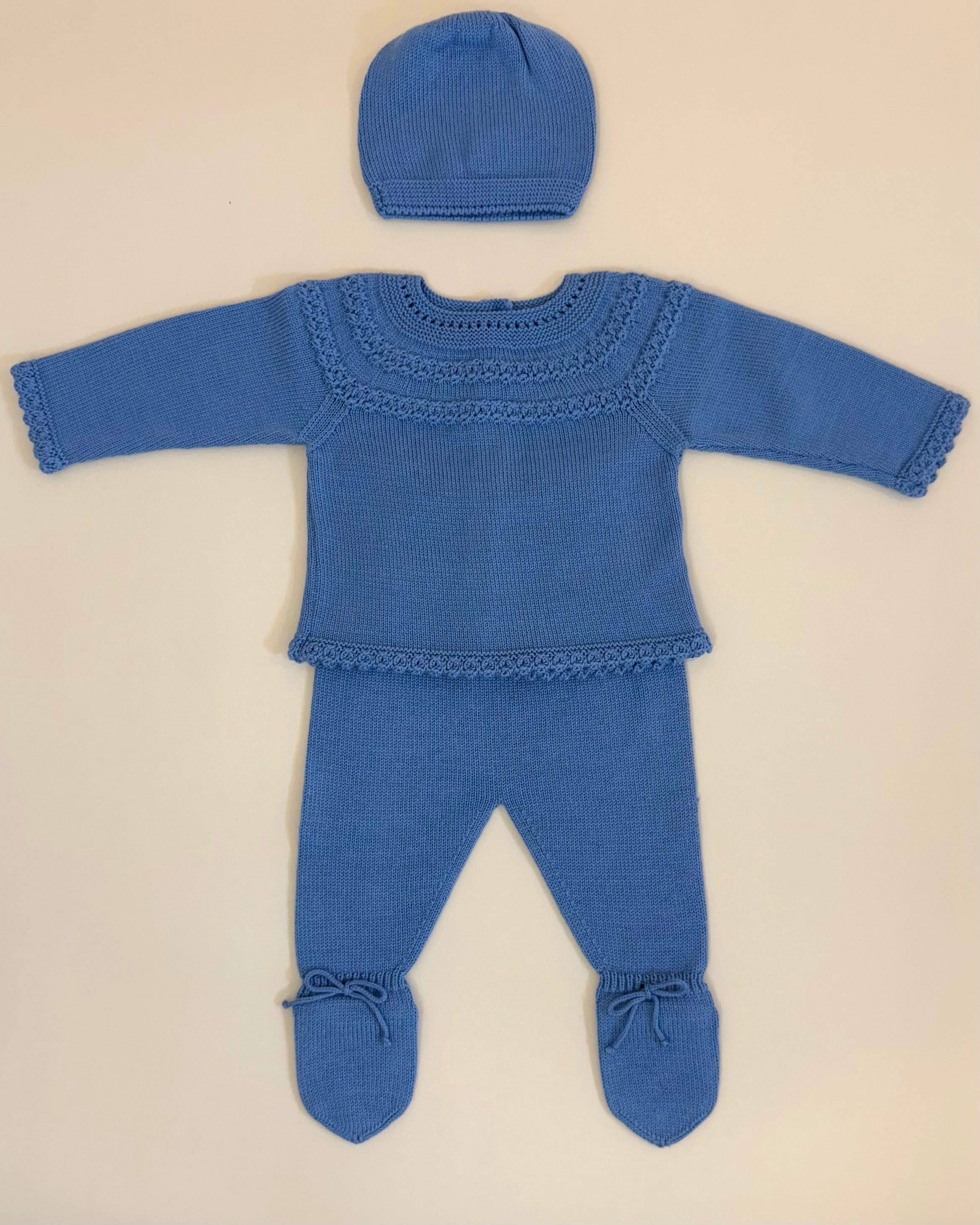 Handcrafted in Spain with premium craftsmanship, this set includes a denim blue knitted top with back button closure, footed pants, and a matching denim blue beanie for a simple yet refined look.