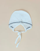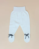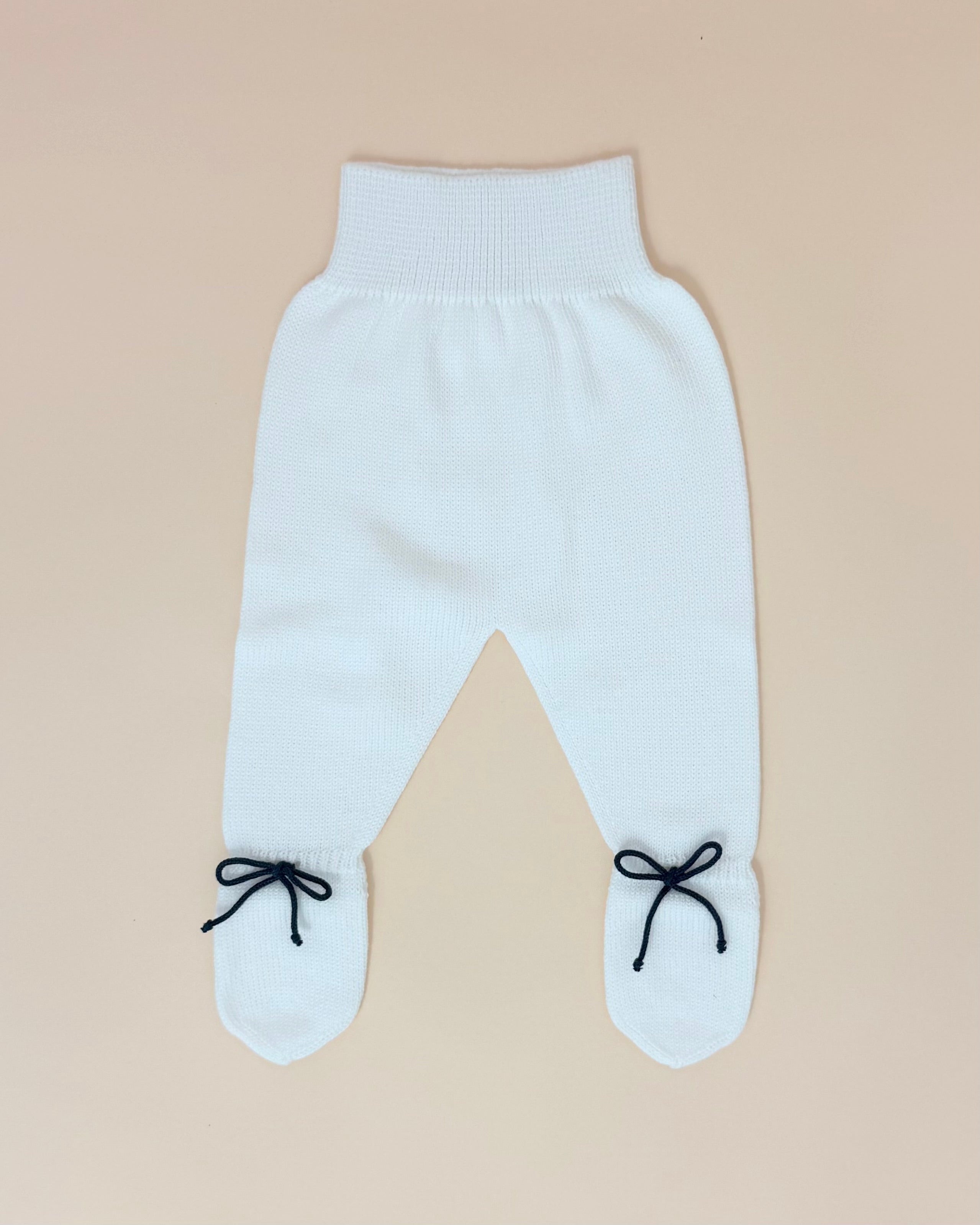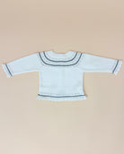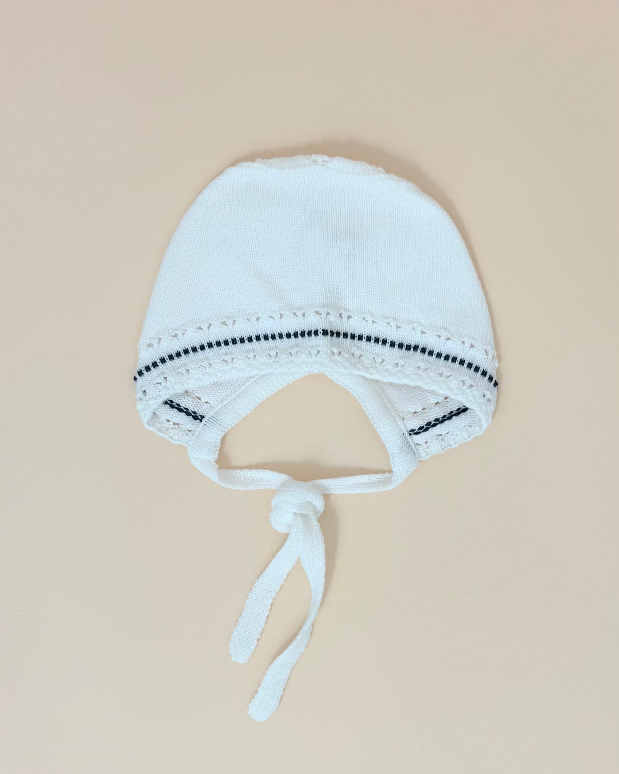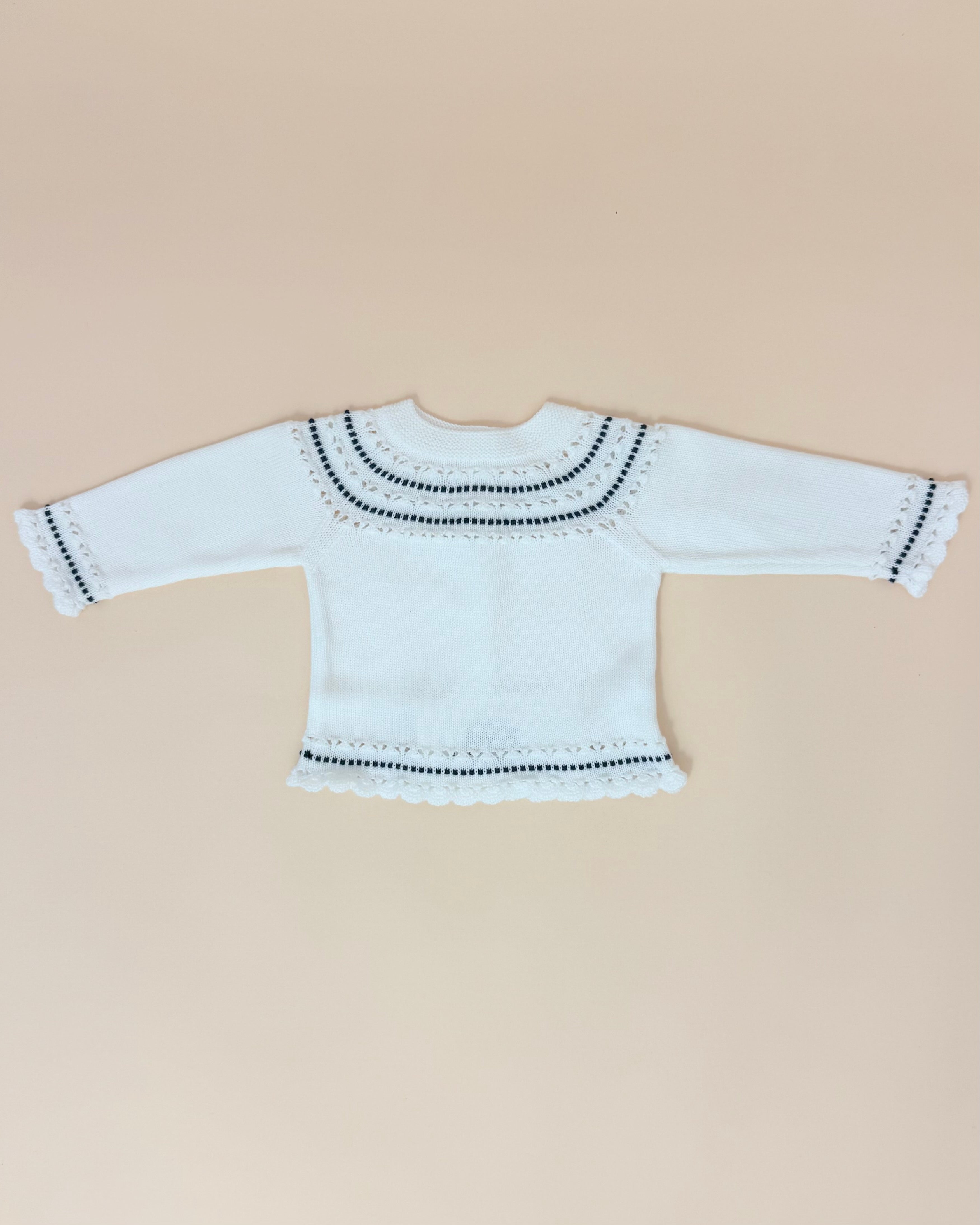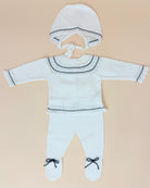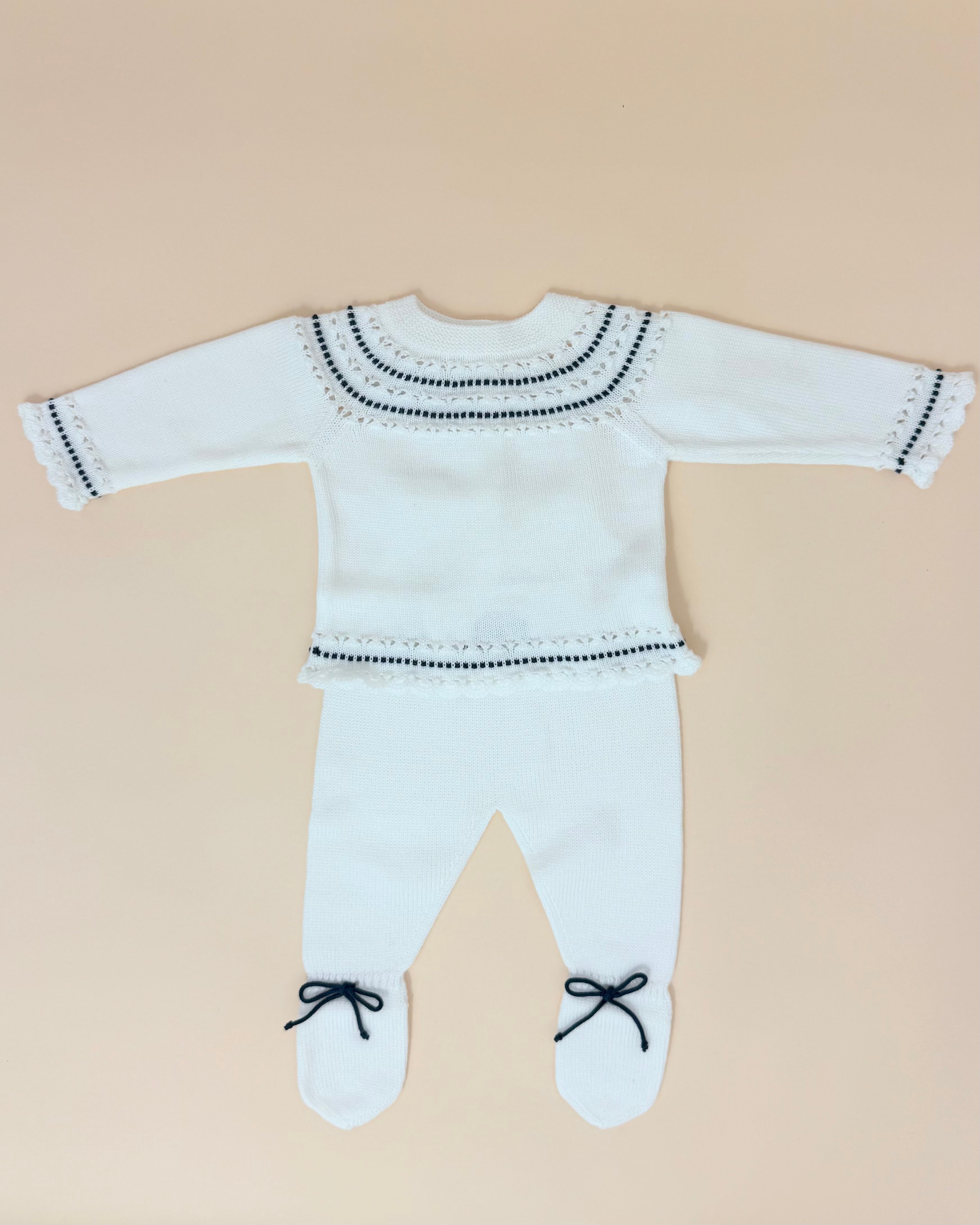 Classic and refined, this white knitted outfit with subtle navy blue accents is a timeless gender-neutral choice for your baby’s first days.