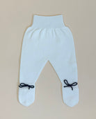 Handcrafted in Spain with exceptional attention to quality, the set includes a navy blue knitted top with back button closure, white footed pants, and a coordinated navy blue bonnet—a perfectly balanced ensemble for welcoming your little one in style.