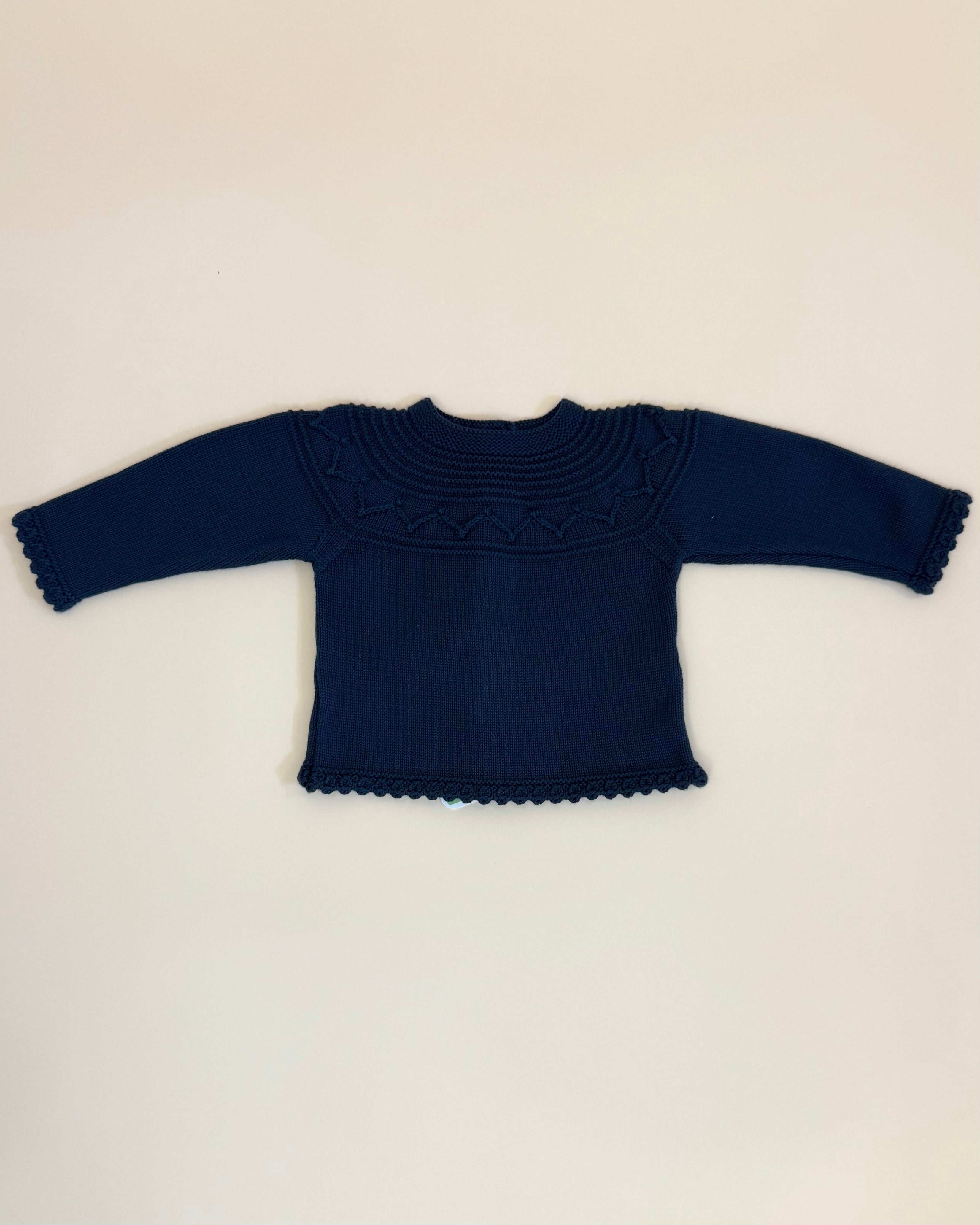 Elegant and versatile, this navy blue and white knitted outfit is a beautiful blend of modern simplicity and traditional charm, making it an ideal gender-neutral choice for your baby's first days.
