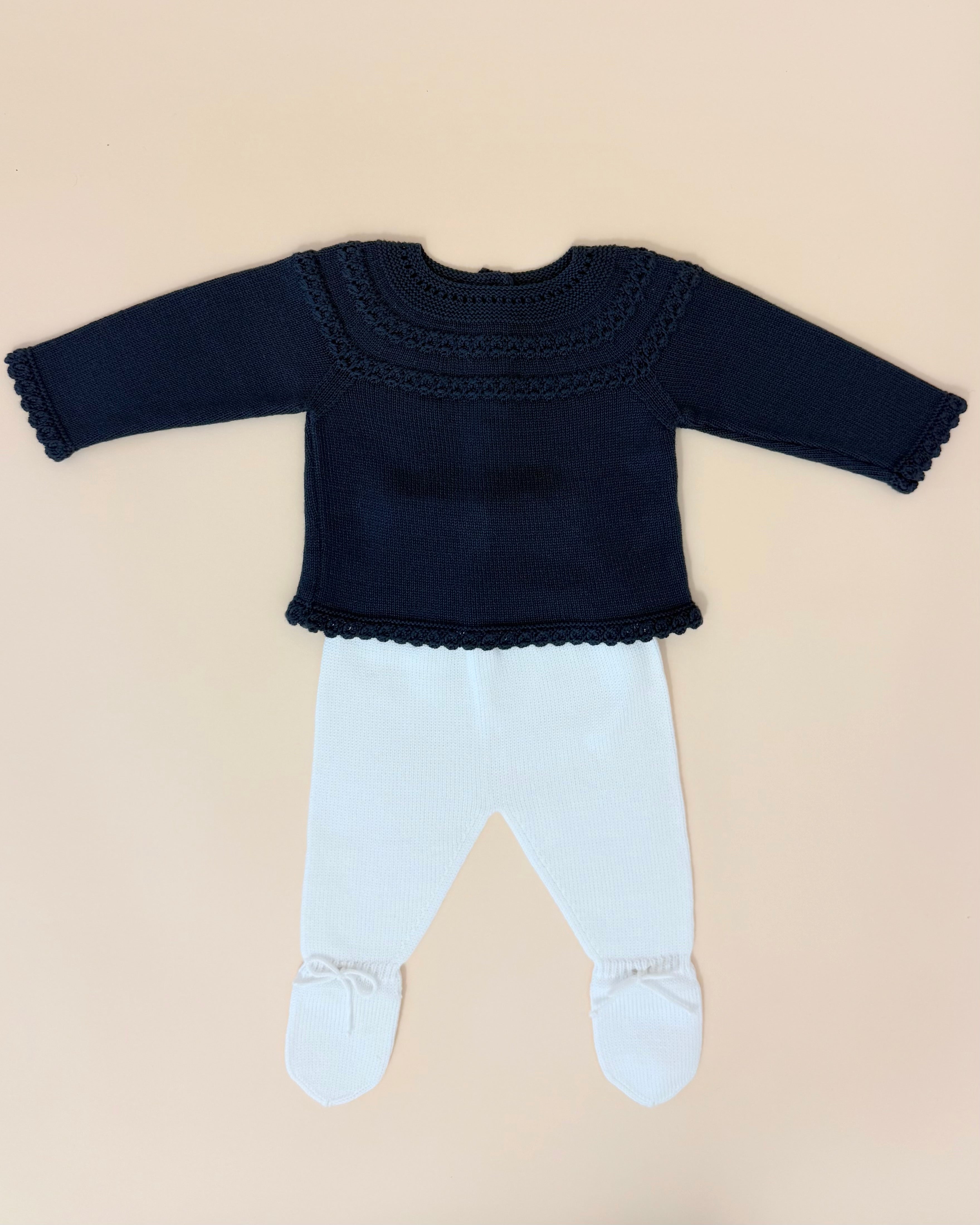 Handcrafted in Spain with exceptional quality and craftsmanship, the set includes a navy blue knitted top with back button closure, white footed pants, and a matching navy blue beanie—creating a clean and coordinated look ideal for those first special moments.