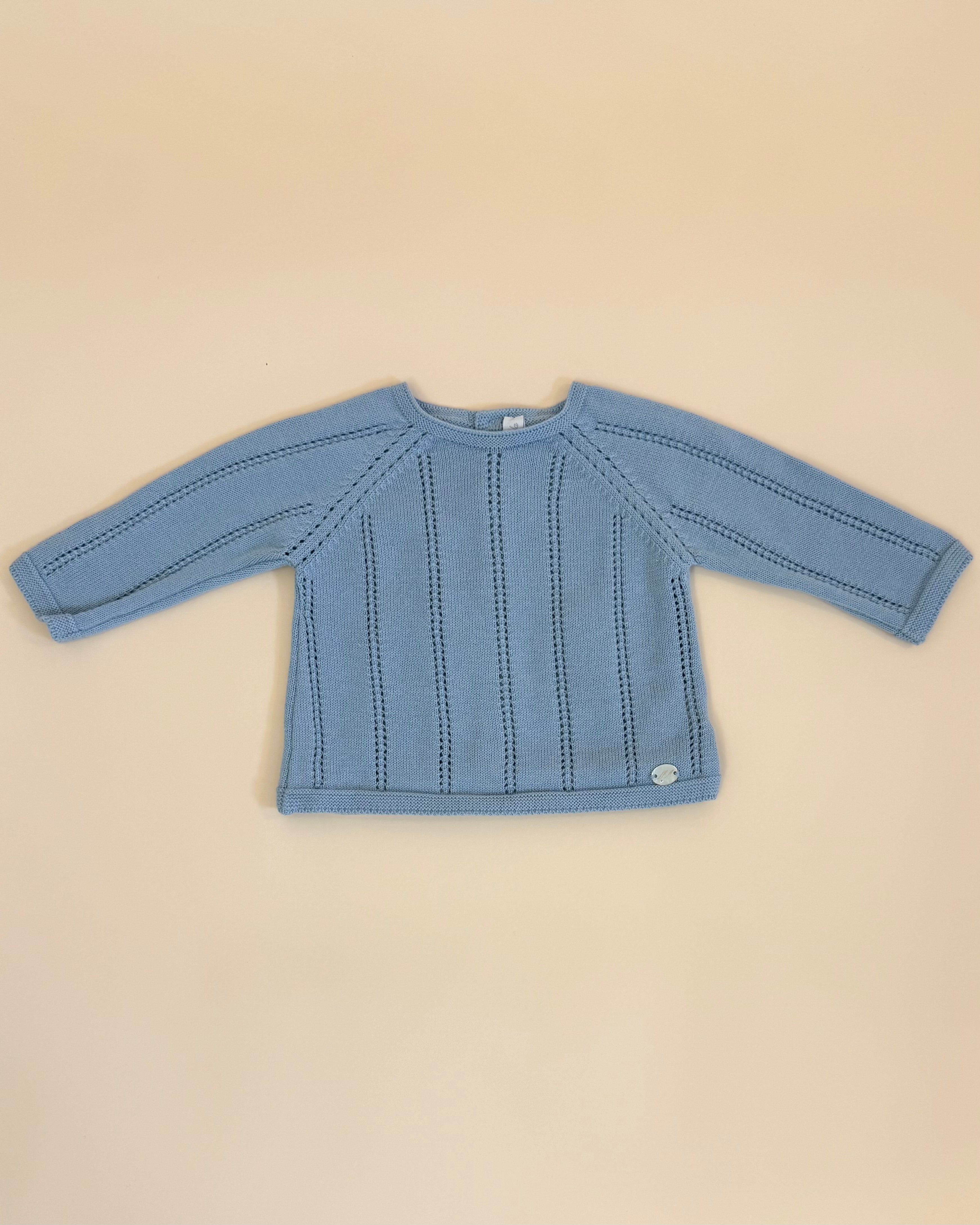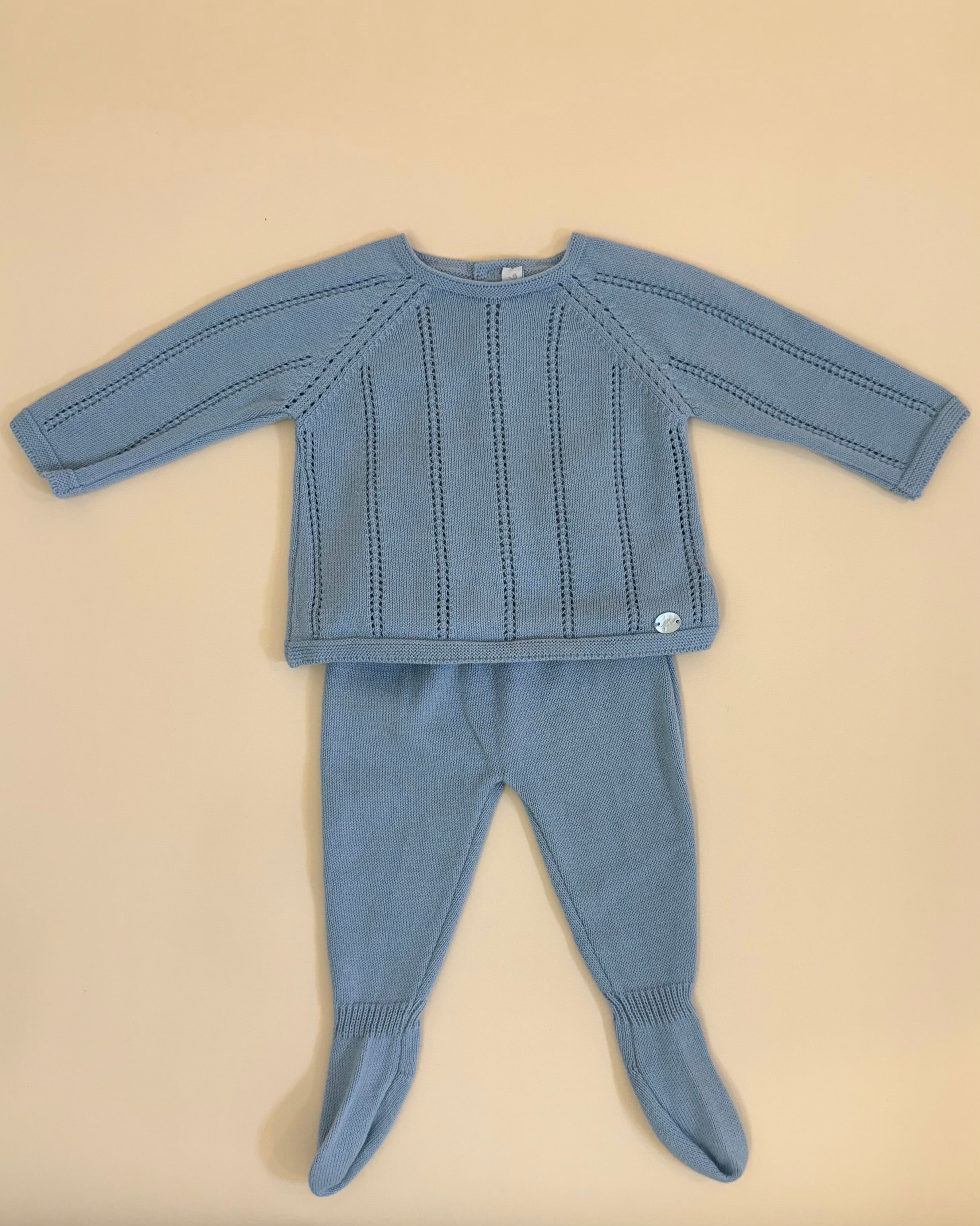 Understated and timeless, this cadet grey knitted outfit is a beautifully minimalist and traditional choice for welcoming your baby boy in style and comfort.