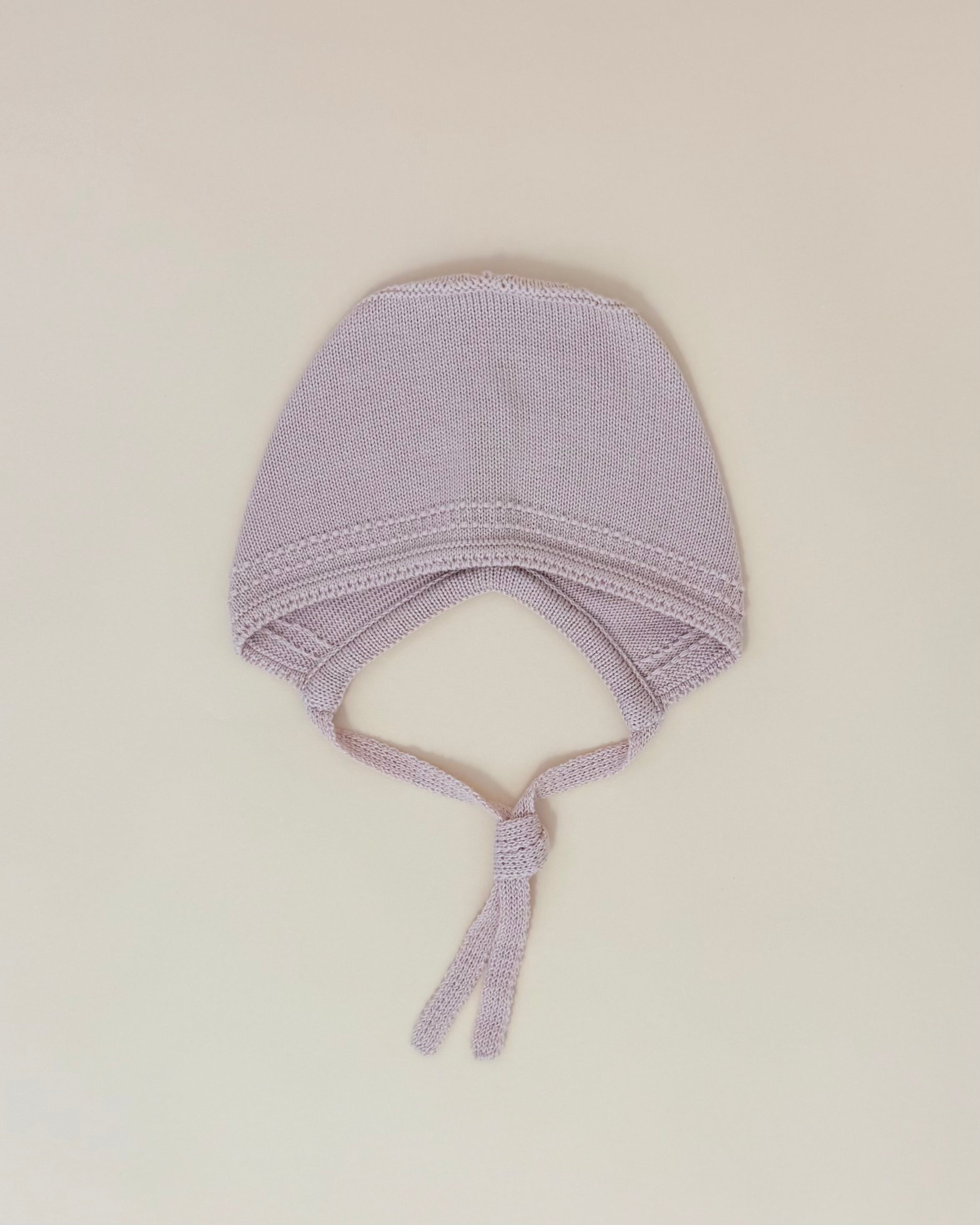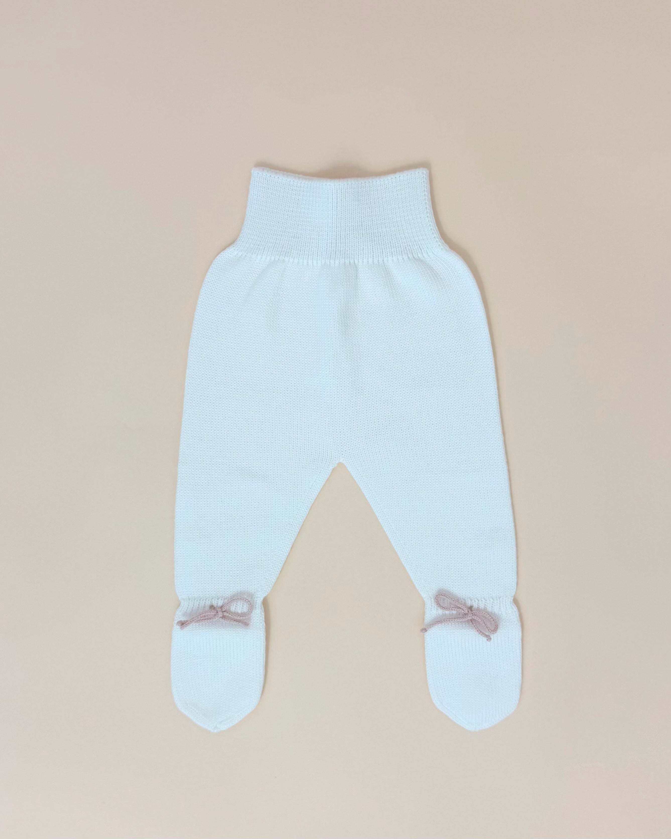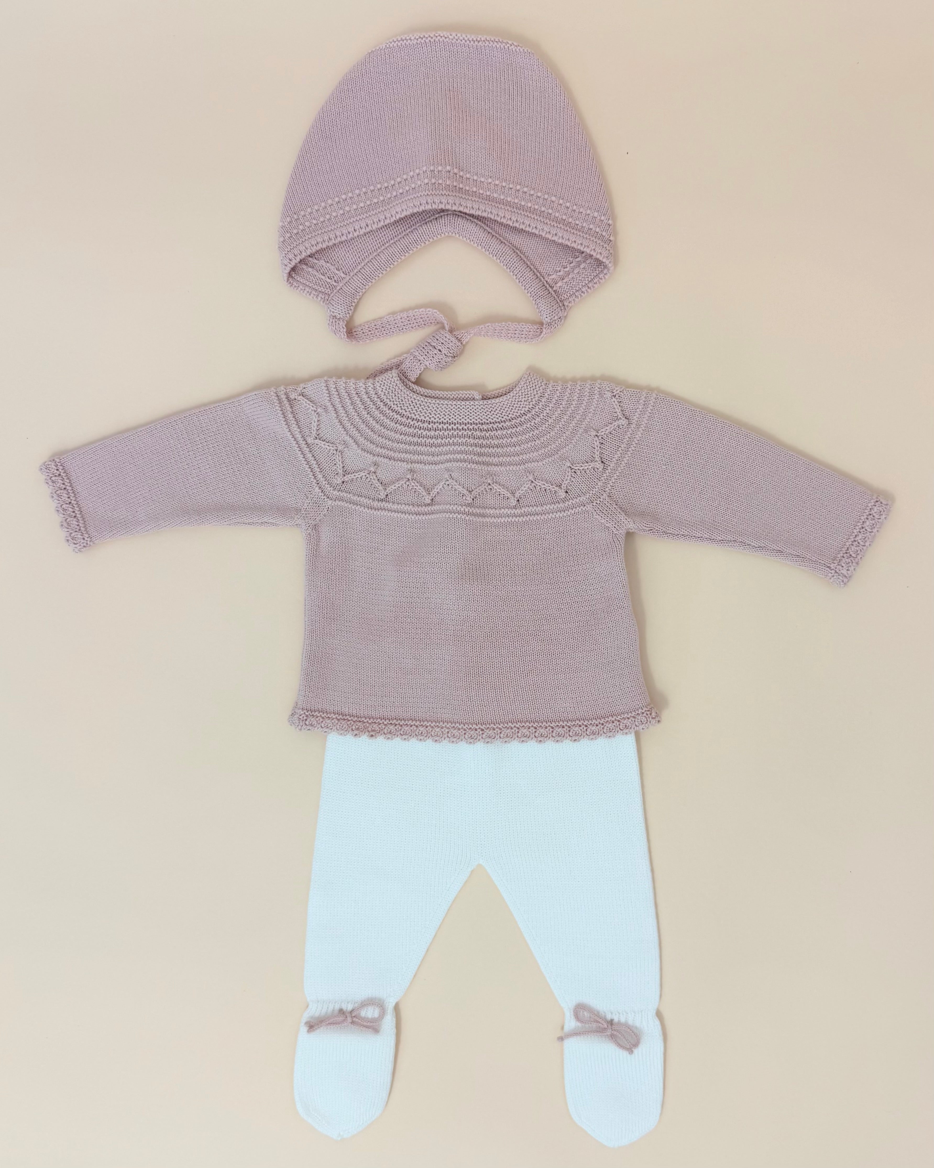 Handcrafted in Spain with exquisite attention to detail, the set includes a dusty rose knitted top with back button closure, white footed pants, and a matching dusty rose bonnet—creating a delicate and coordinated look for her first special moments.