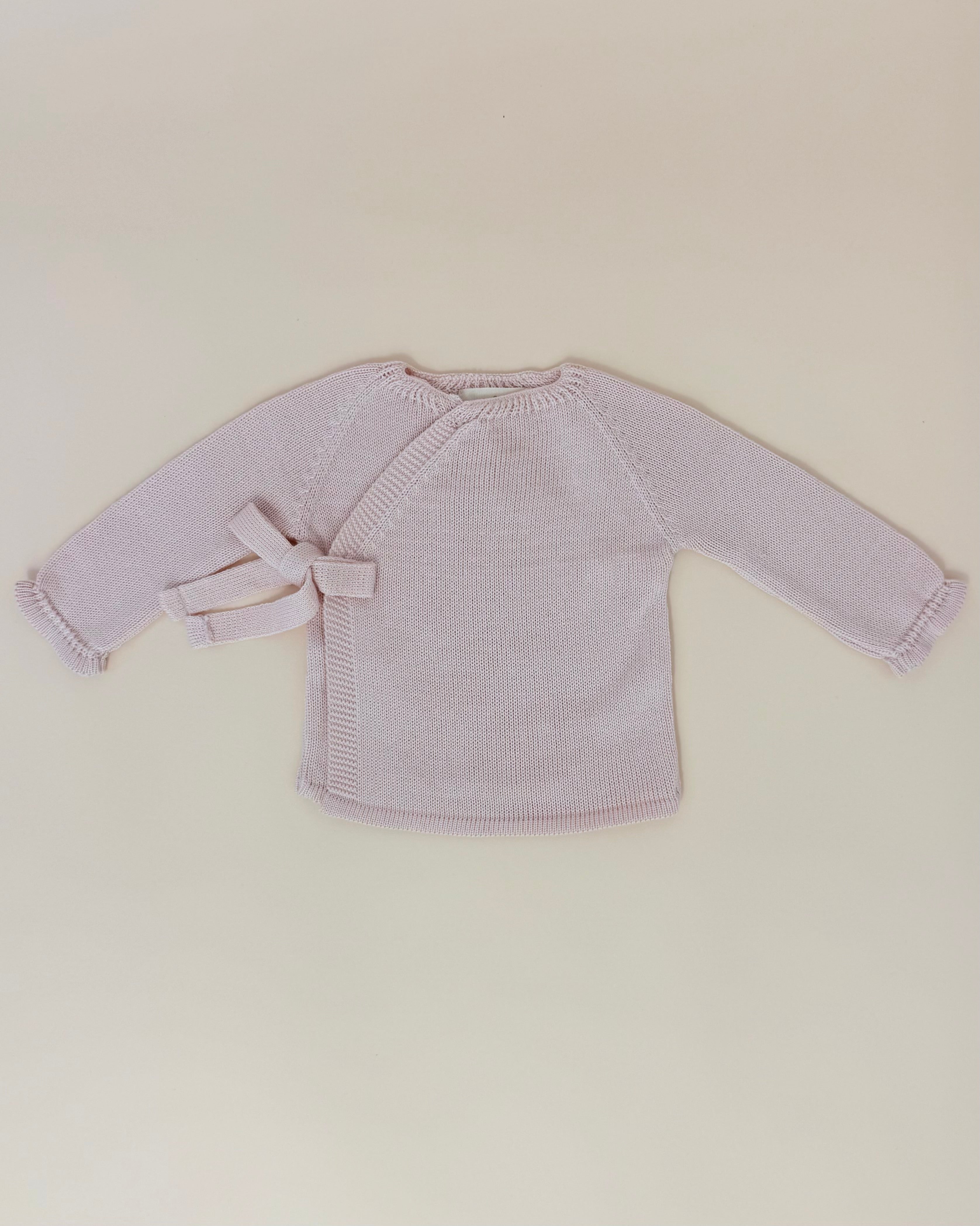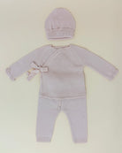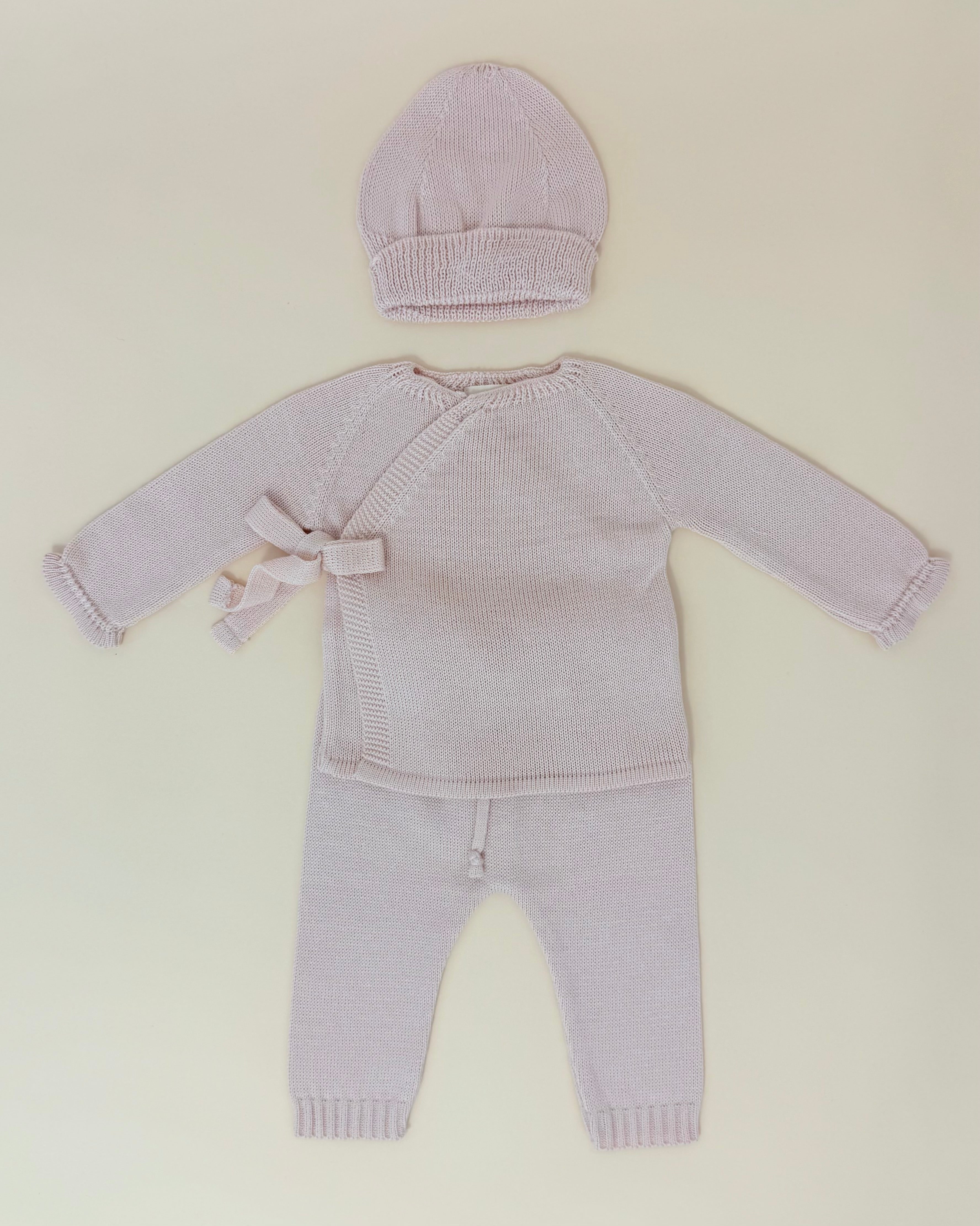 Elegant in its simplicity, this three-piece set in a soft nude tone is a beautifully gender-neutral option for newborns. Thoughtfully designed for comfort and ease, the set includes a kimono-style top that ties gently at the front with a delicate knot—ideal for dressing your baby without the need to pull clothing over the head.