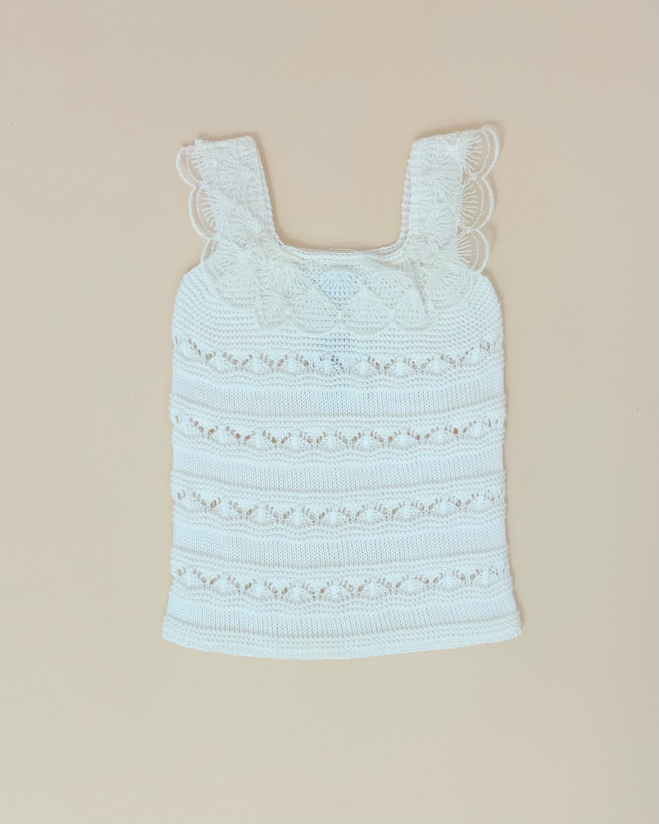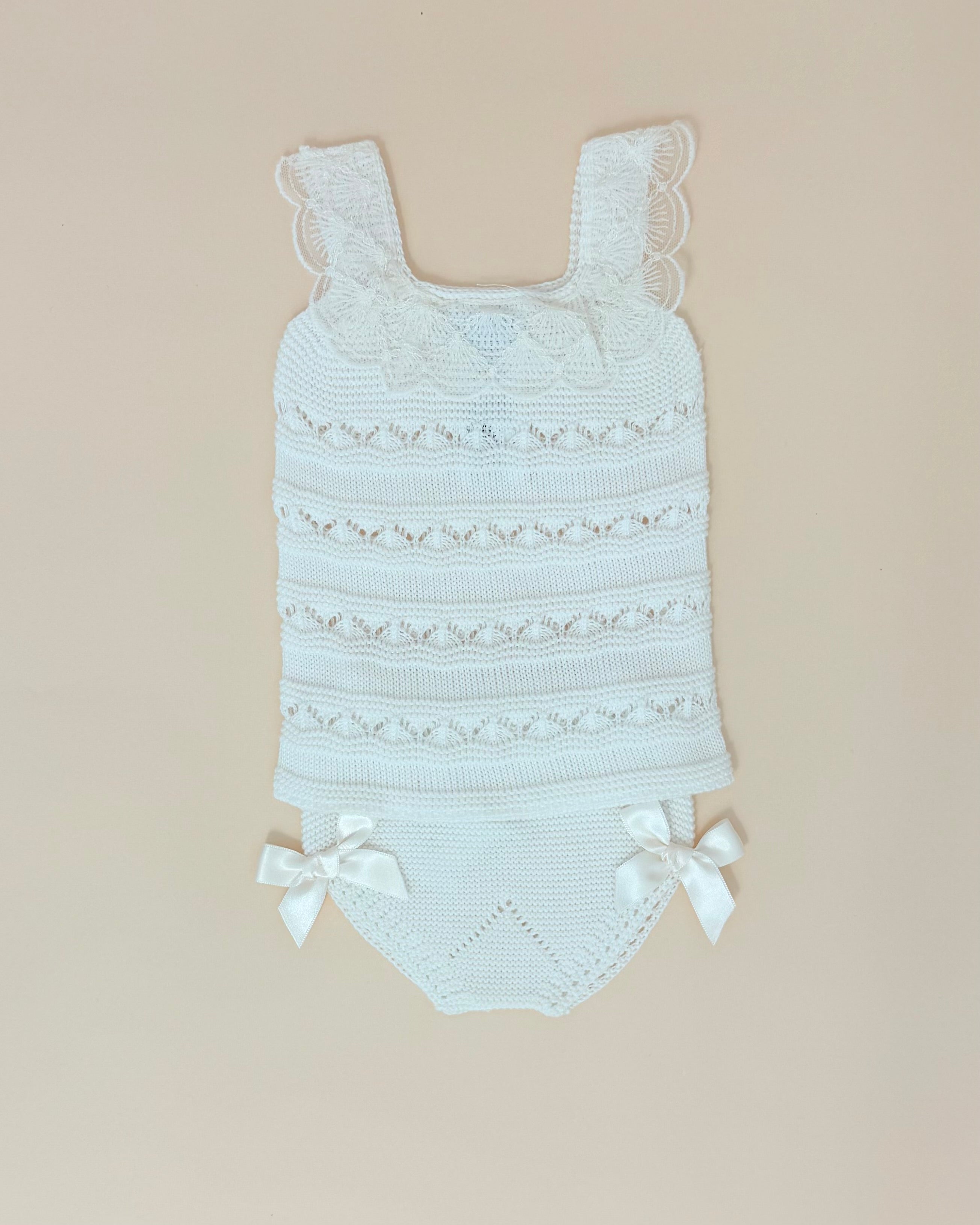 Delicate and effortlessly charming, this two-piece set for baby girls is a beautiful choice for warm days and special moments. The sleeveless top is crafted in soft off-white fabric and features an elegant lace trim along the collar, adding a touch of timeless femininity.
