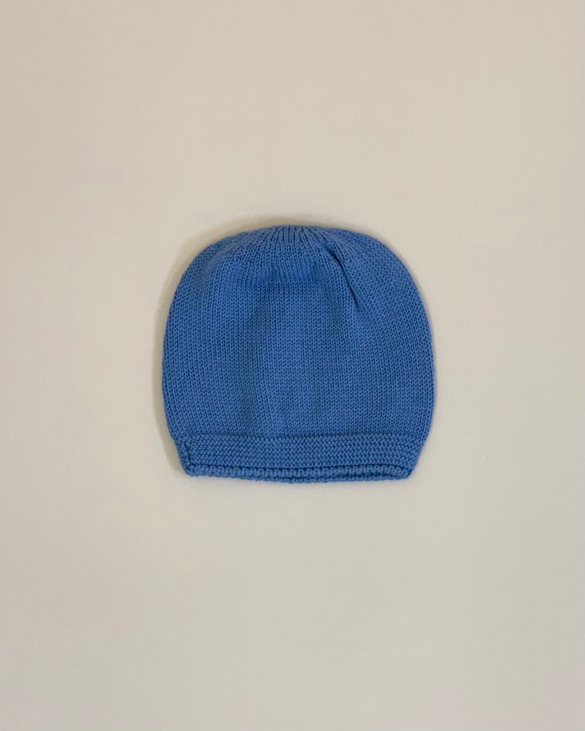 Handcrafted in Spain with premium craftsmanship, this set includes a denim blue knitted top with back button closure, footed pants, and a matching denim blue beanie for a simple yet refined look.