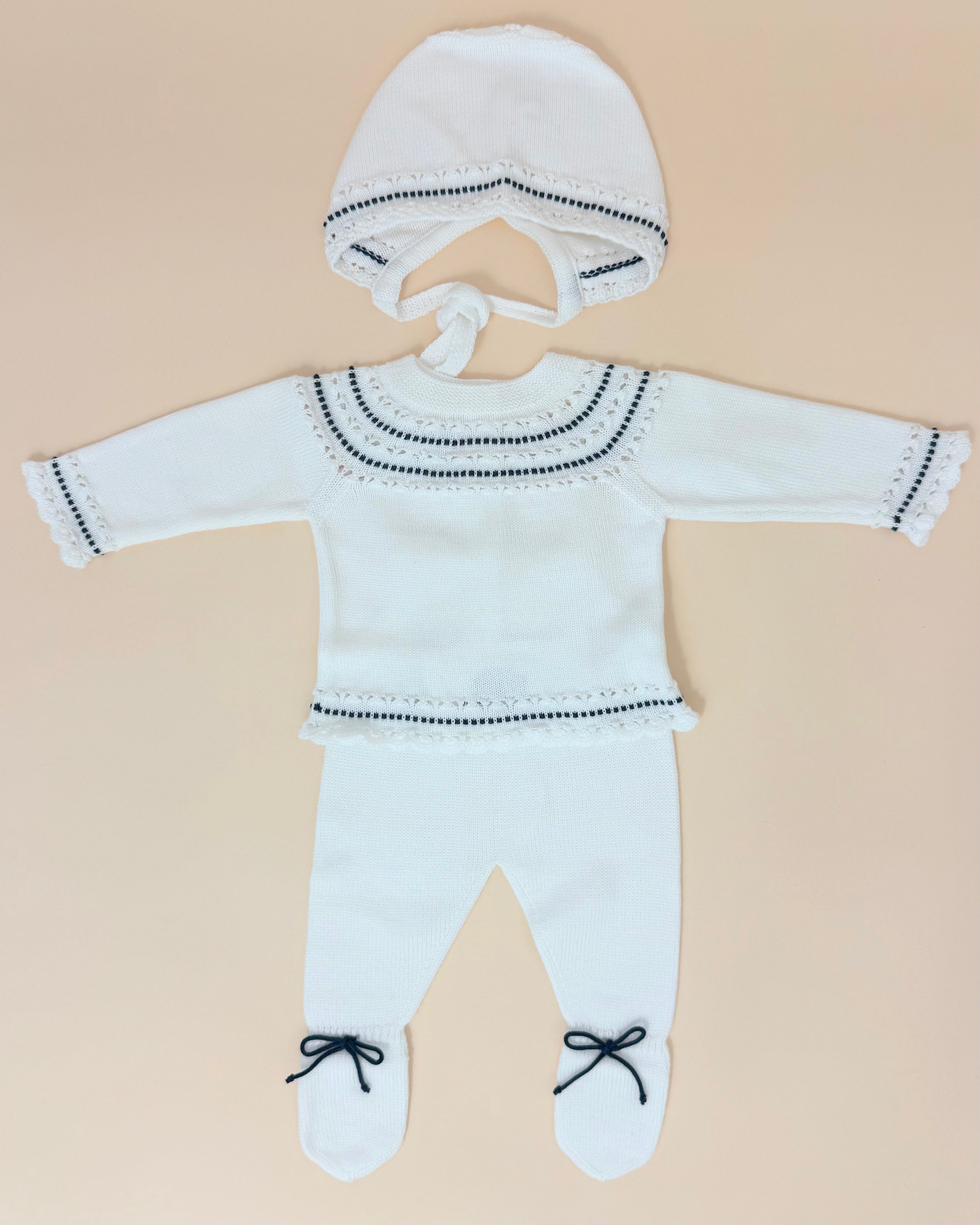Classic and refined, this white knitted outfit with subtle navy blue accents is a timeless gender-neutral choice for your baby’s first days.