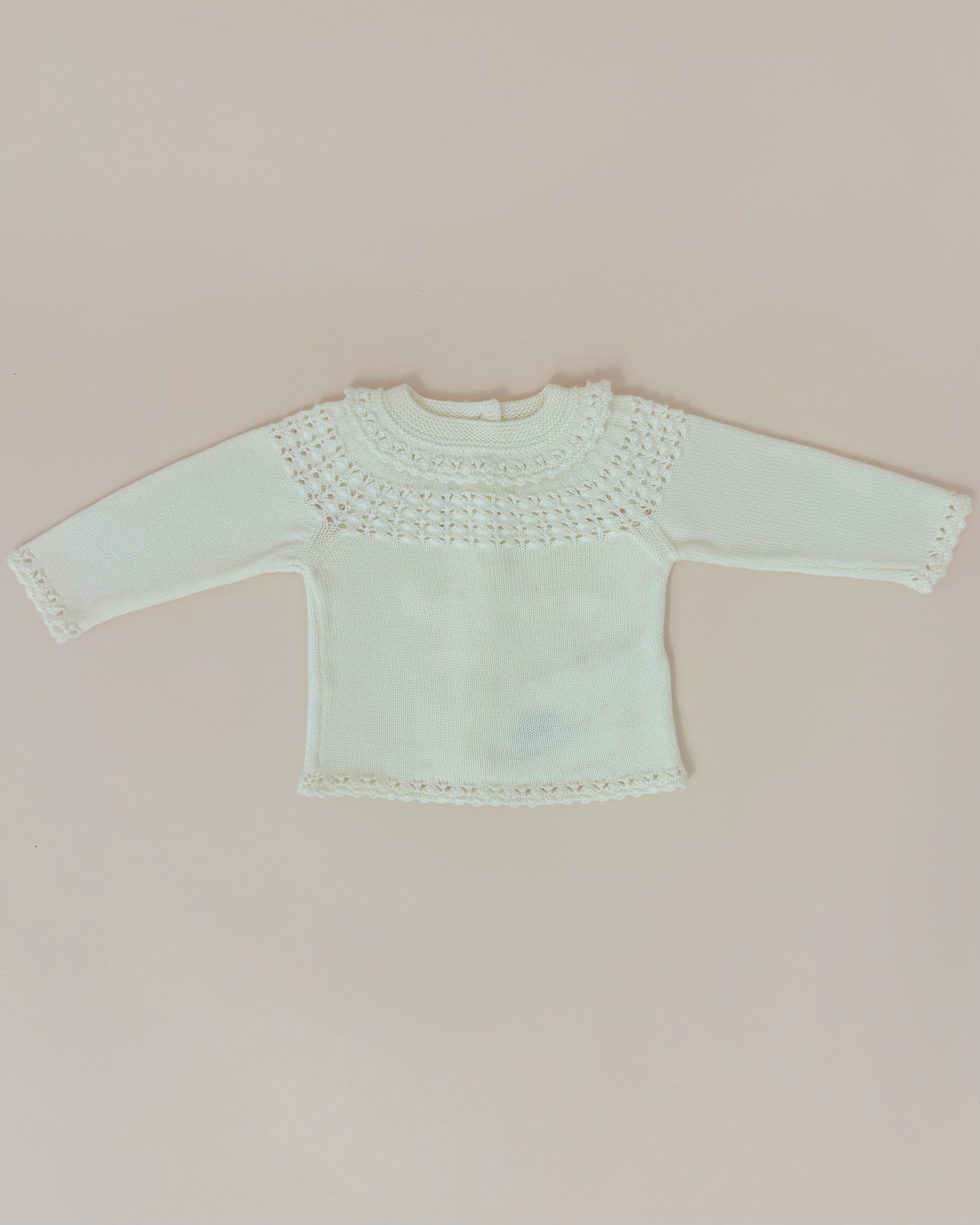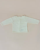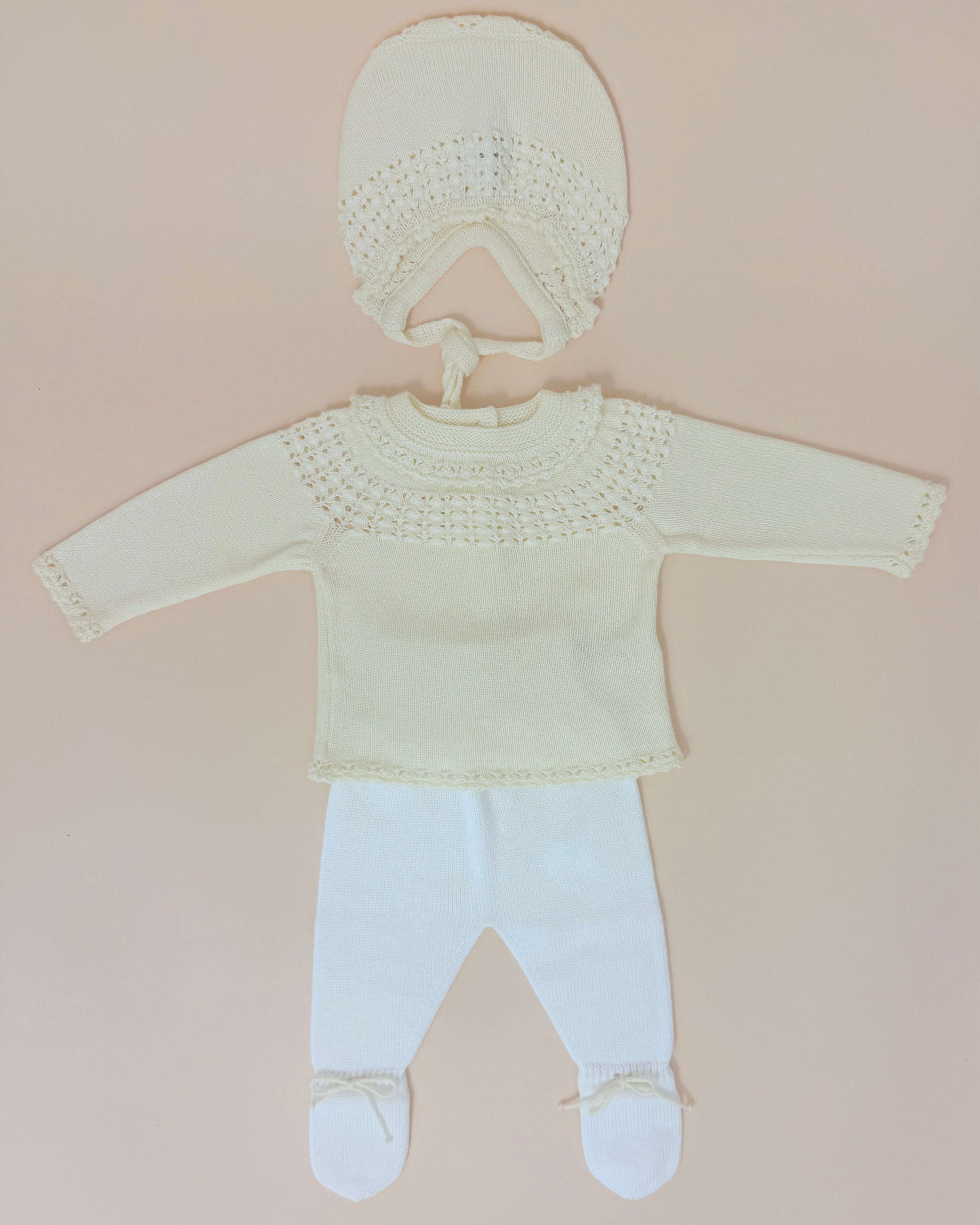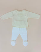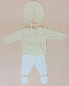 Soft, cheerful, and timeless—this light yellow and white knitted outfit is a lovely gender-neutral choice to welcome your little one.