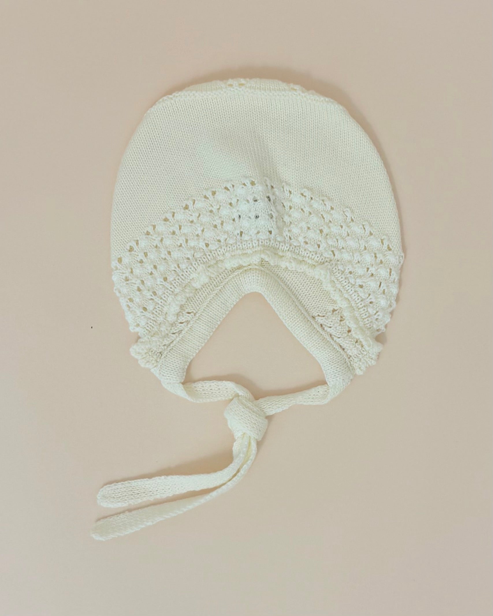 Handcrafted in Spain with care and precision, this charming set includes a light yellow top with back button closure, white pants, and a matching yellow bonnet for a complete, coordinated look.