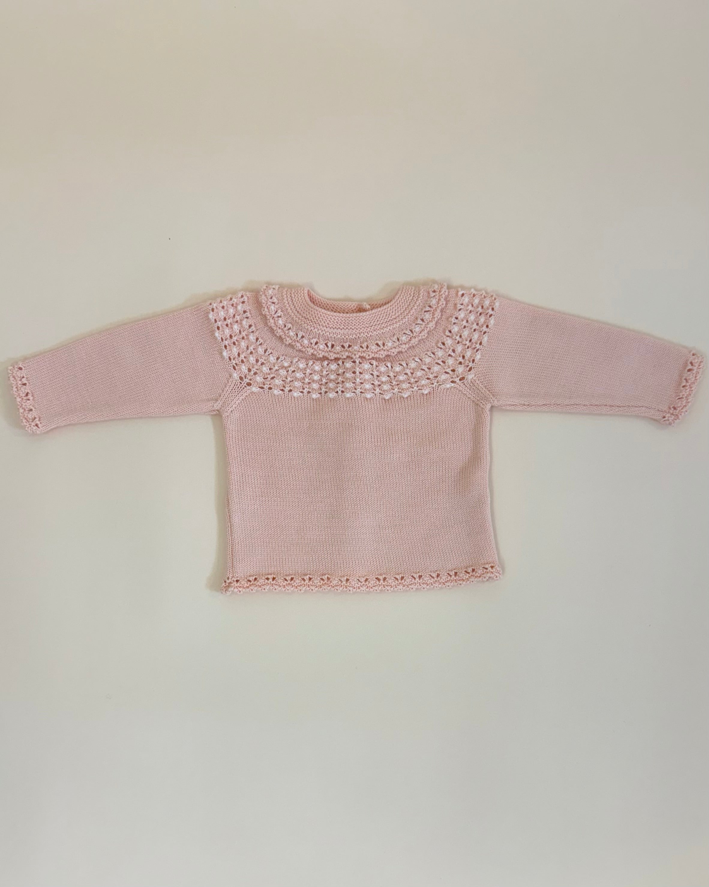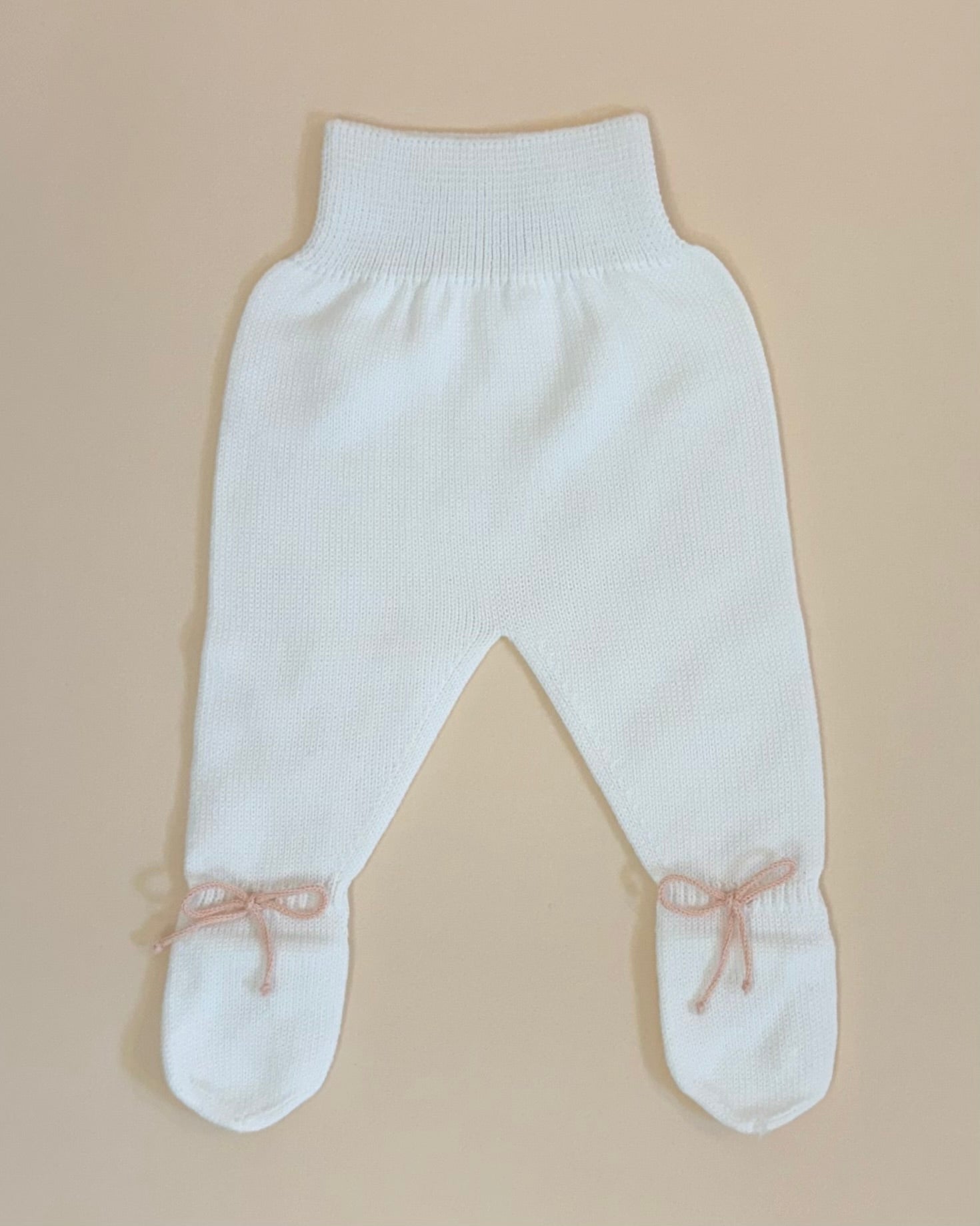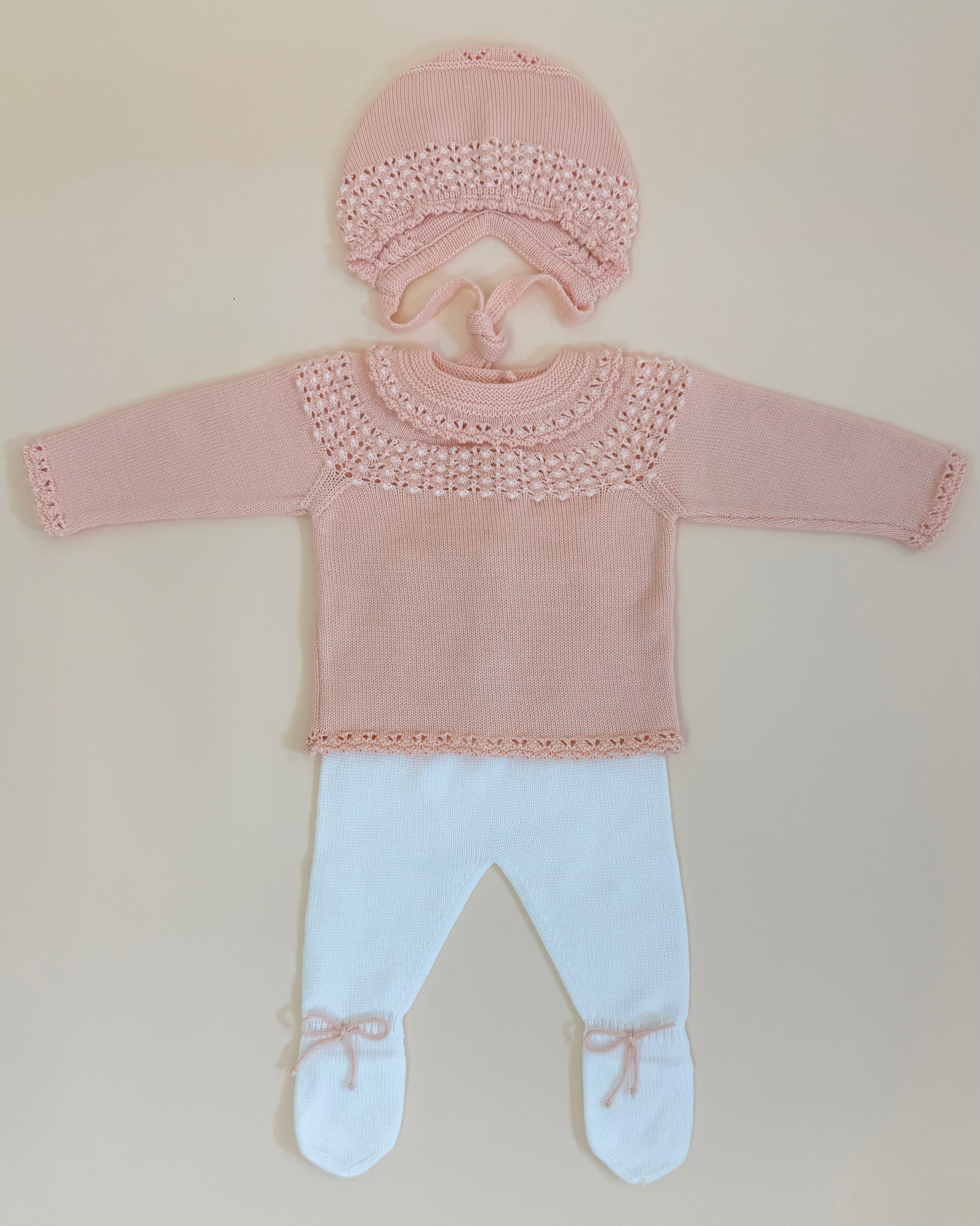 Delicate and timeless, this peach and white knitted outfit is a traditional and graceful choice to welcome your baby girlinto the world.