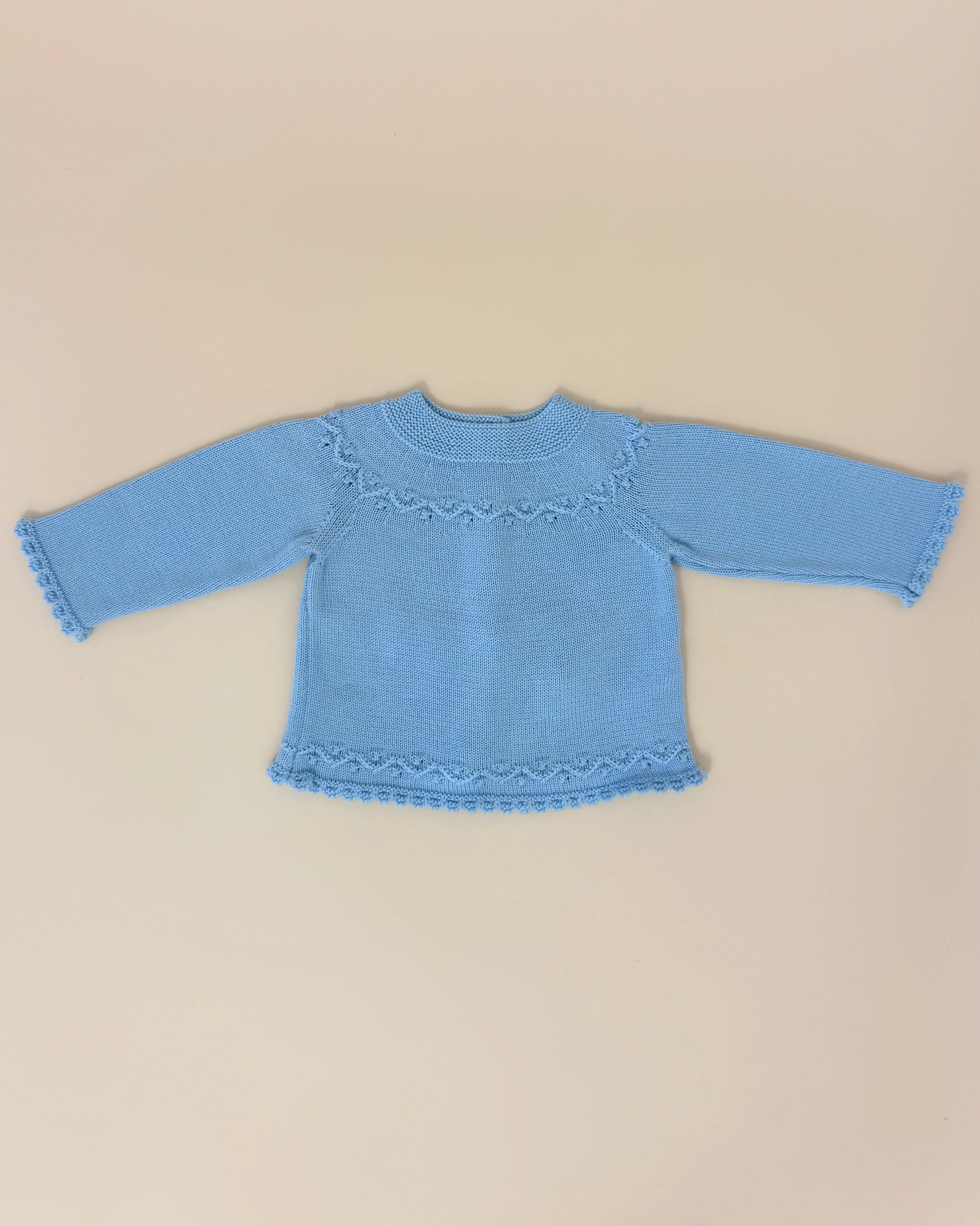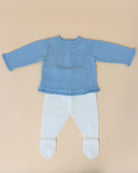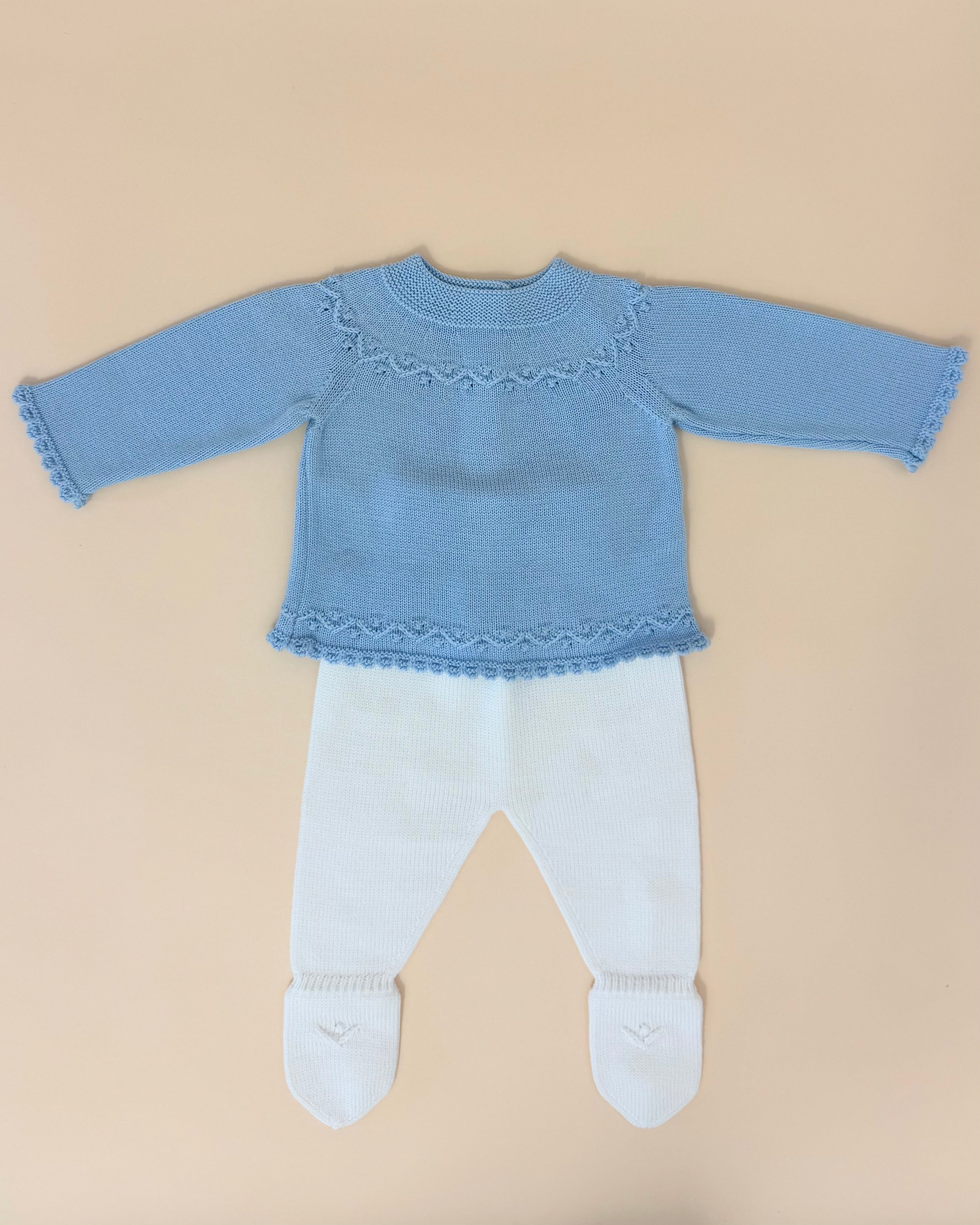 Sweet and timeless, this baby blue and white knitted outfit is a classic choice to welcome your baby boy with elegance and care.