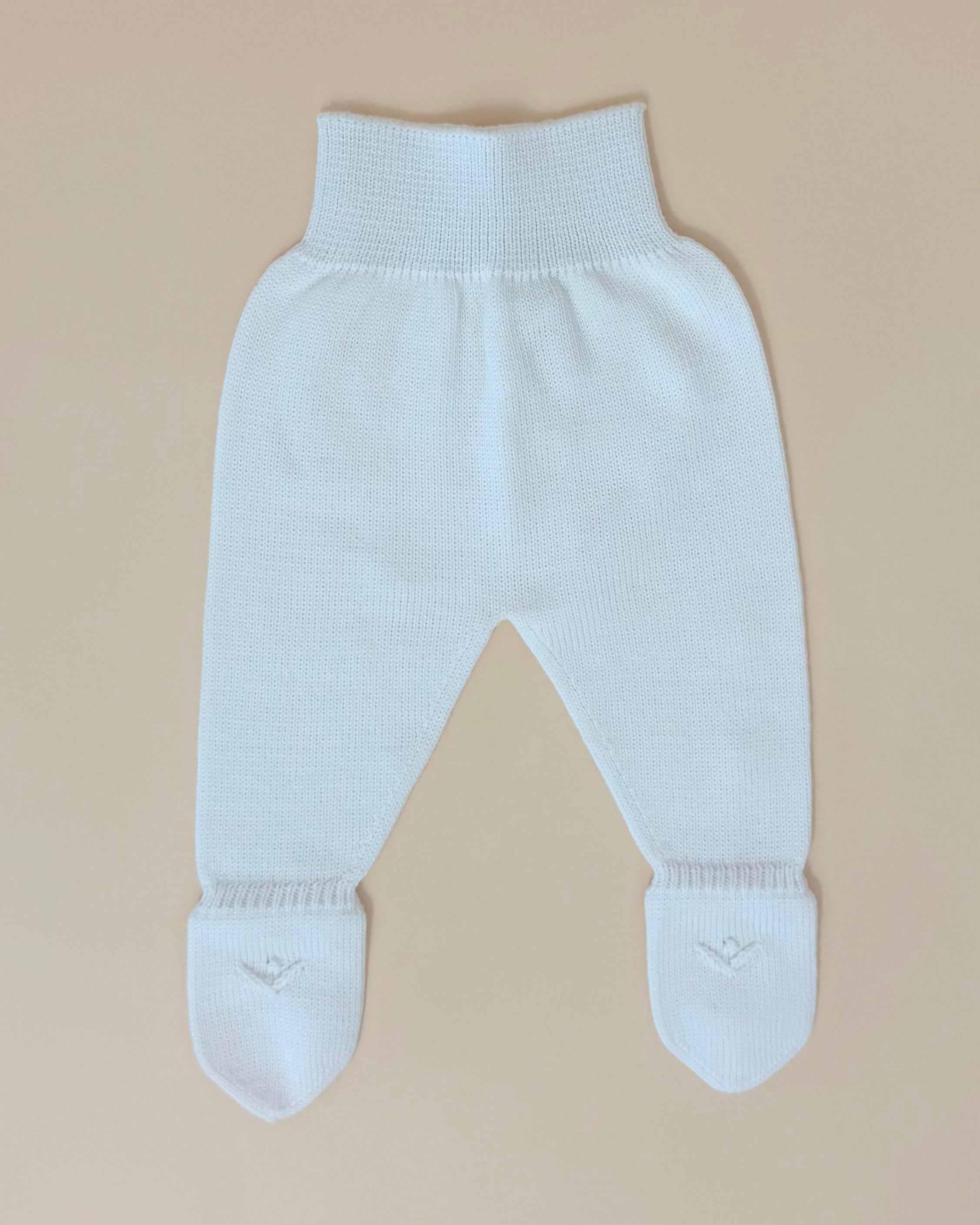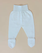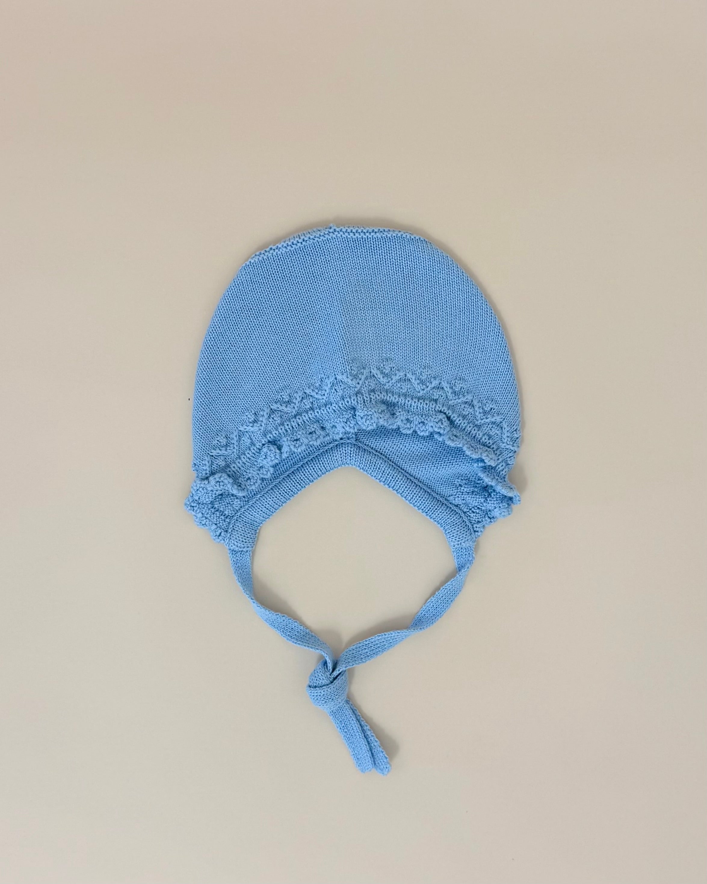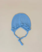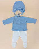 Handcrafted in Spain with premium quality and attention to detail, the set includes a baby blue knitted top with back button closure, white footed pants for added warmth, and a coordinated baby blue bonnet to complete the look.