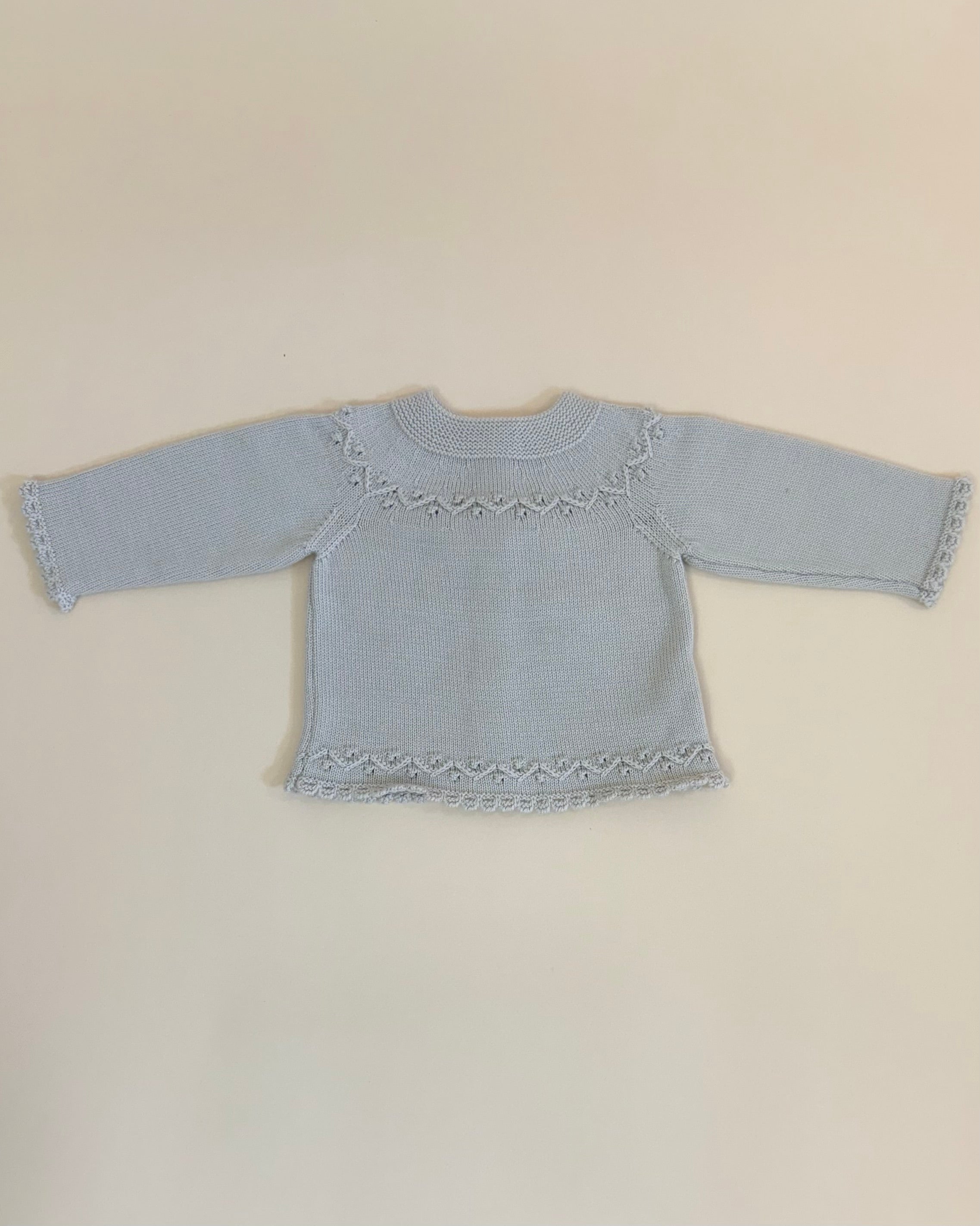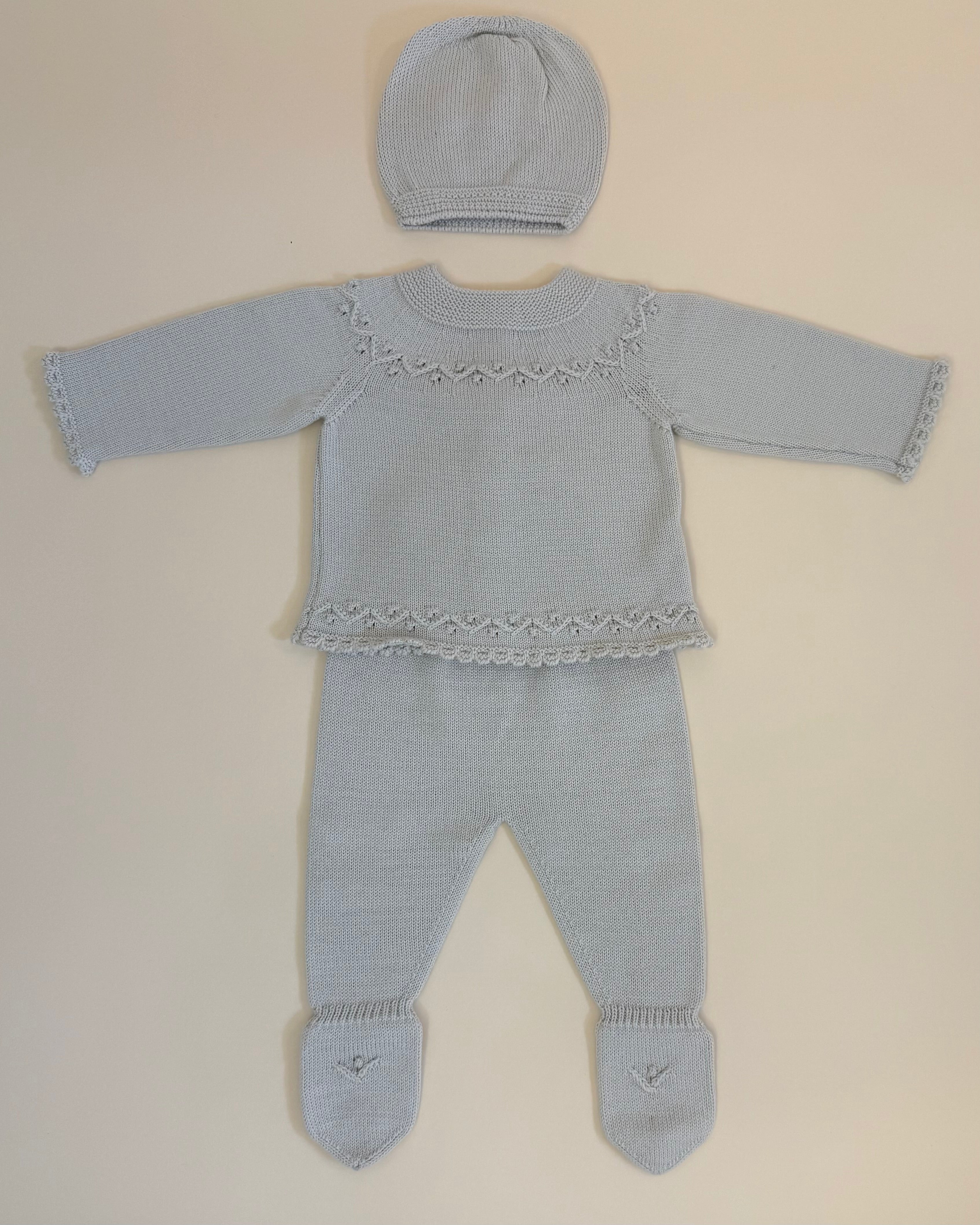 Handcrafted in Spain with exceptional quality and care, this set includes a knitted top with back button closure, matching pants, and a soft beanie for a complete and cozy look.
