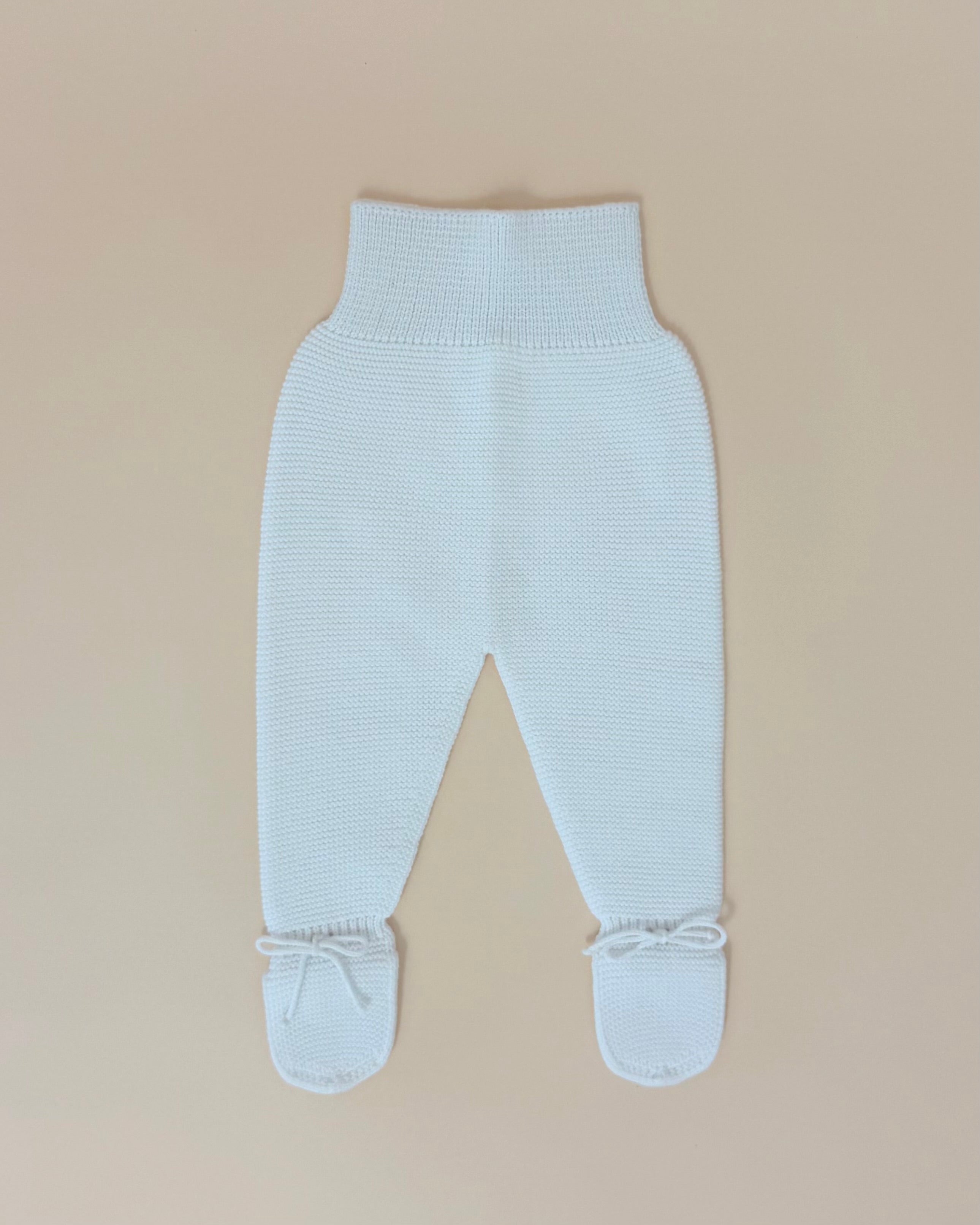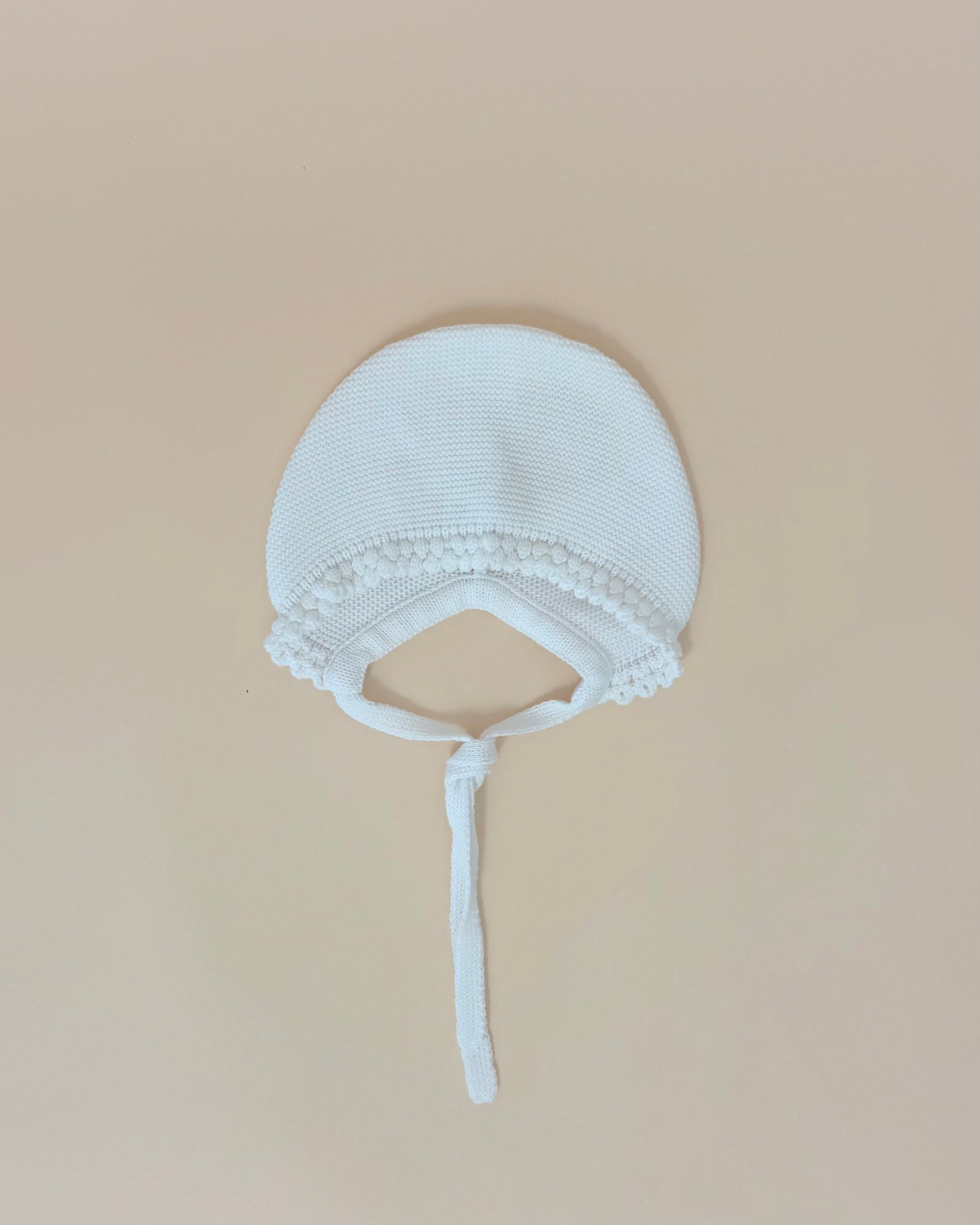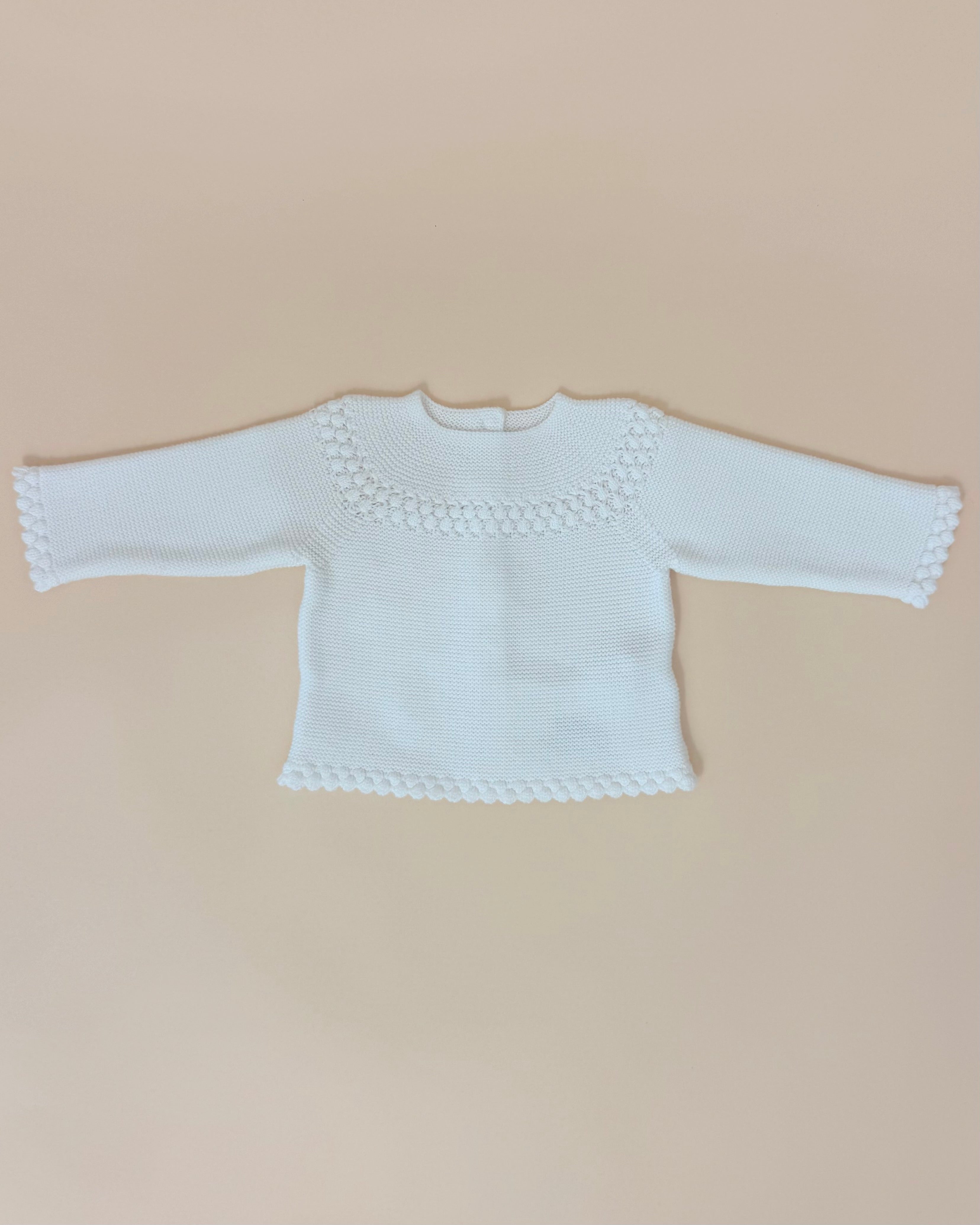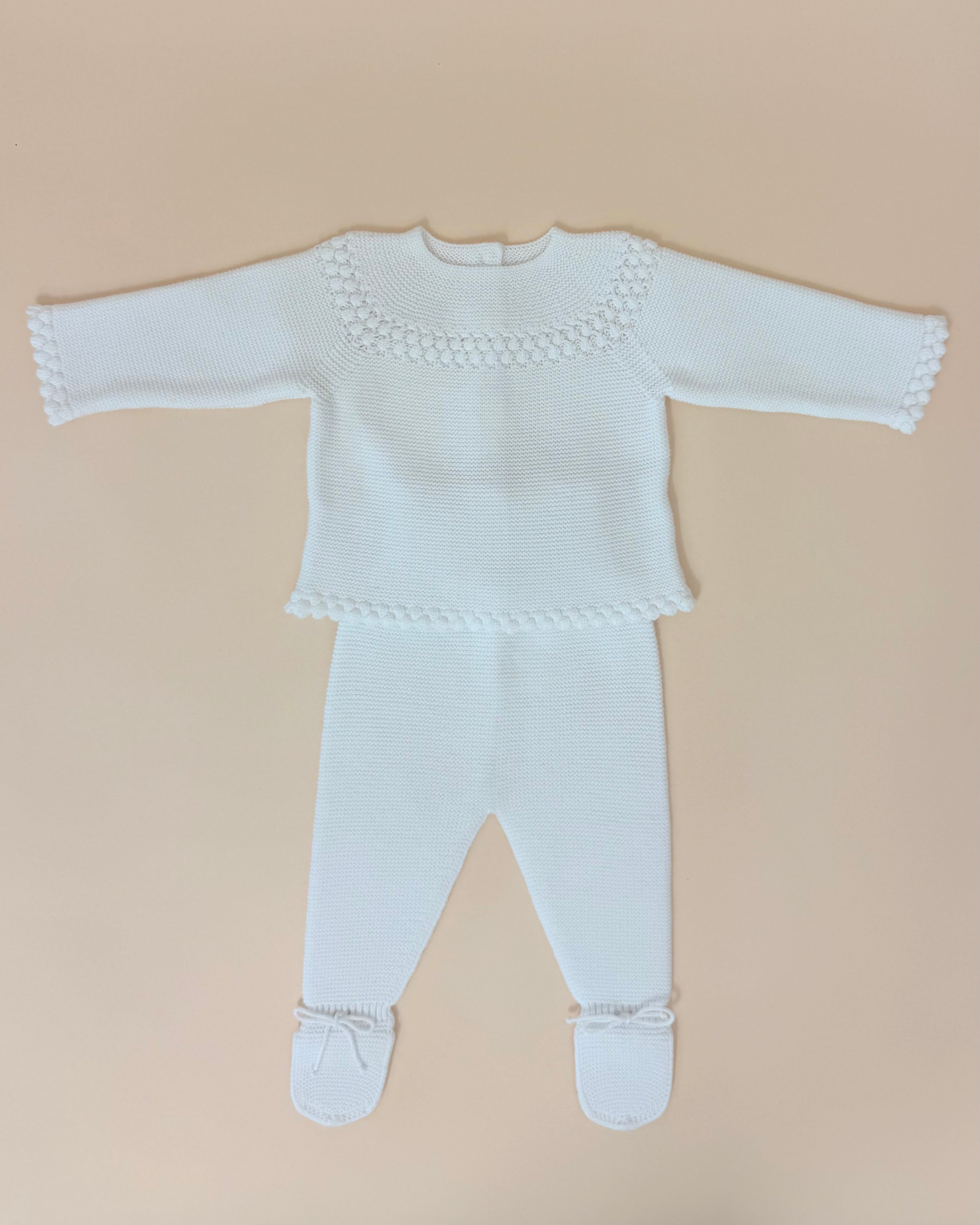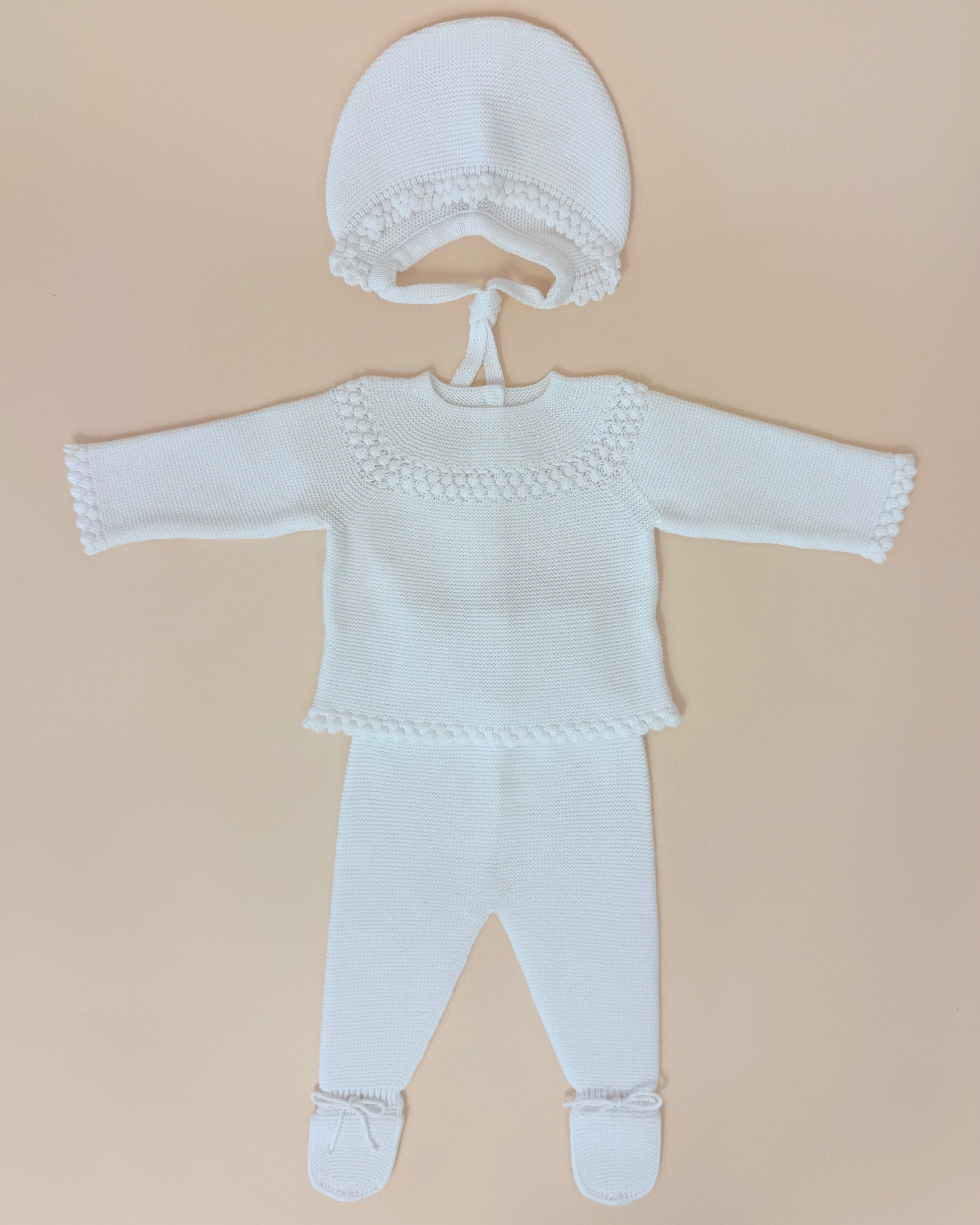 Handcrafted in Spain with meticulous care, the set includes a white knitted top with back button closure, matching footed pants, and a coordinated bonnet—a beautifully refined look from head to toe.