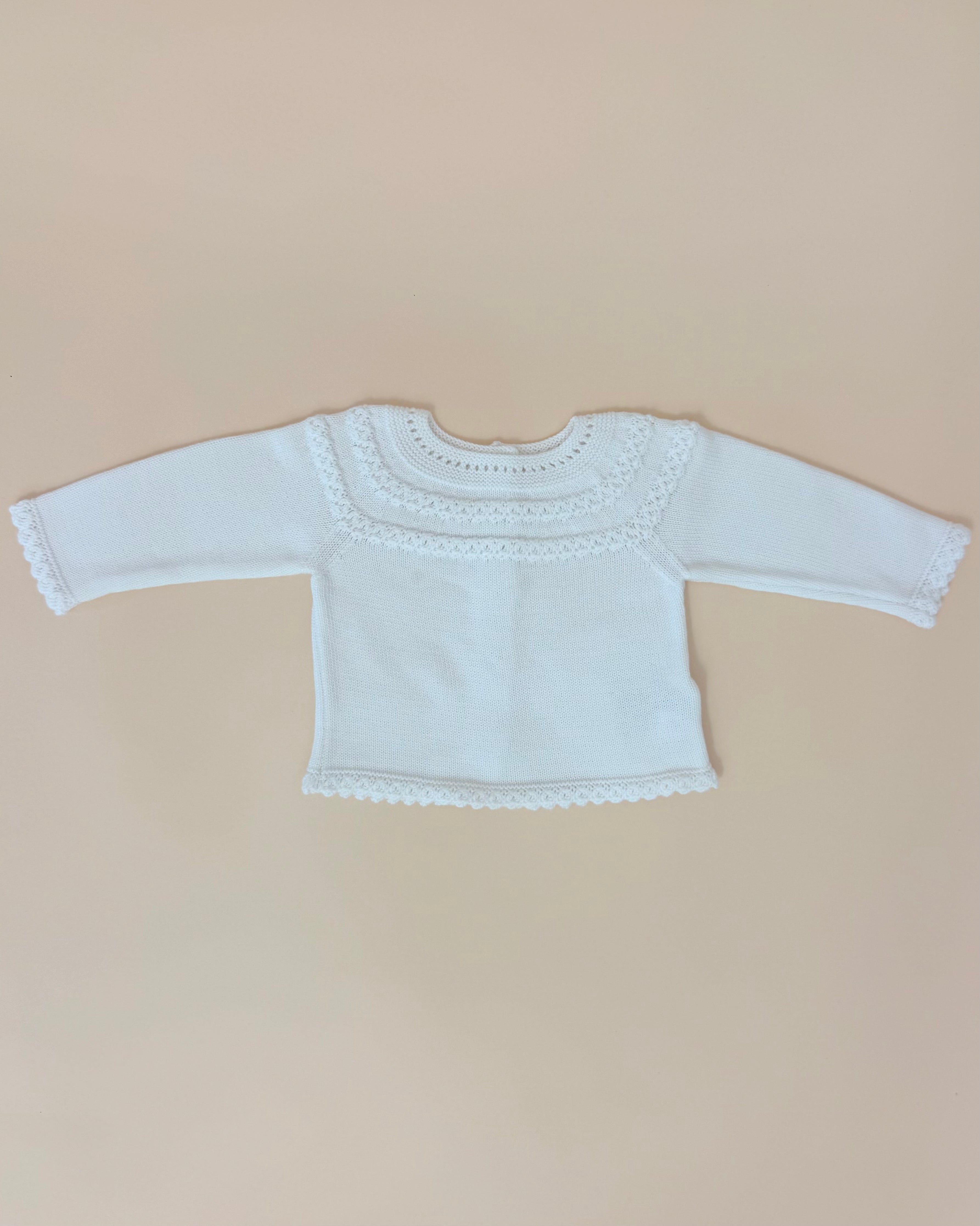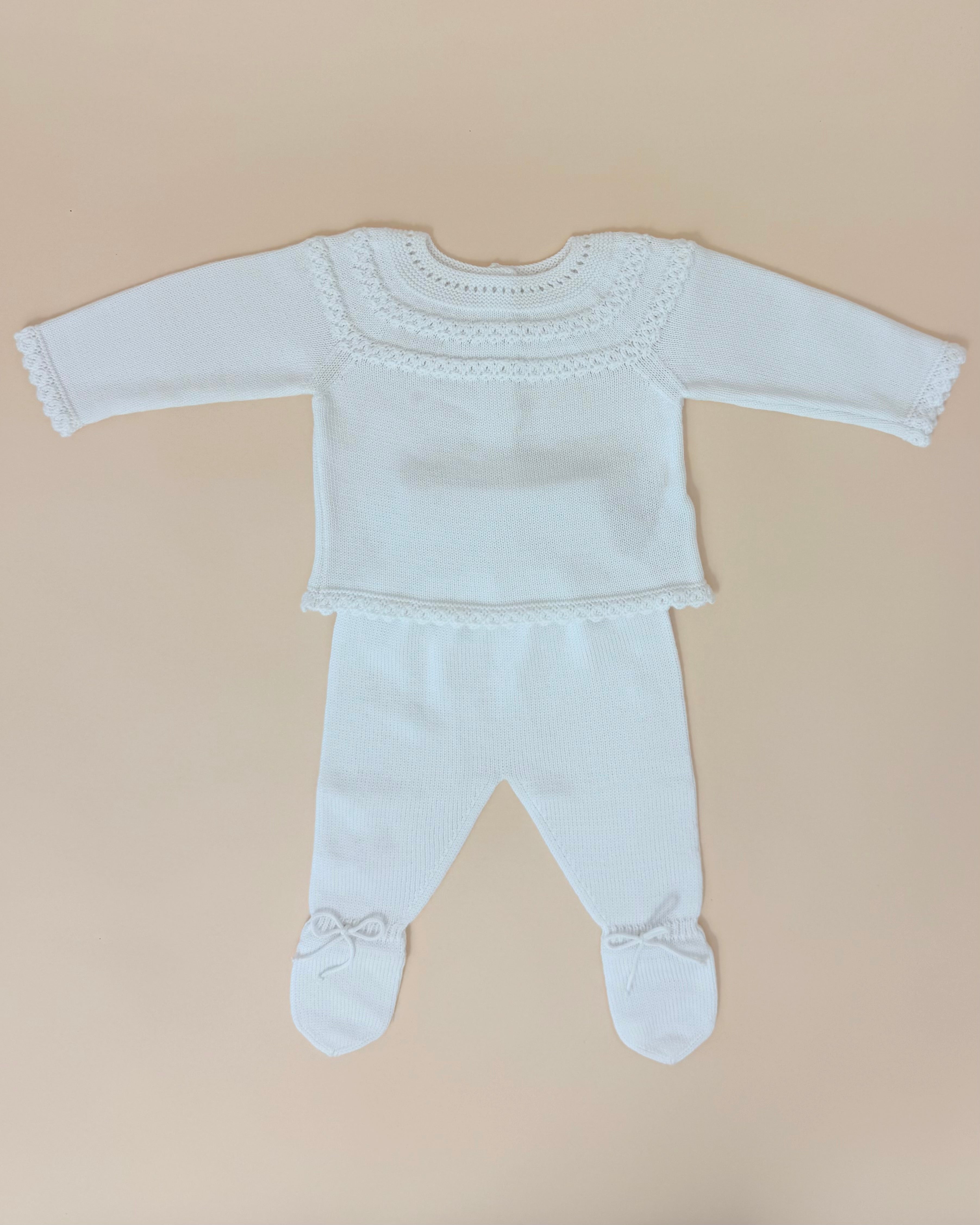 Pure, simple, and timeless—this all-white knitted outfit is a beautifully minimalist and gender-neutral choice for your baby’s first days.