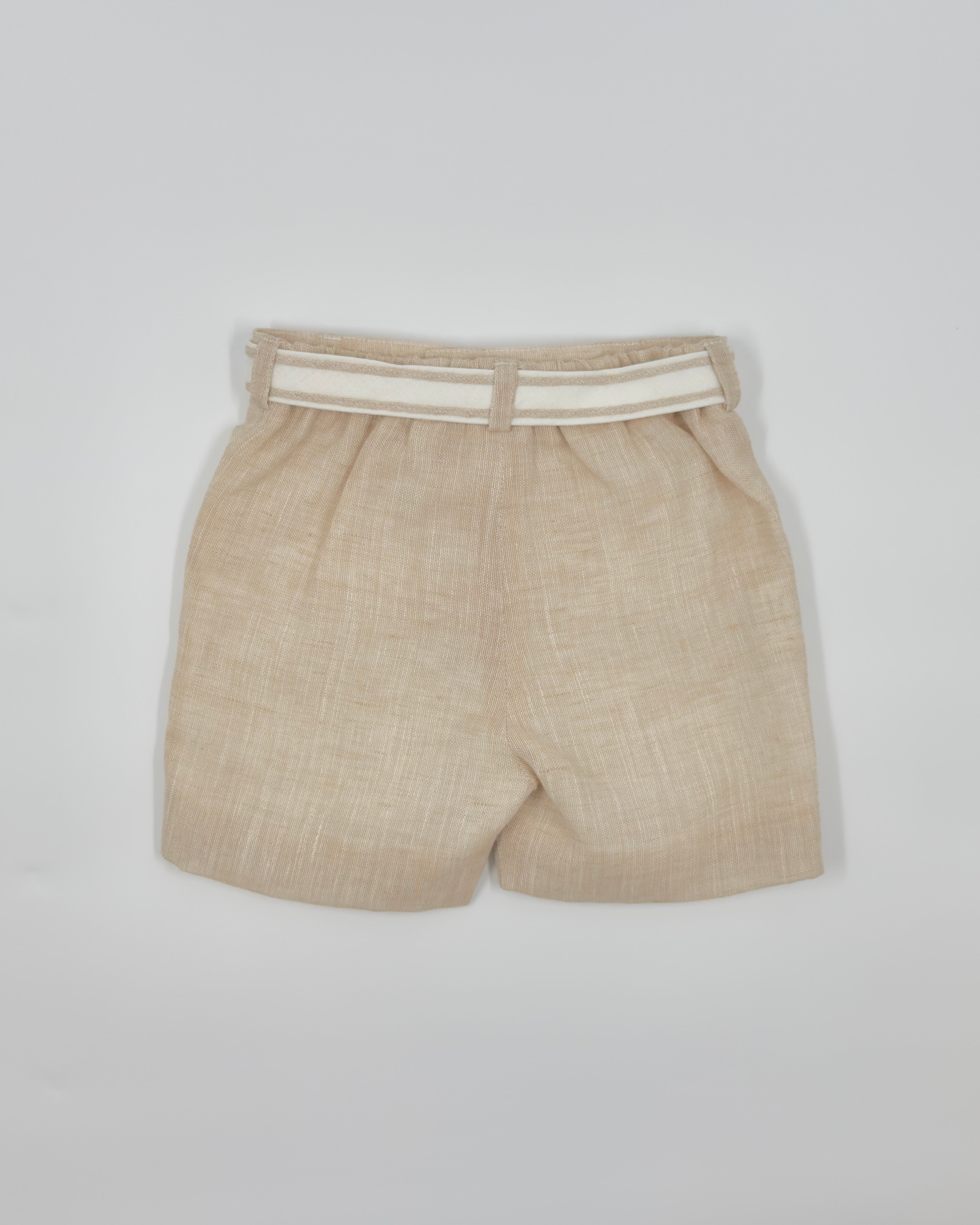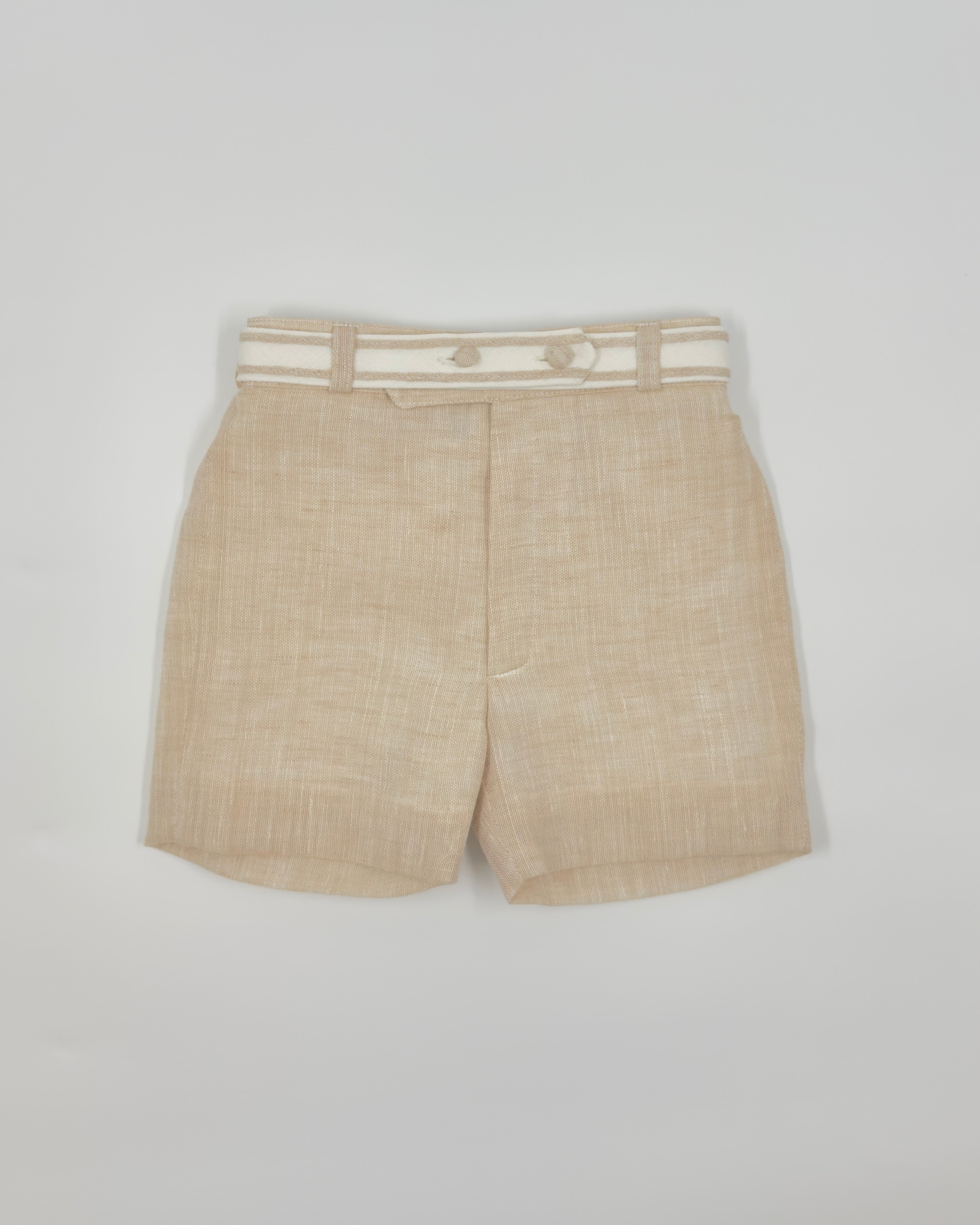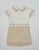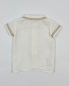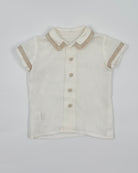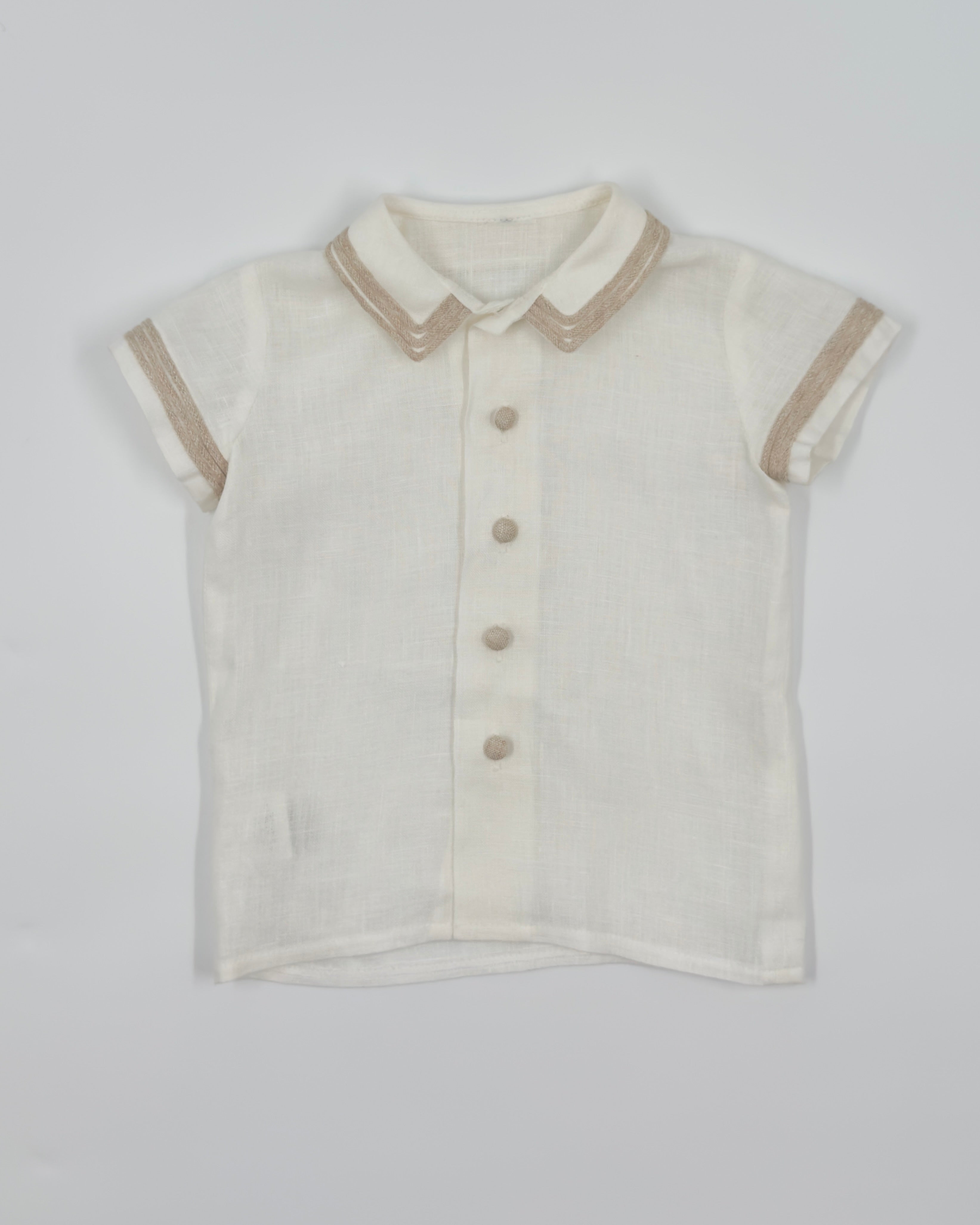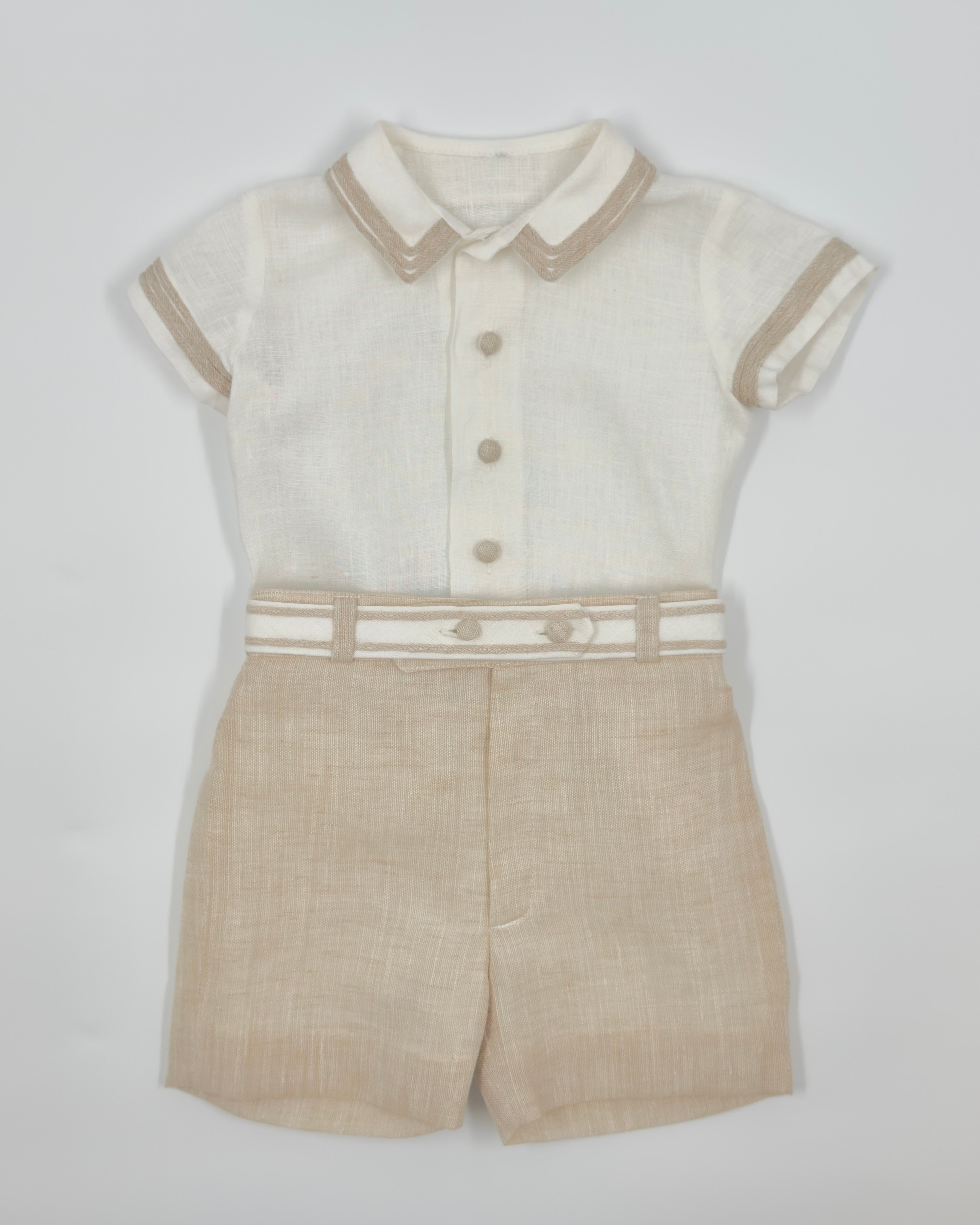 The Isidro outfit is a refined two-piece set for baby boys, designed for timeless elegance and comfort. The white shirt features a front button closure and a tailored look, perfect for formal occasions. It pairs beautifully with soft grey shorts, creating a classic ensemble ideal for baptisms, weddings, or any special celebration.