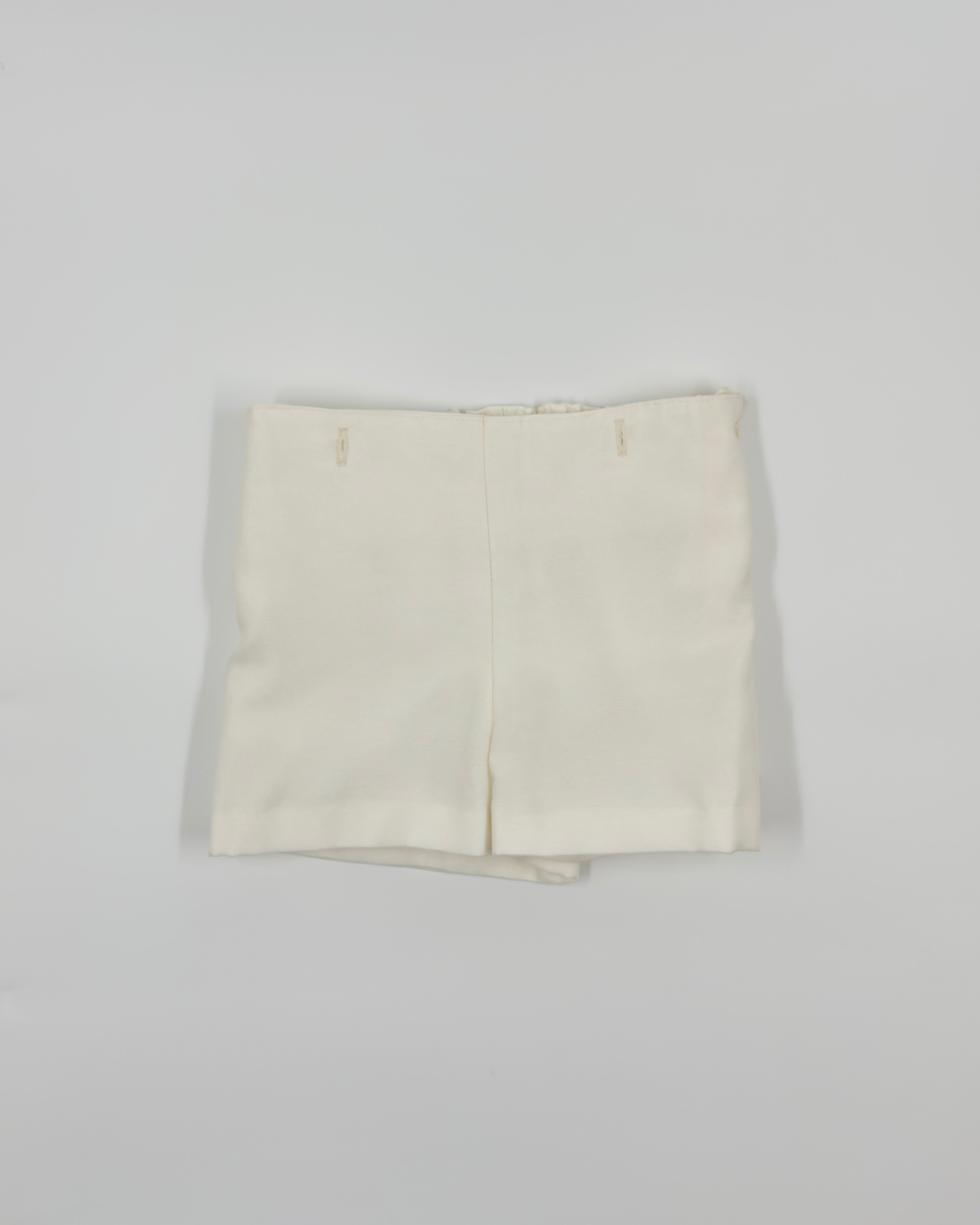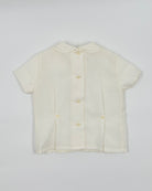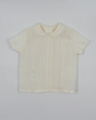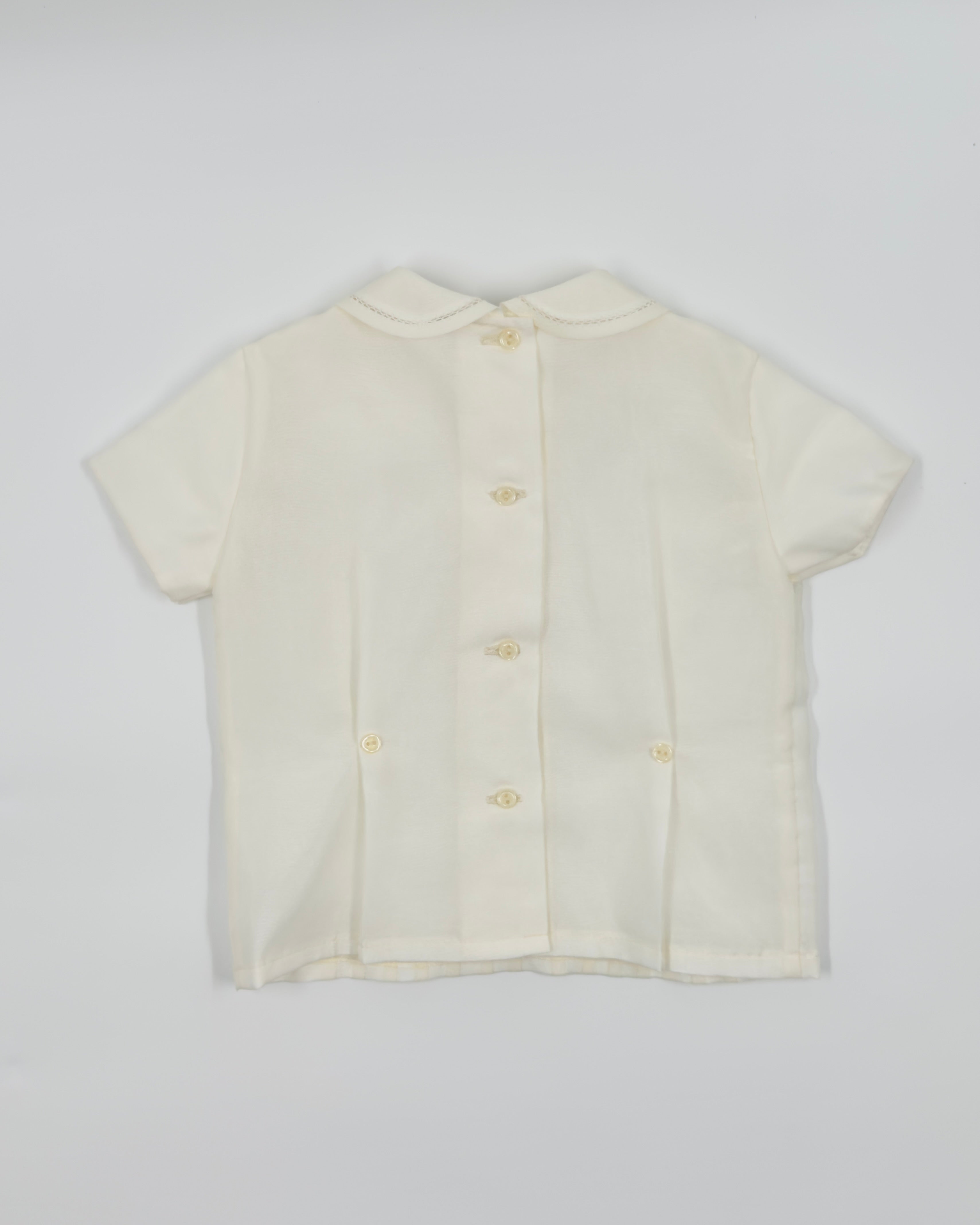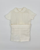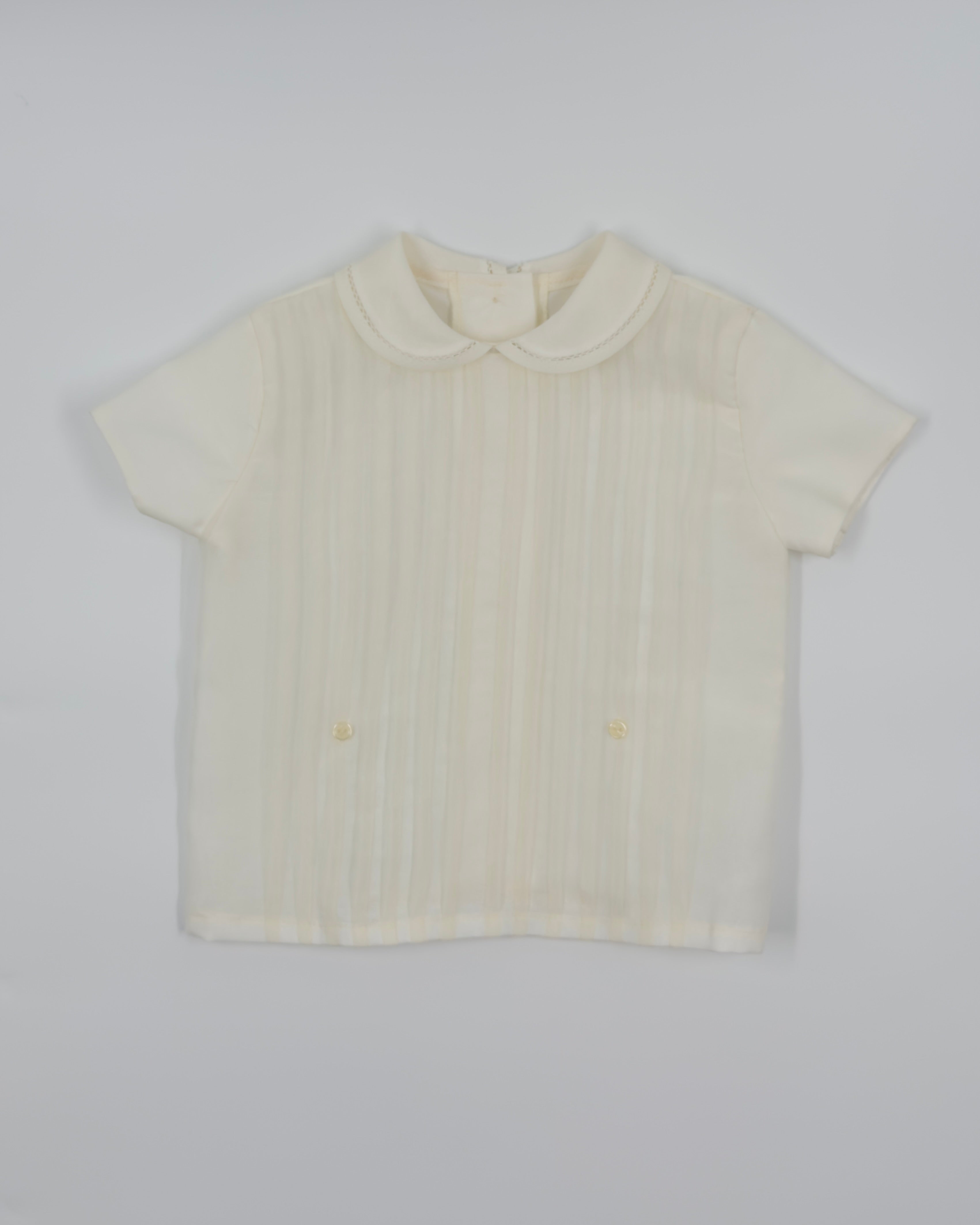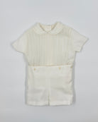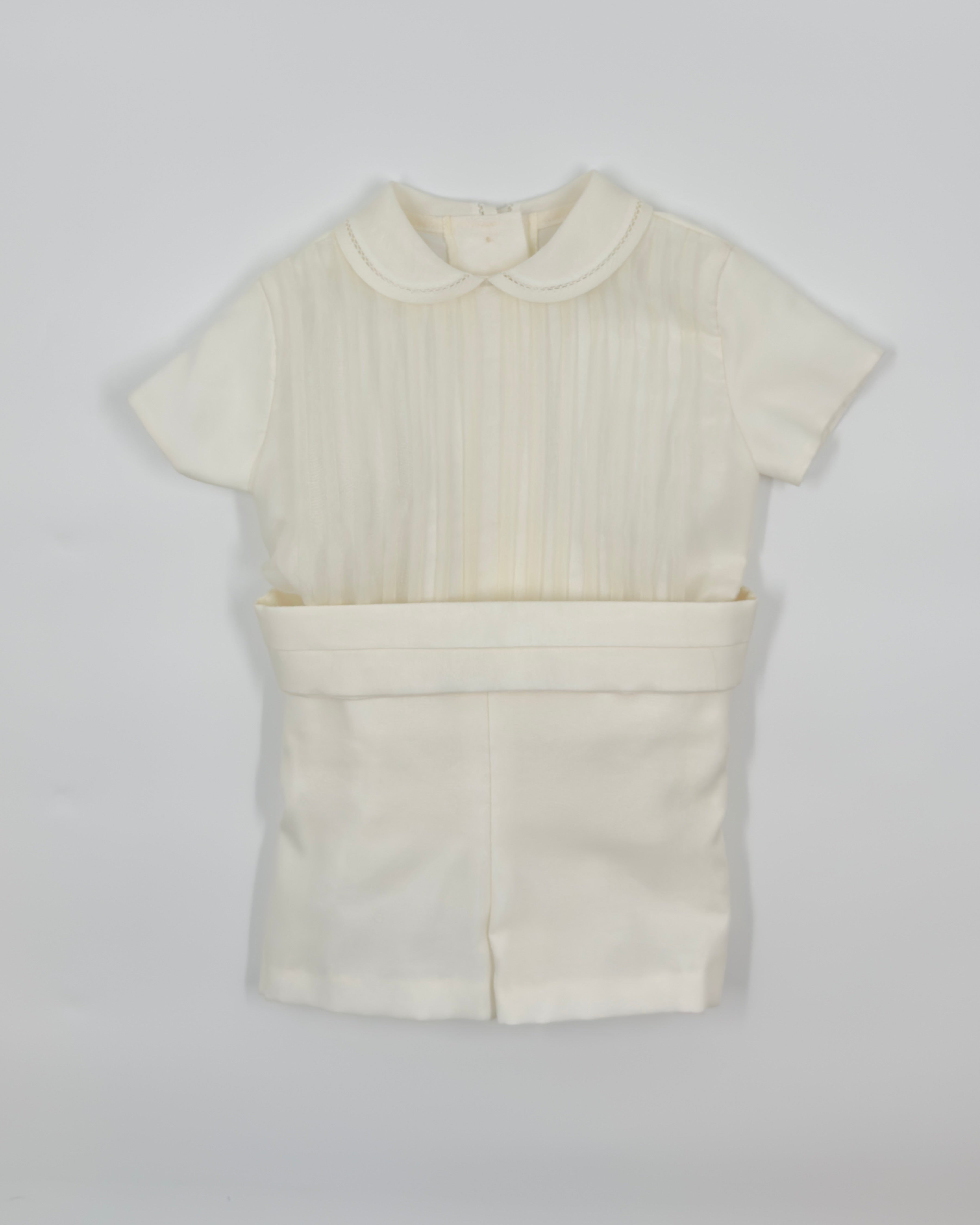 The Leonardo outfit is a timeless two-piece set for baby boys, designed with elegance for special occasions. The shirt features a refined Peter Pan collar and vertical pleats on the front, adding a touch of classic charm. It closes at the back with buttons for a clean, traditional finish. Paired with tailored straight shorts and a coordinating sash, this ensemble is perfect for christenings, weddings, and formal events.