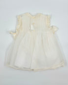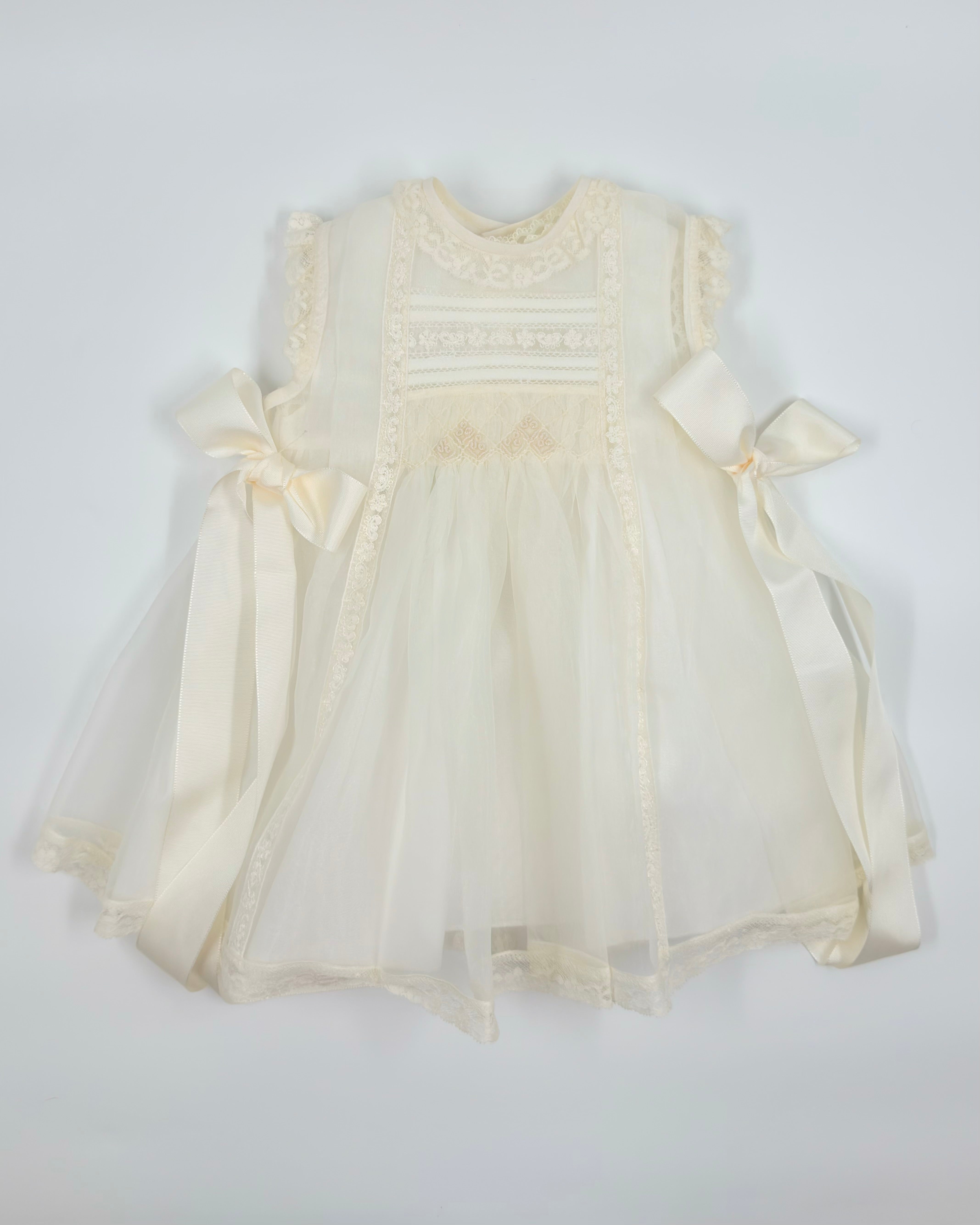 Delicate off-white organza lined with a batiste fabric, it has gorgeous smock detailing and off-white laces. The dress has two off-white ribbons on the sides. The dress has buttons on the back for closure.