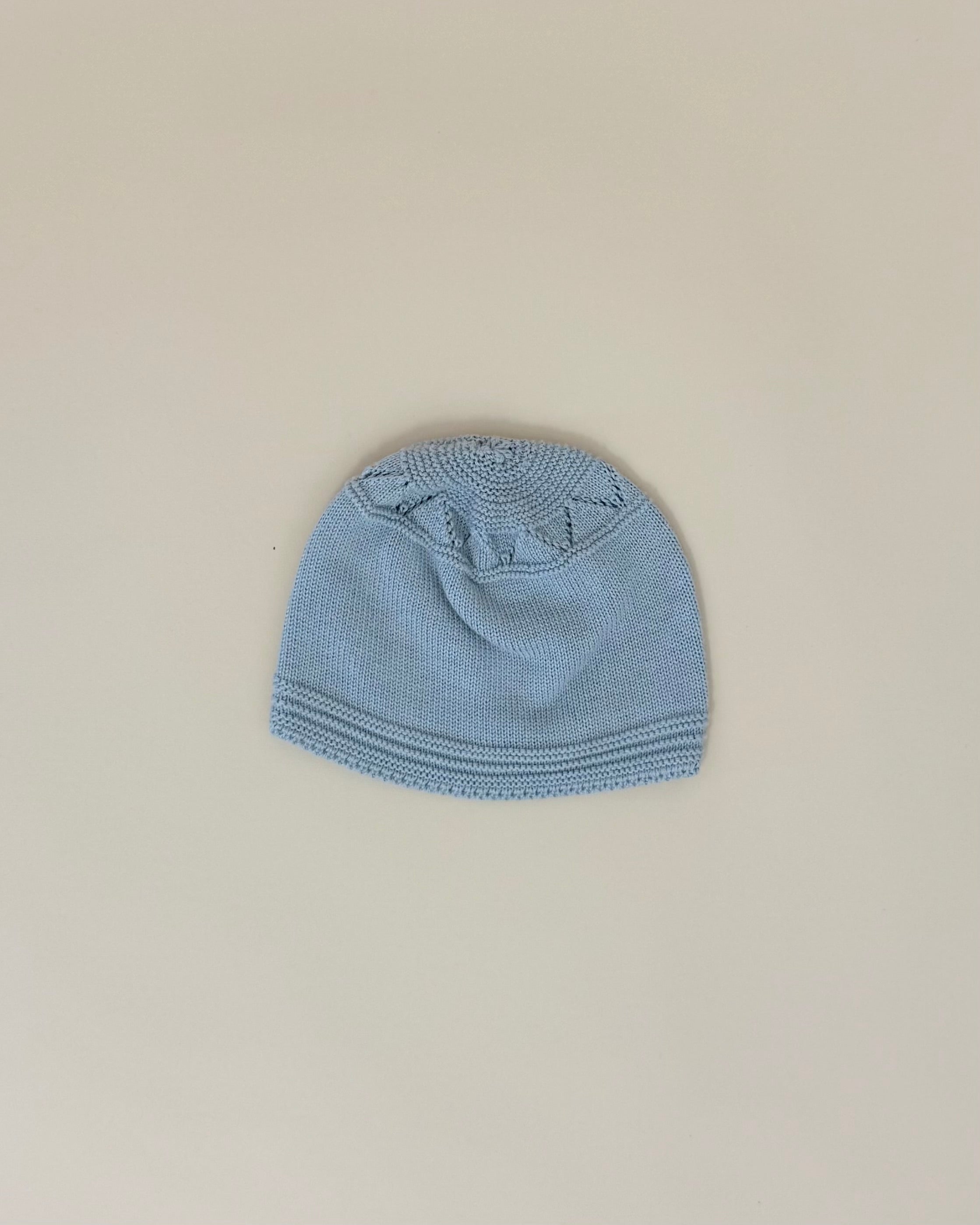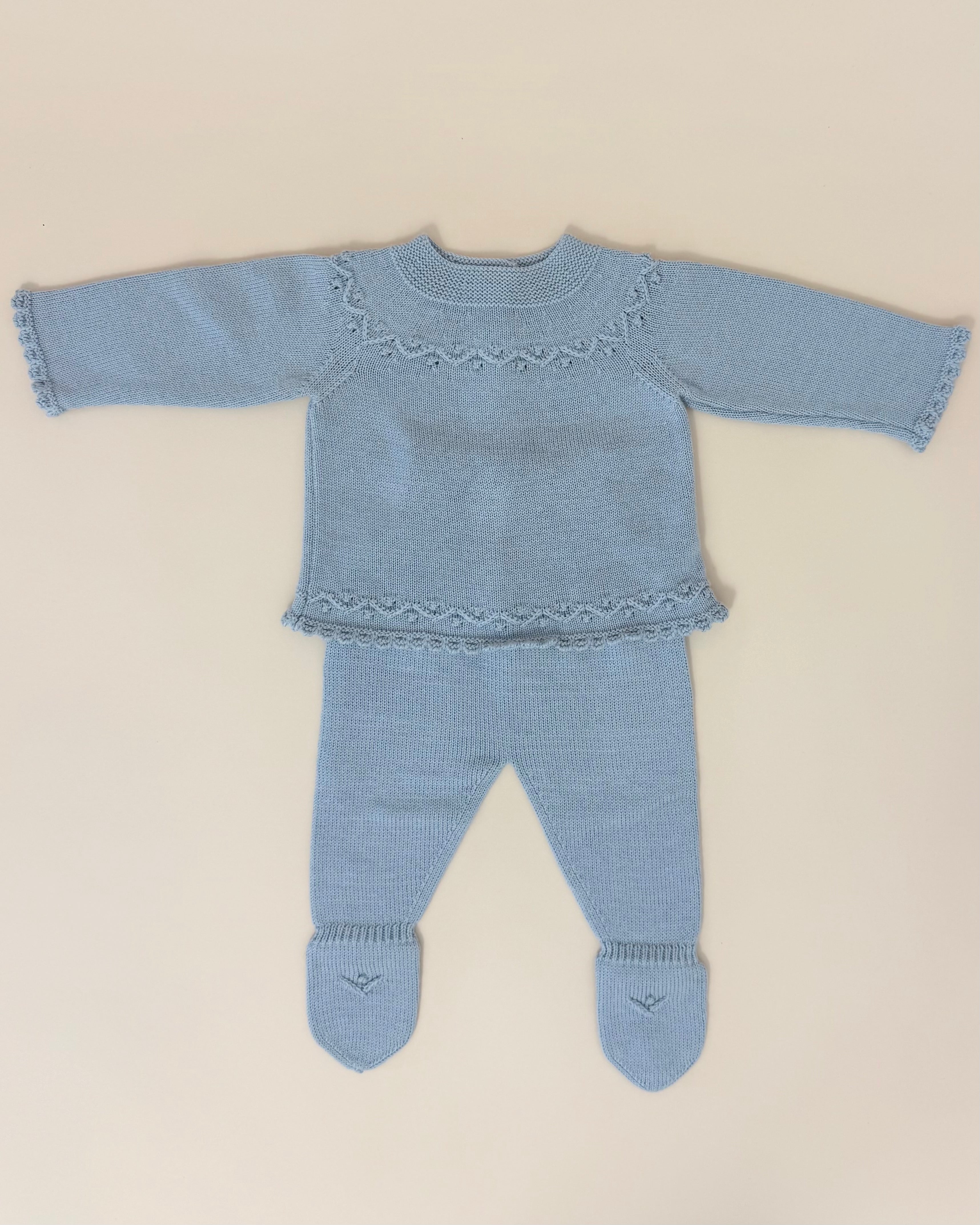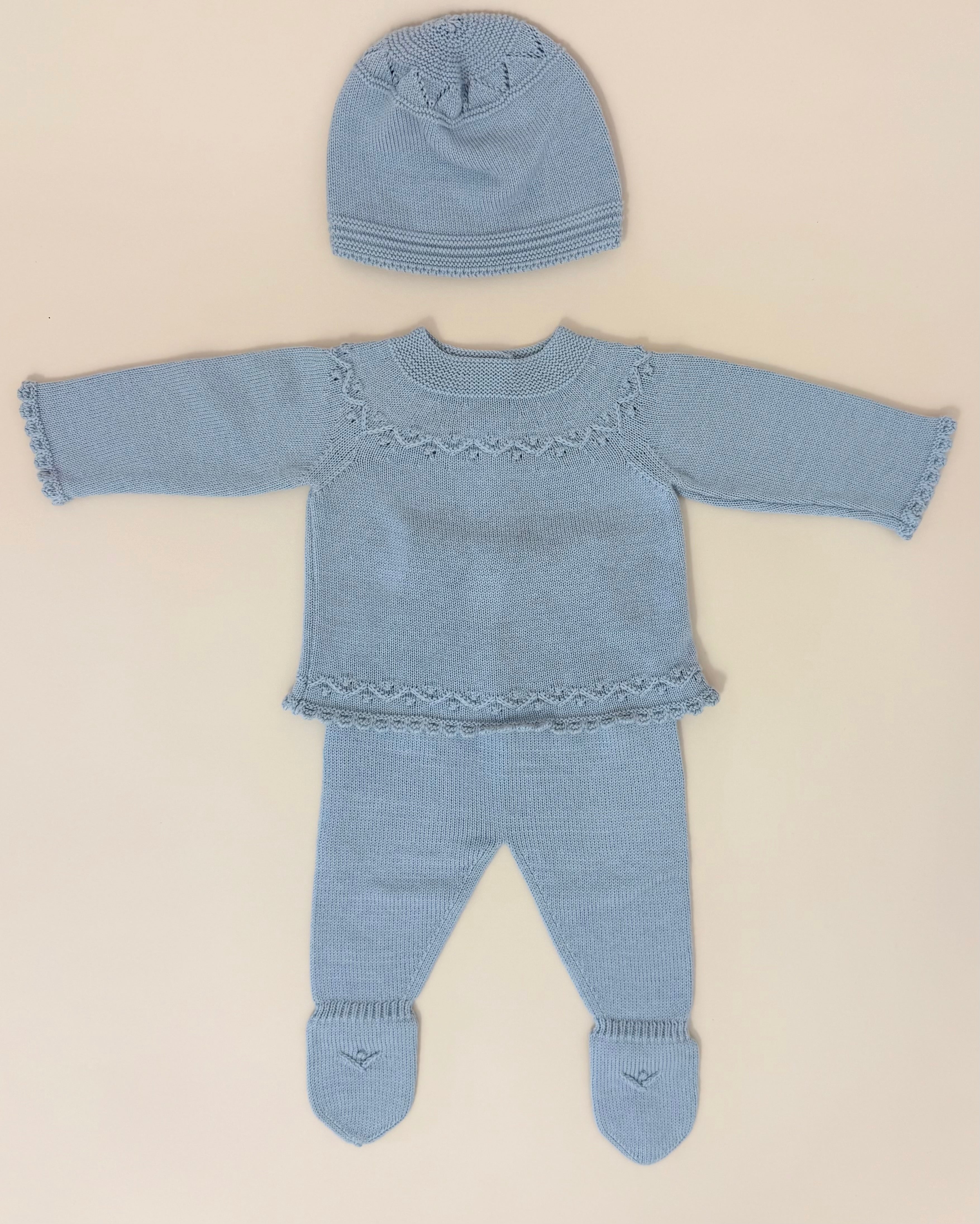 Handcrafted in Spain with exceptional quality, the set includes a knitted top with back button closure, matching footed pants, and a coordinated beanie—a cozy and polished ensemble designed to keep your newborn warm and stylish.