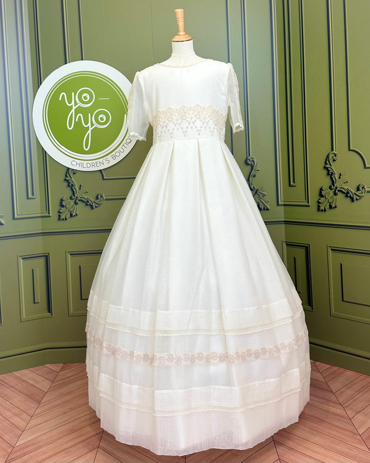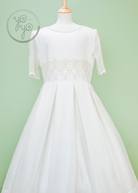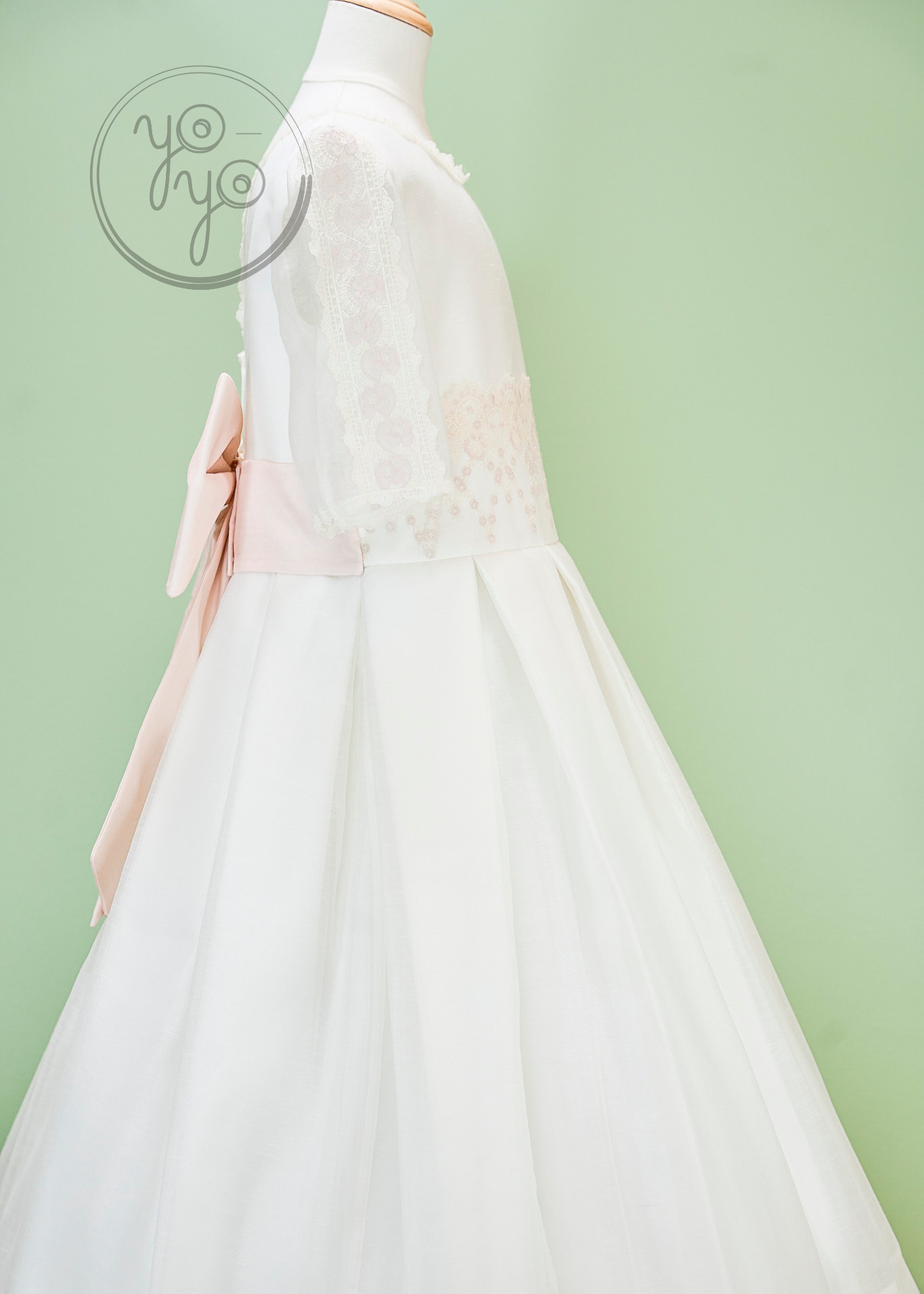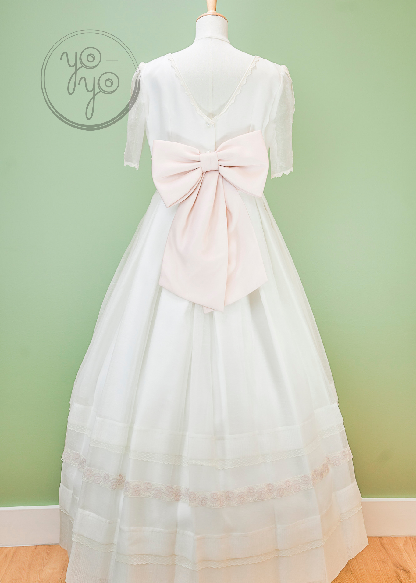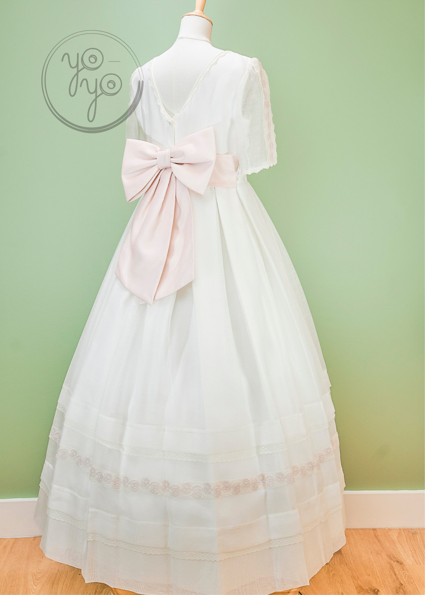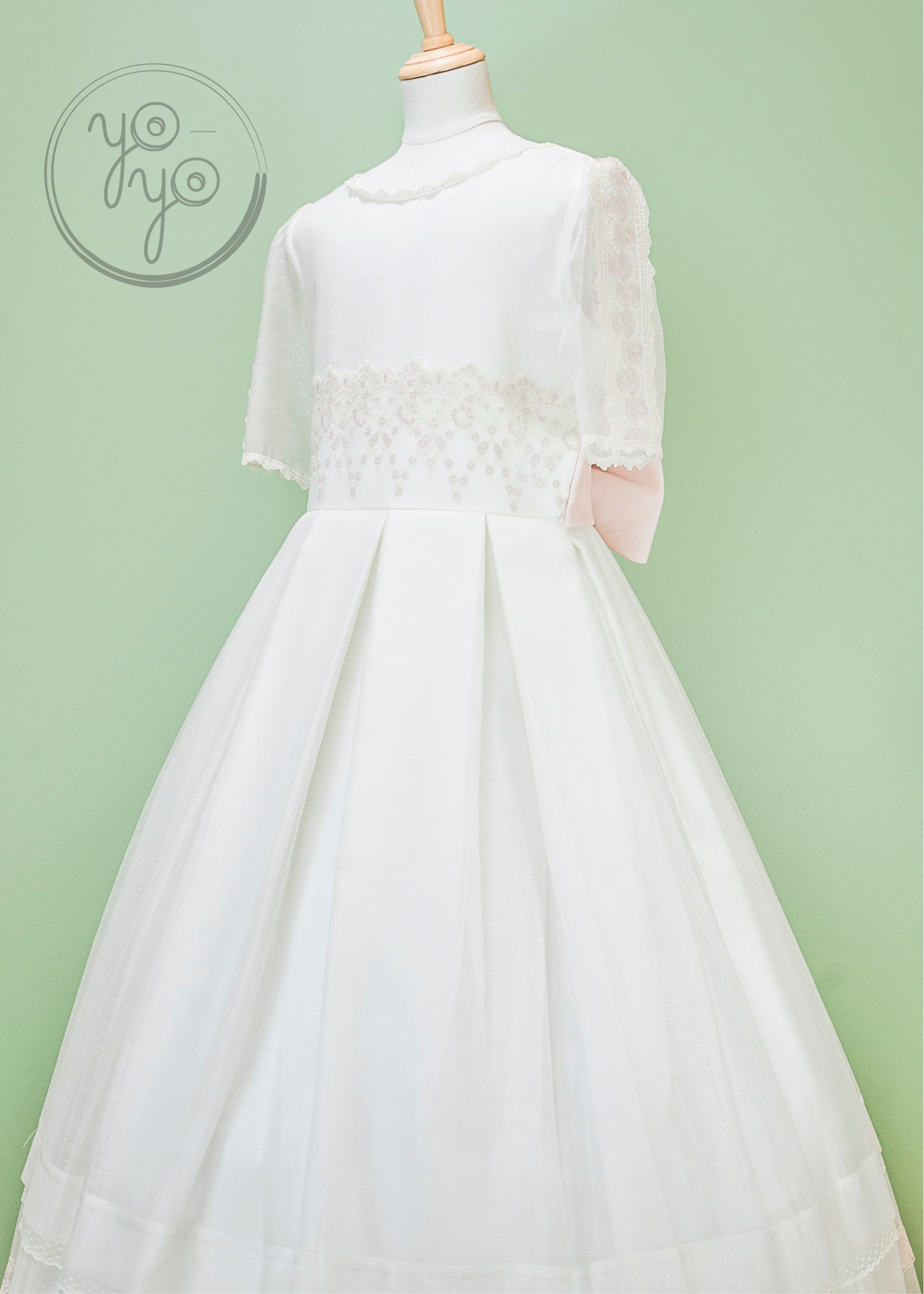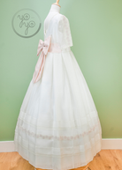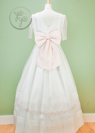 The dress features French sleeves trimmed with lace, adding charm and timelessness to the silhouette. A premade bow, secured with a safety pin for easy attachment, completes the look with grace. Jacaranda is perfect for the girl who wants her First Communion gown to be both unique and unforgettable.