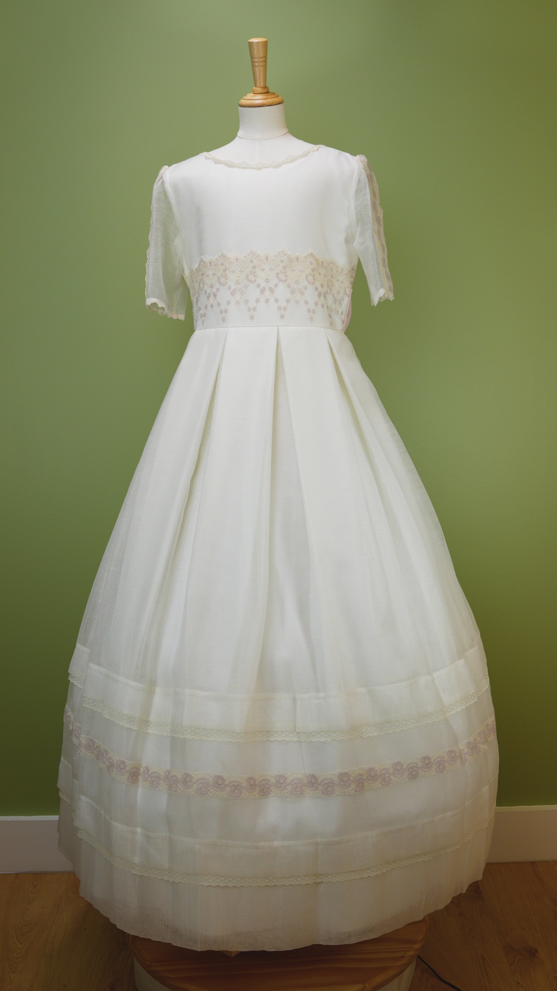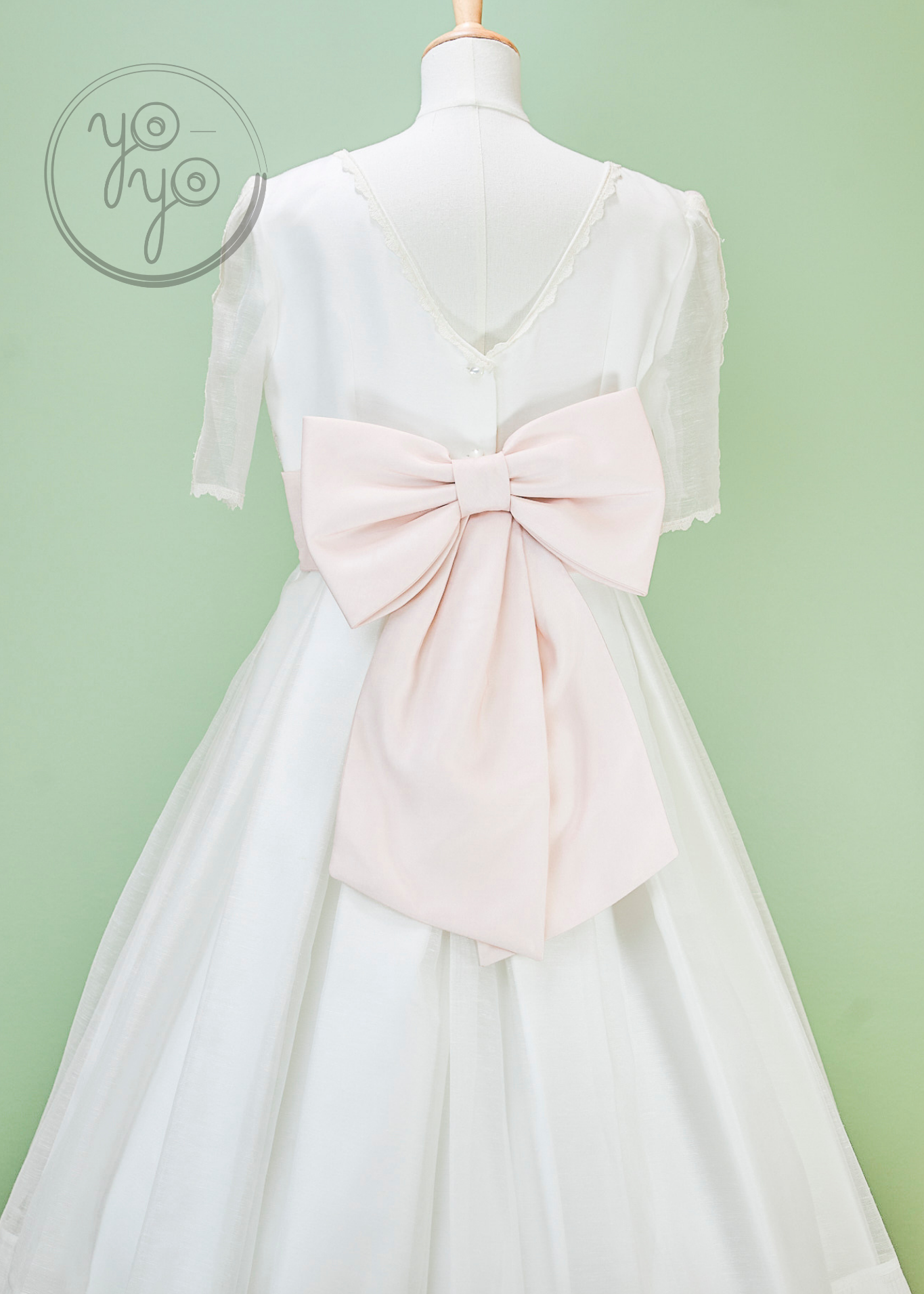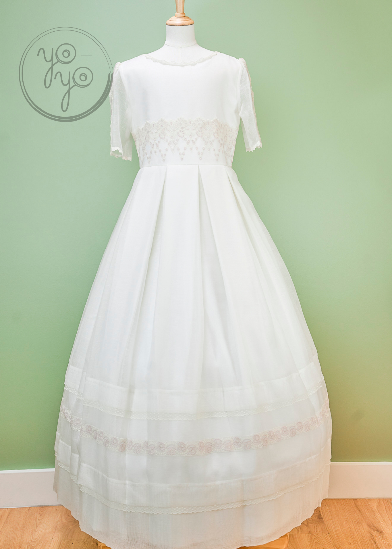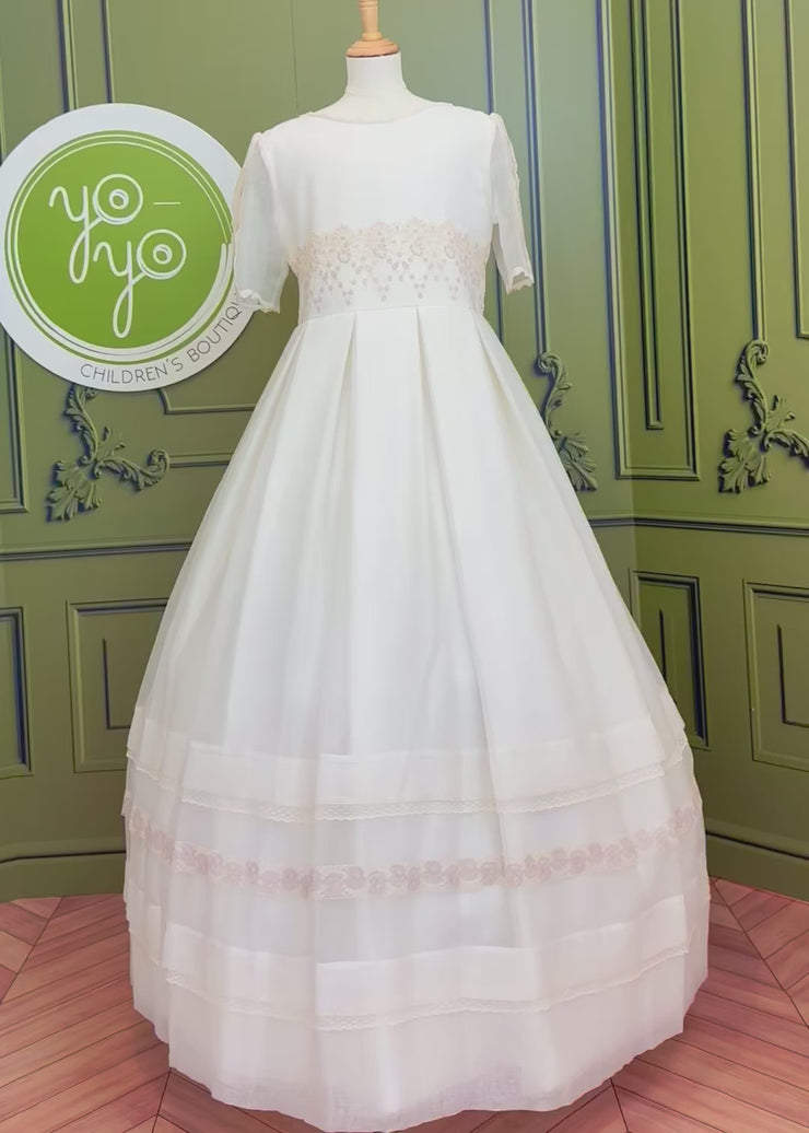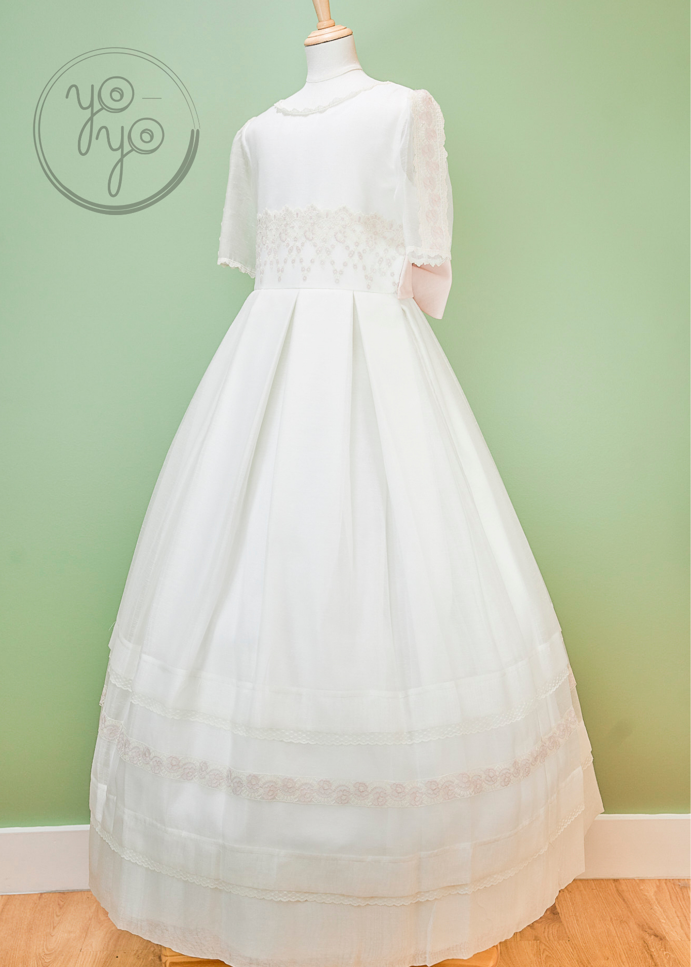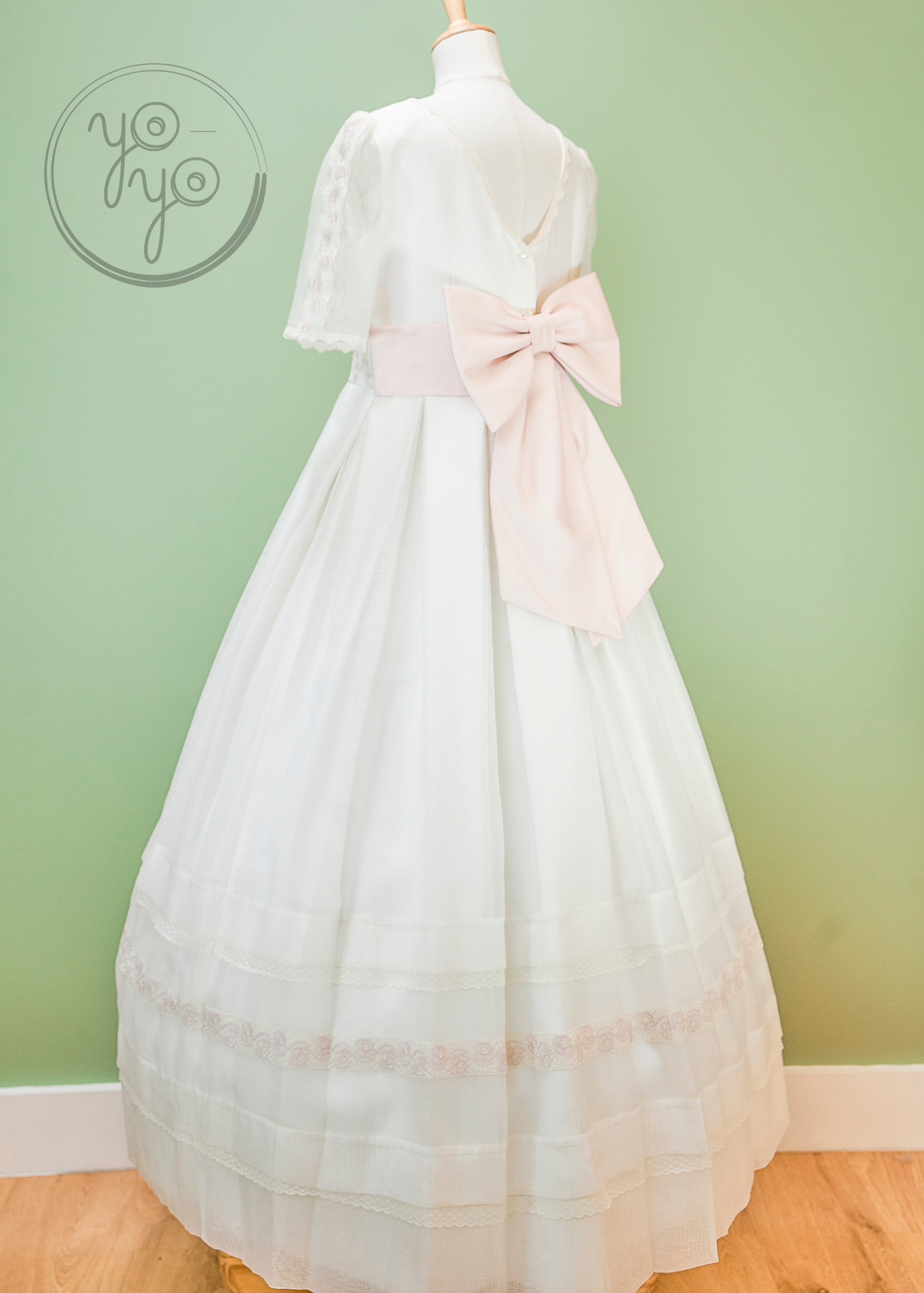 The dress features French sleeves trimmed with lace, adding charm and timelessness to the silhouette. A premade bow, secured with a safety pin for easy attachment, completes the look with grace. Jacaranda is perfect for the girl who wants her First Communion gown to be both unique and unforgettable.