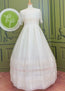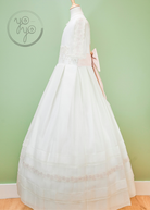 The Jacaranda First Communion Dress is a one-of-a-kind gown that blends elegance with a touch of color. Its exquisite lace, delicately tinted in blush and lilac, makes it stand out while keeping a refined and sacred feel.
