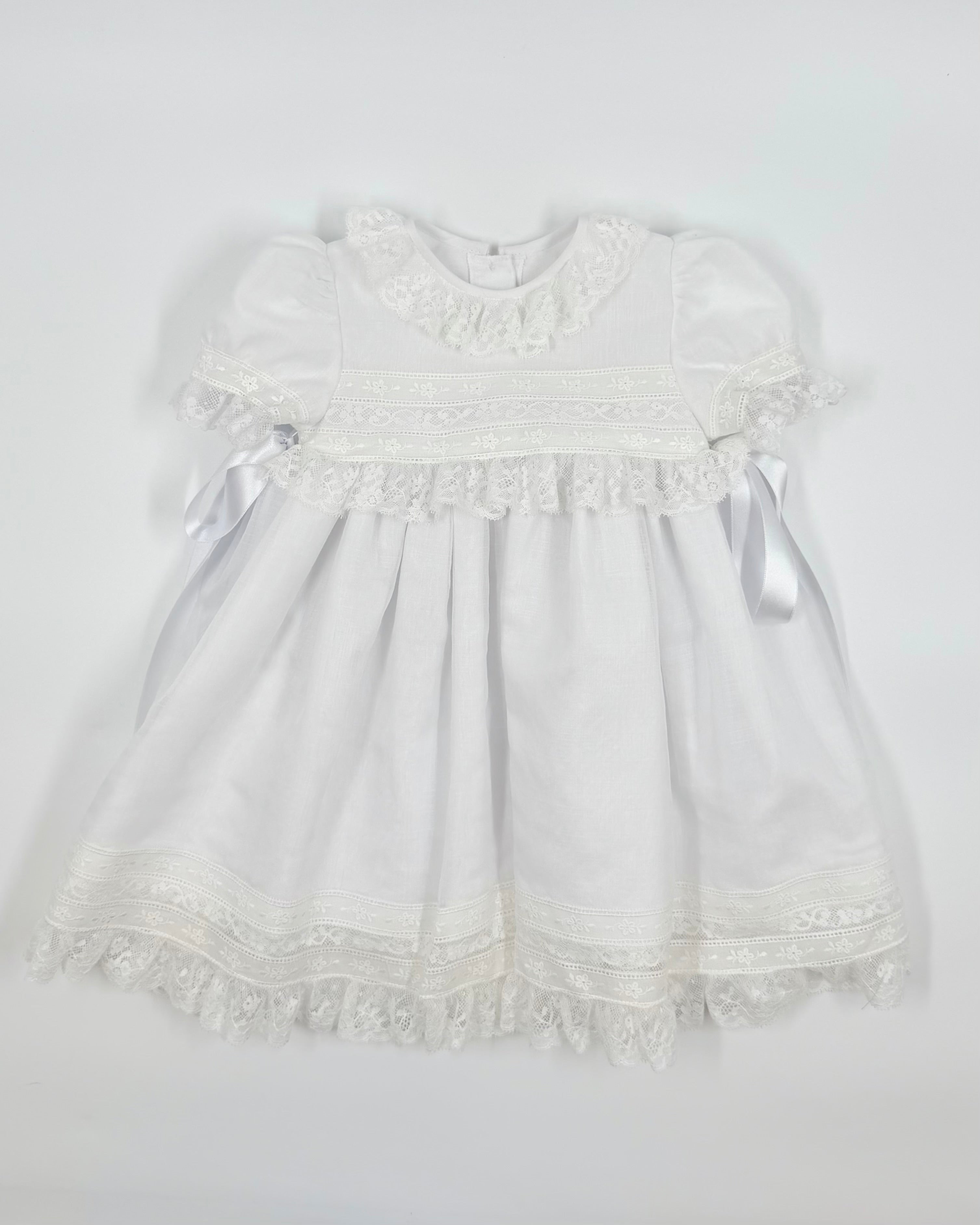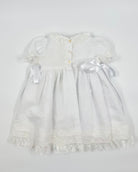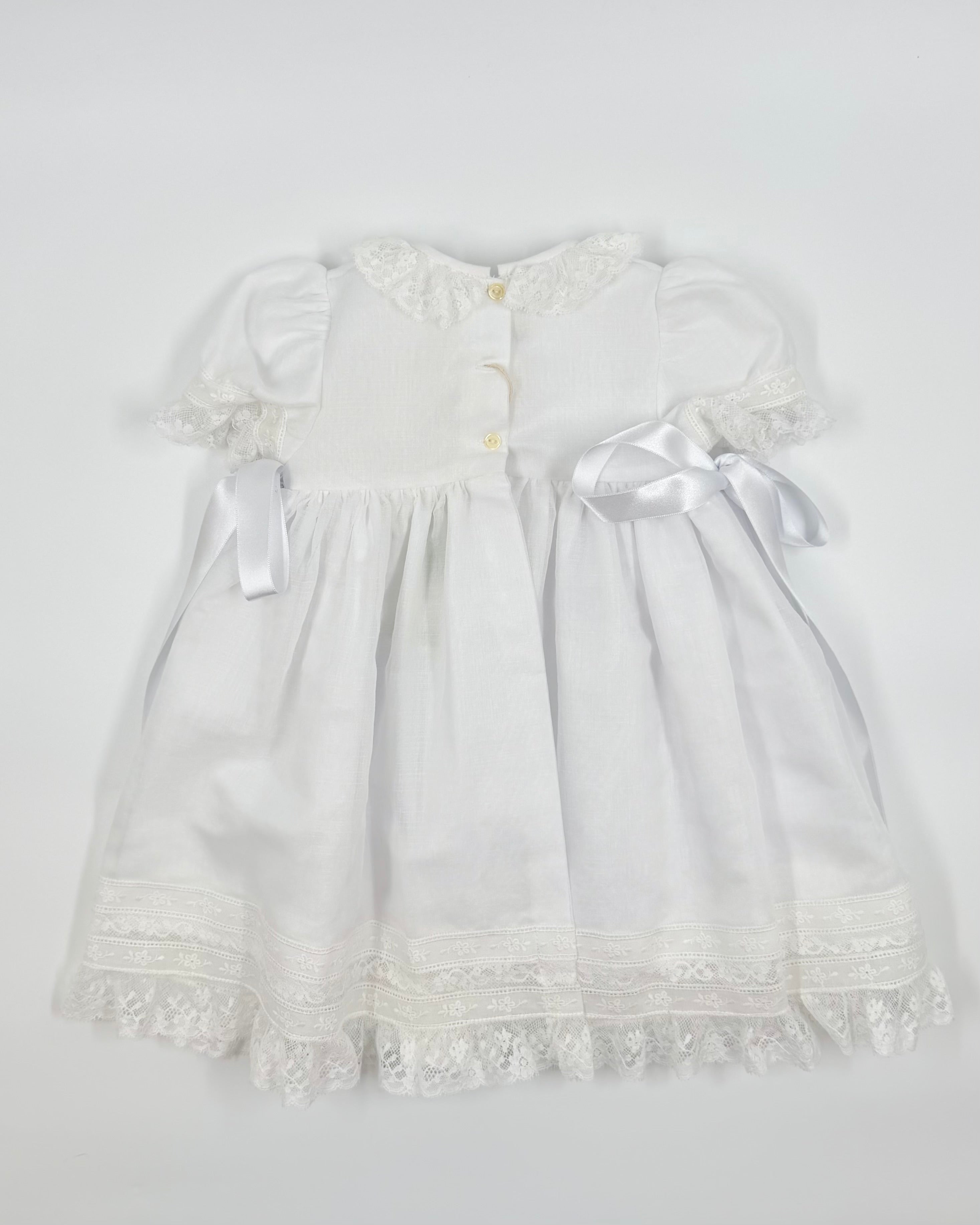 The Miranda dress is a charming and traditional outfit for baby girls, perfect for christenings, baby presentations, and other special occasions. Made from soft English muslin and adorned with delicate cotton lace, it features a classic back button closure and comes with a matching bonnet for a timeless, heirloom-inspired look.