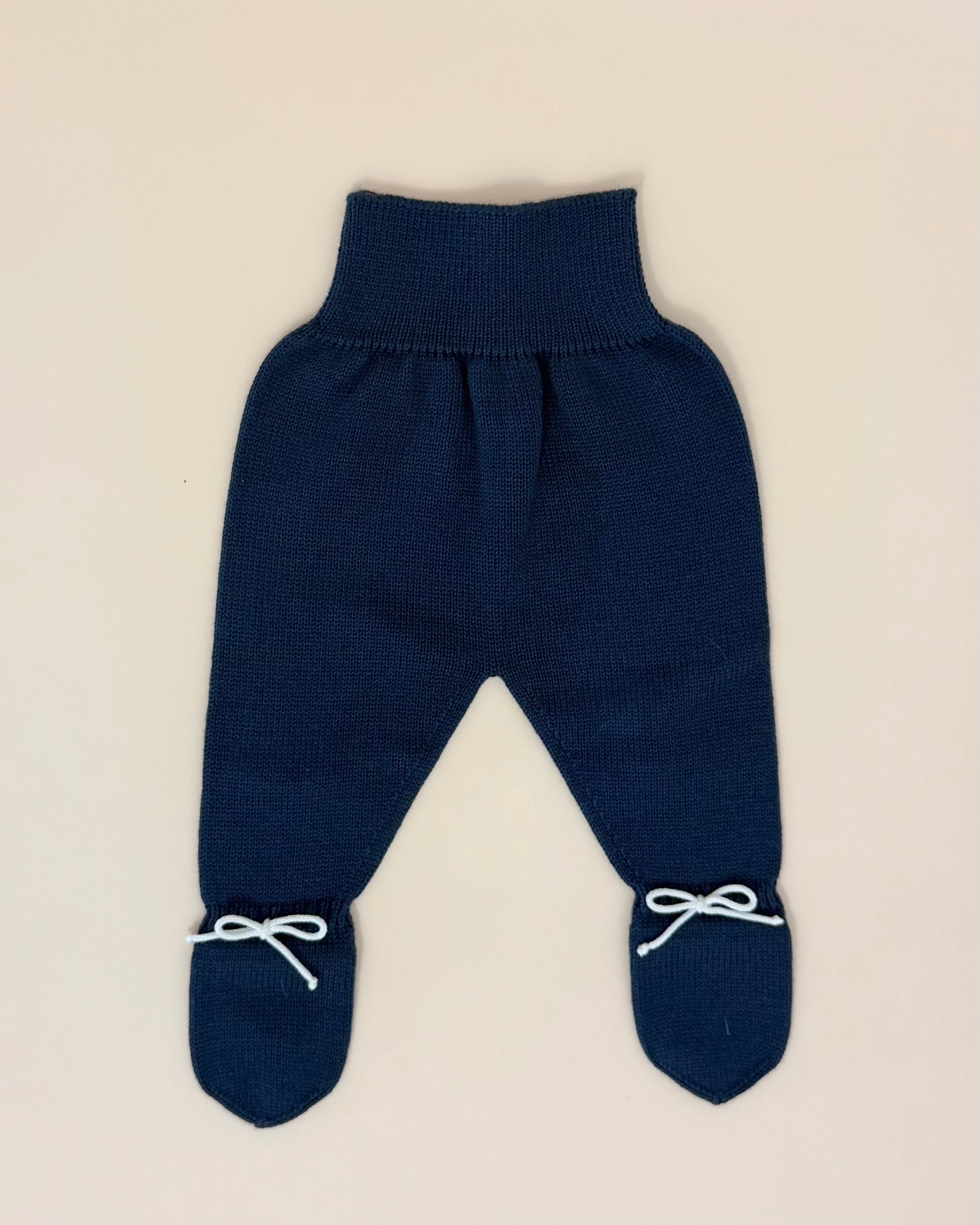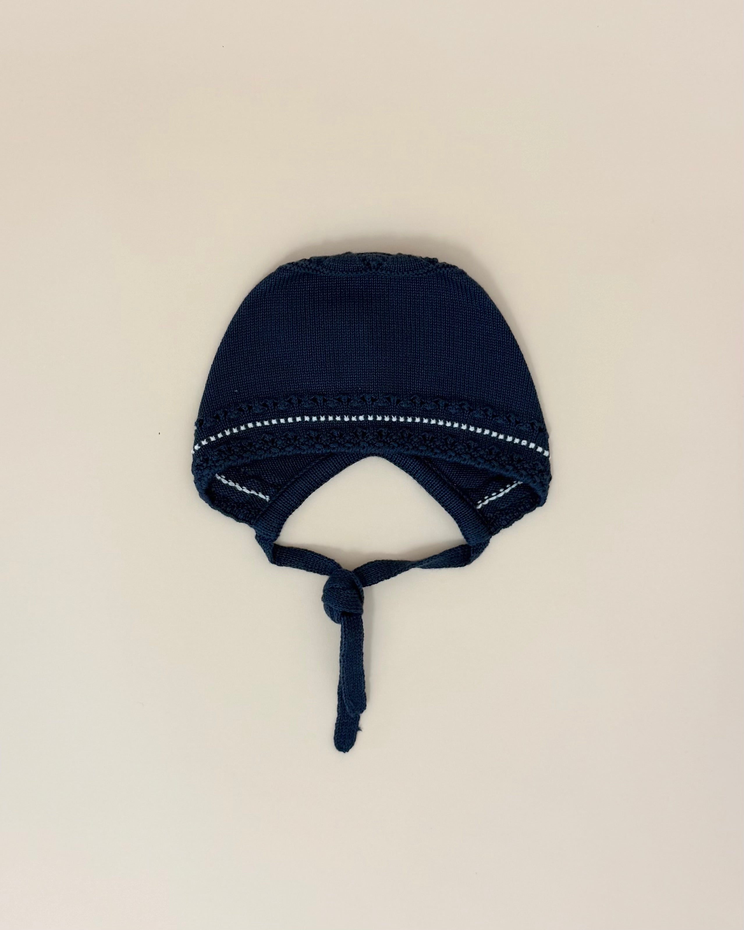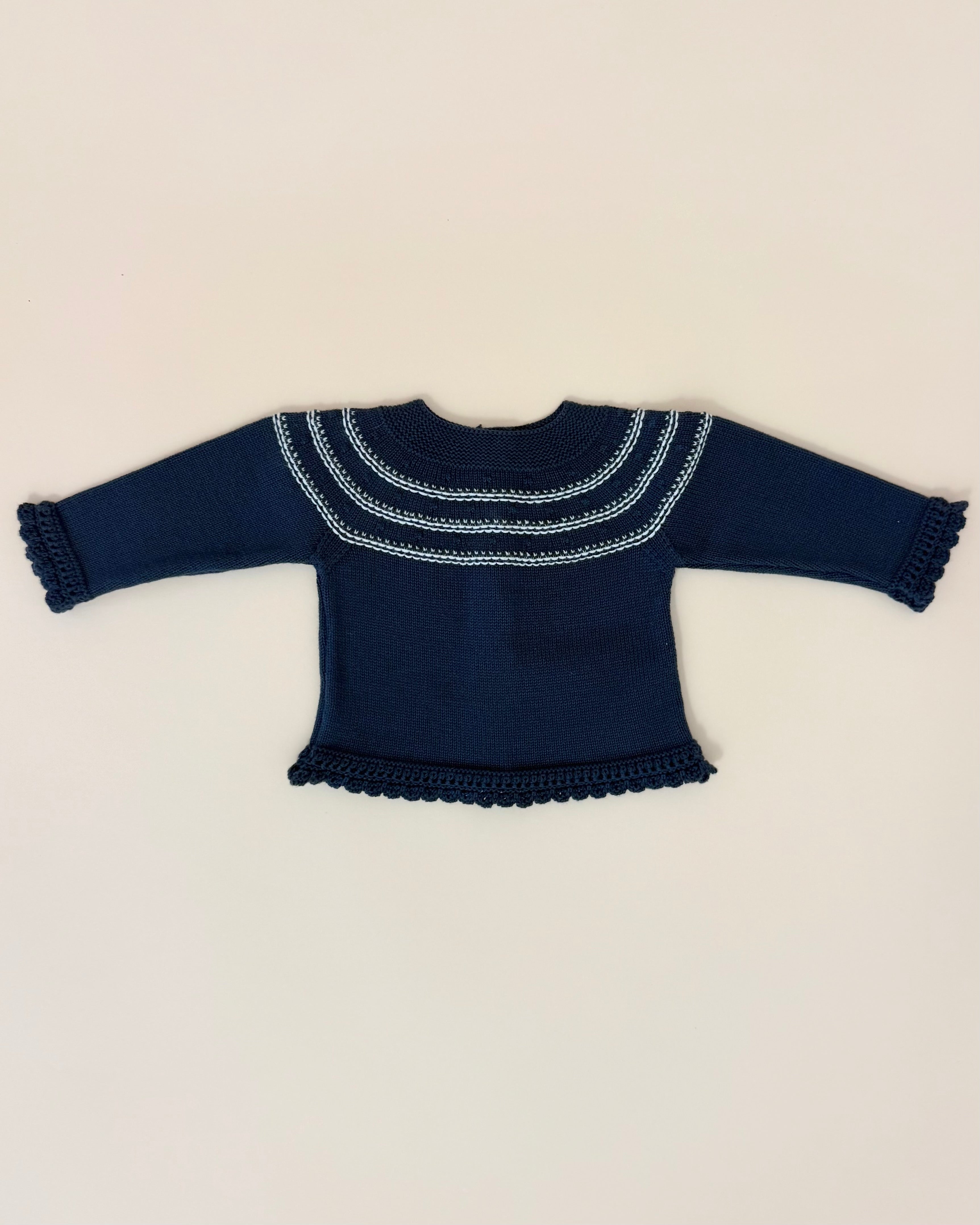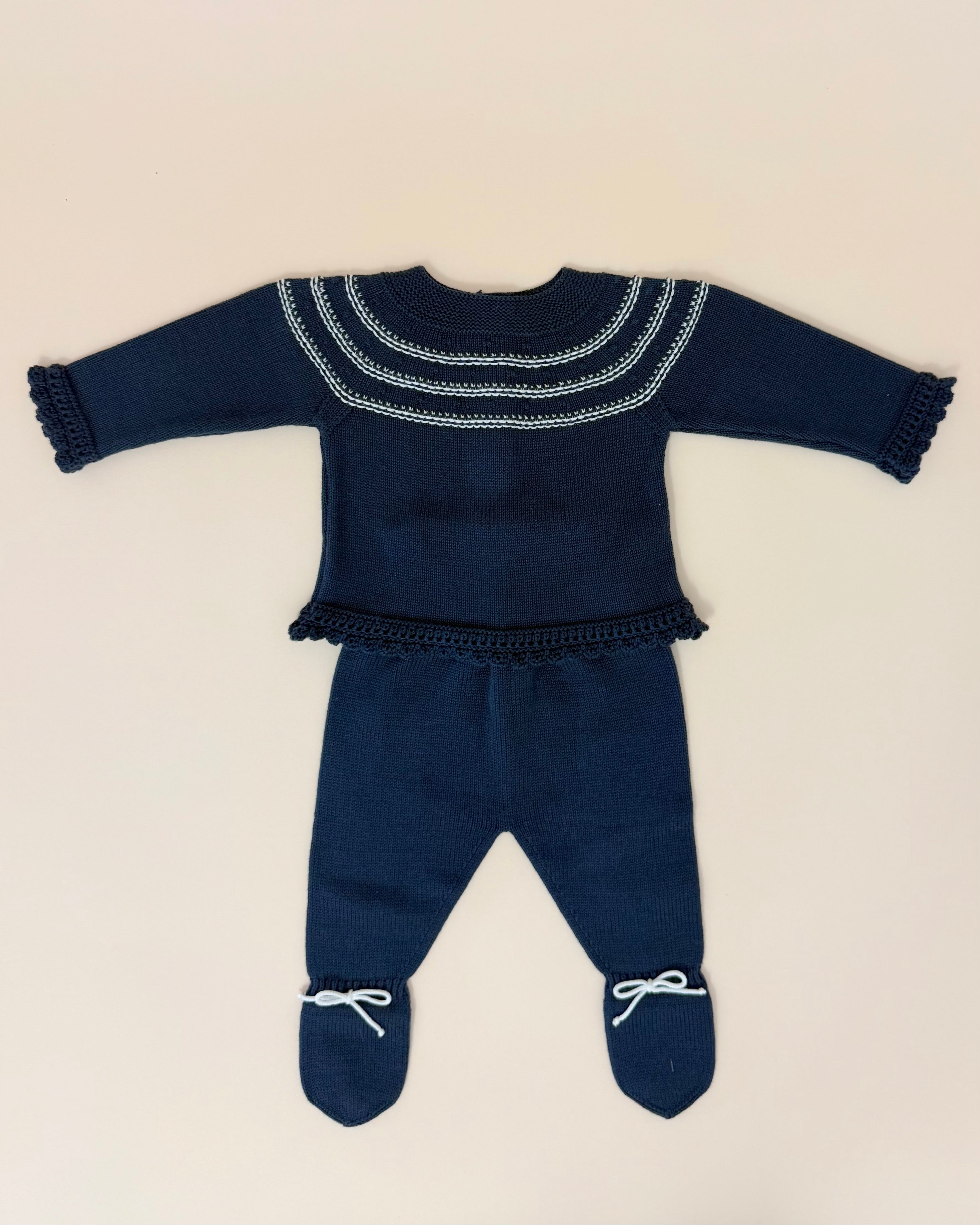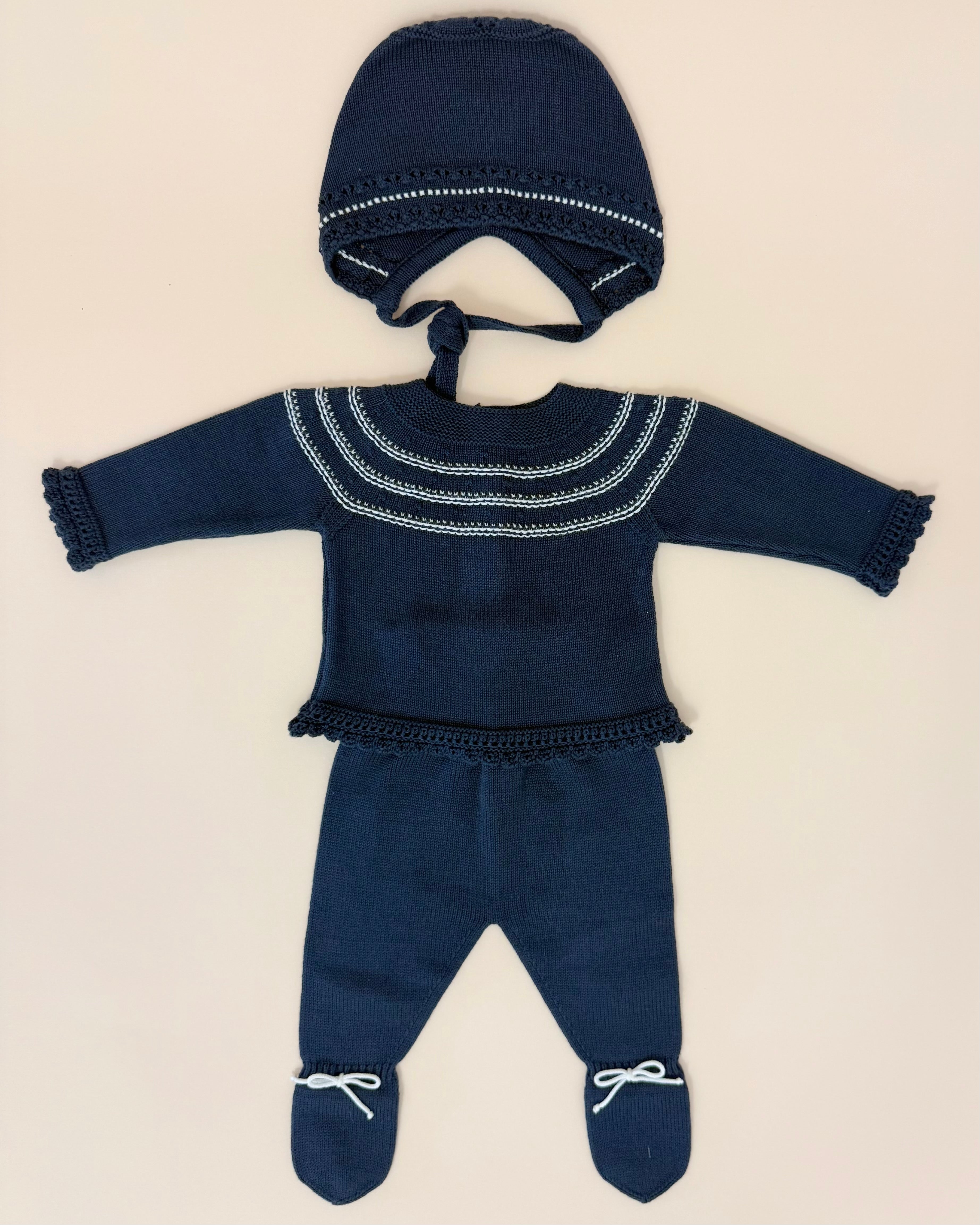 Handcrafted in Spain with exceptional quality and attention to detail, the set includes a navy blue knitted top with delicate white detailing and back button closure, matching navy blue footed pants, and a coordinated bonnet for a polished and elegant look.